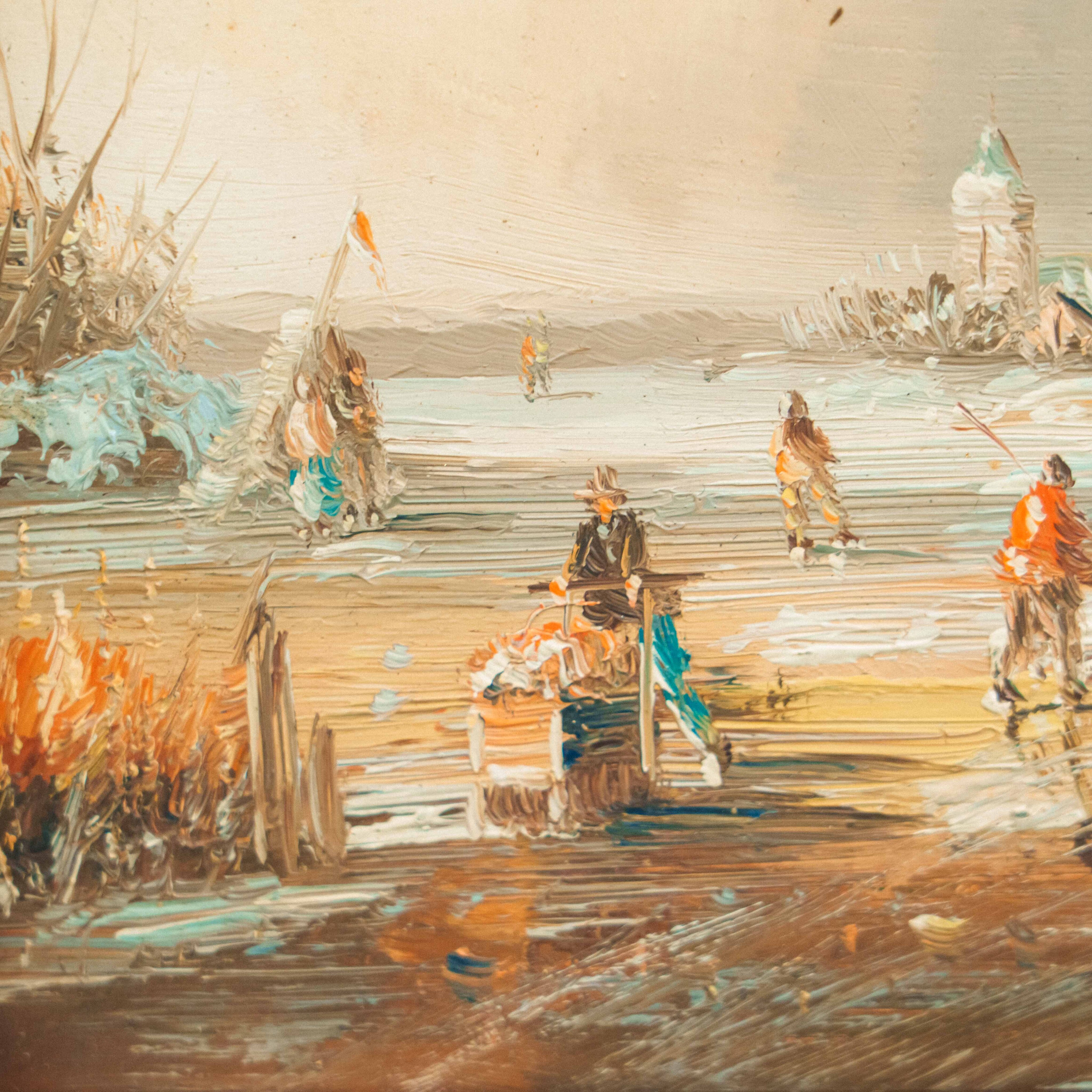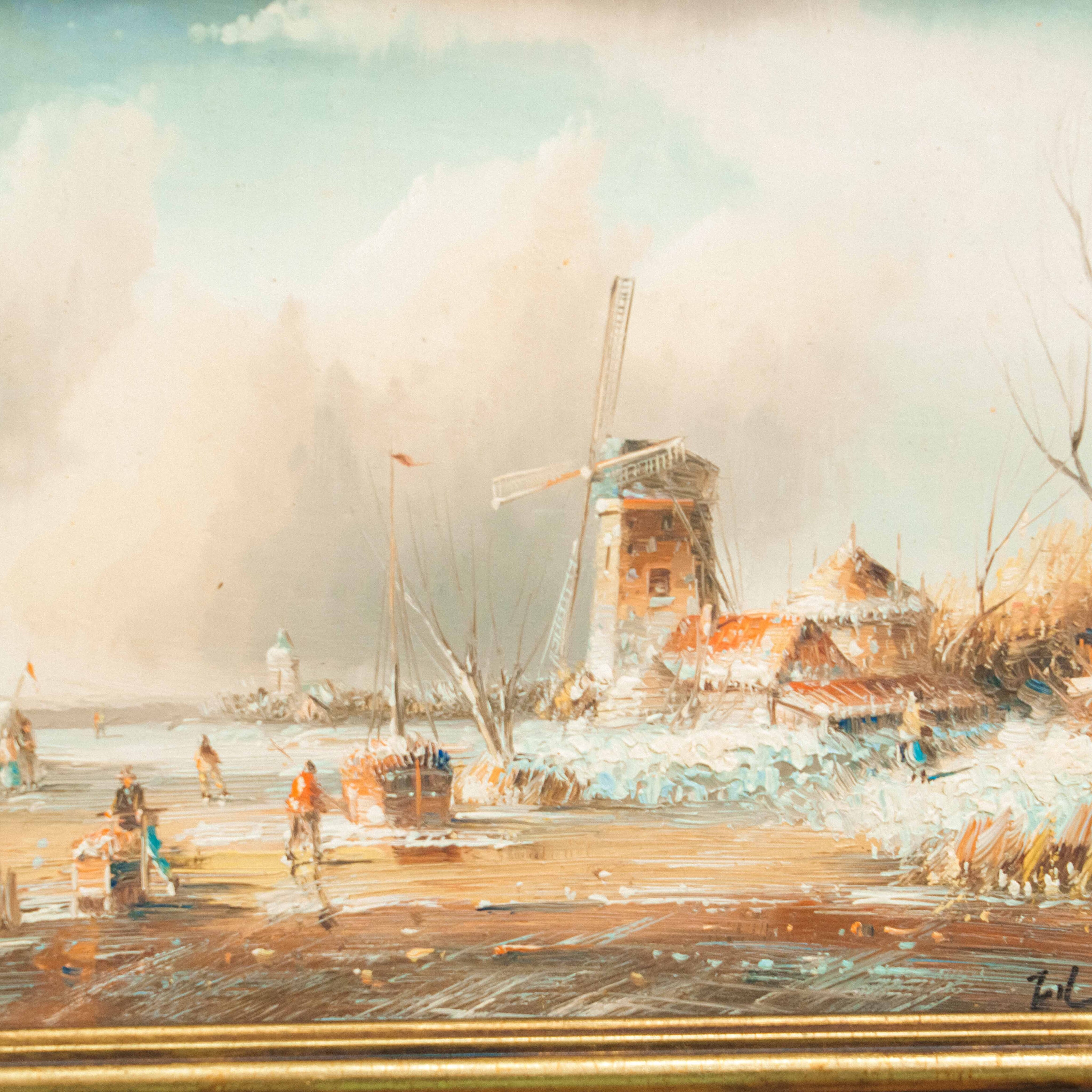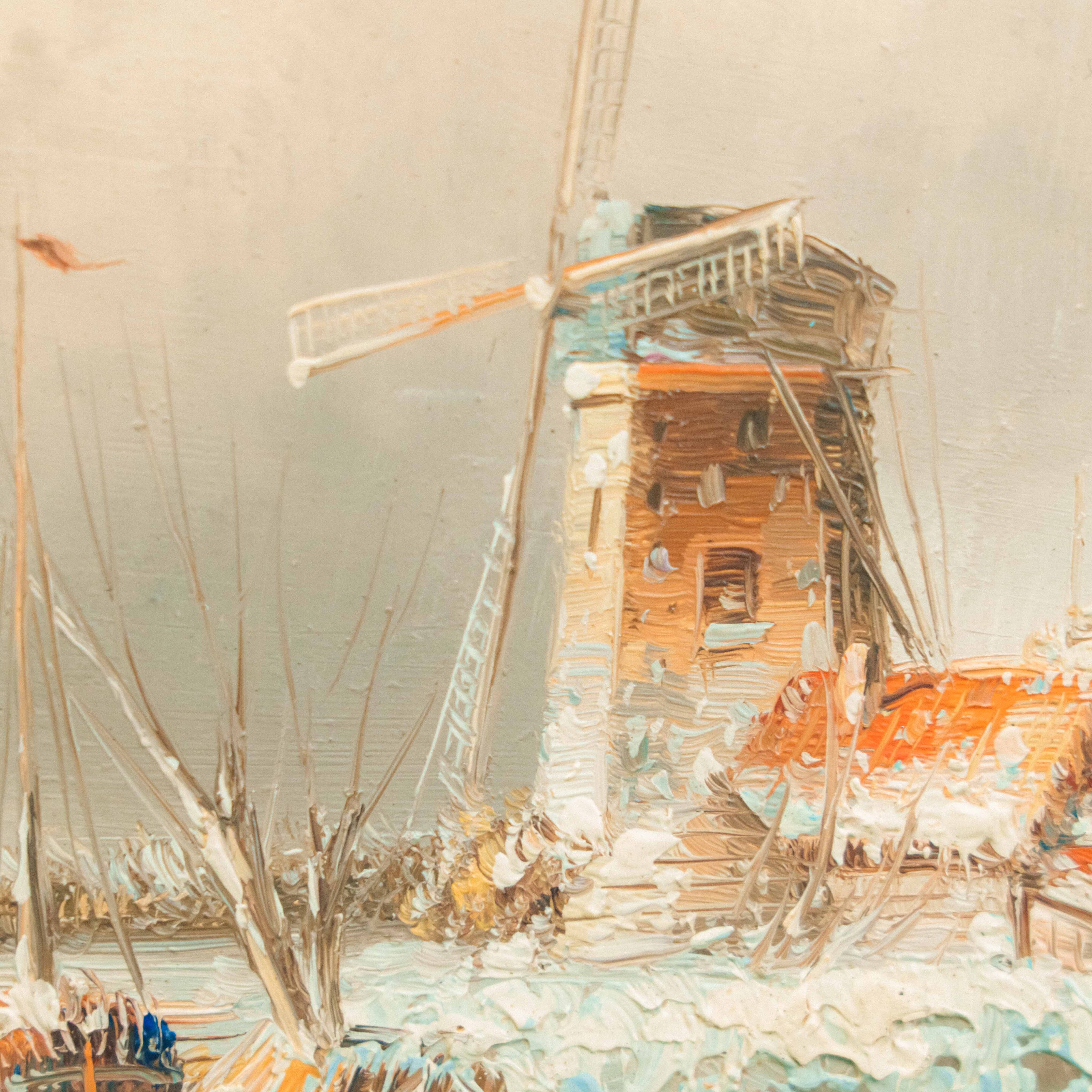 Живописный пейзаж, вдохновлённый классическими видами Голландии, с узнаваемым силуэтом ветряной мельницы и спокойной сельской жизнью у воды. Работа наполнена воздухом и светом: мягкое небо, отражения на влажной земле, фигуры людей и лодки создают ощущение размеренного ритма и уюта.