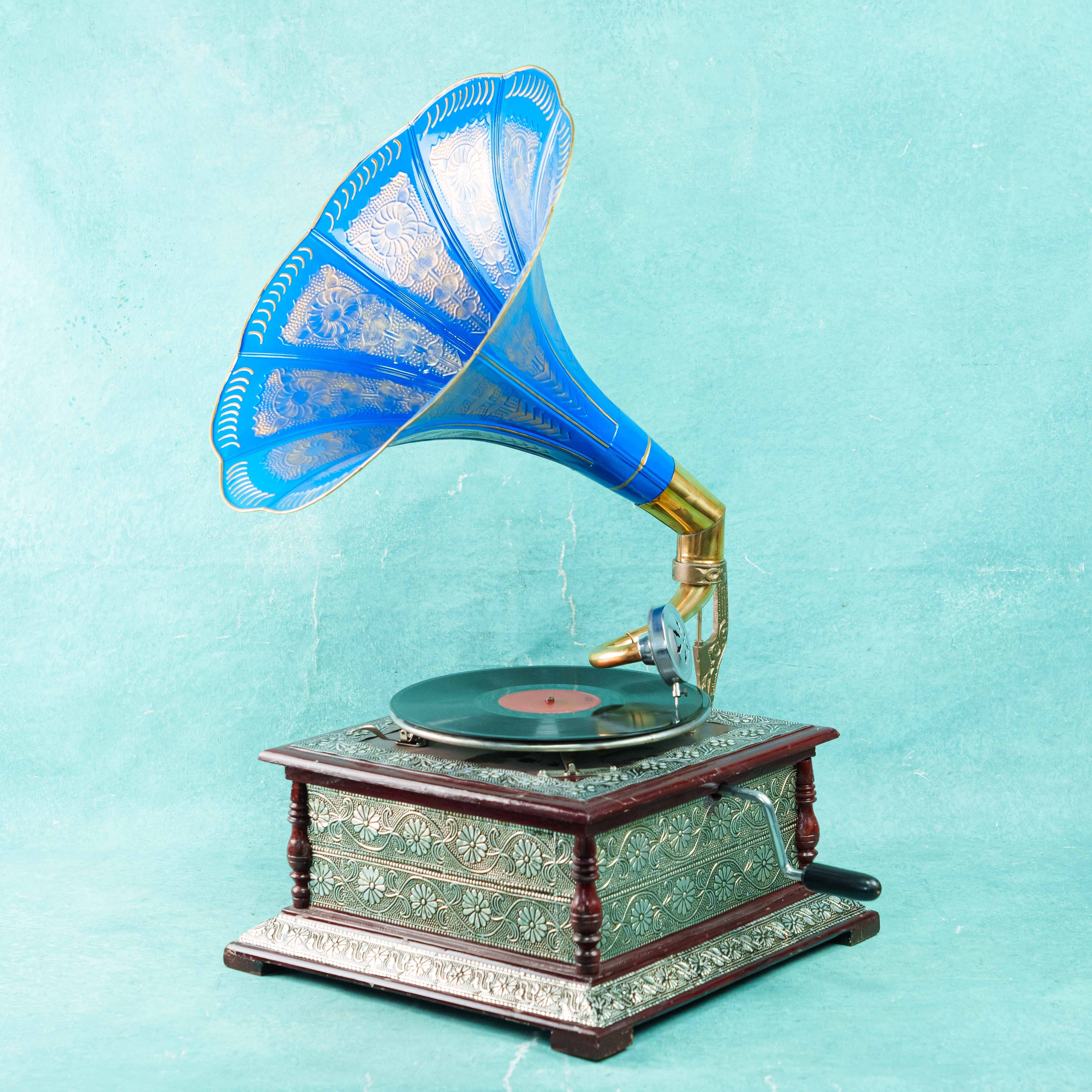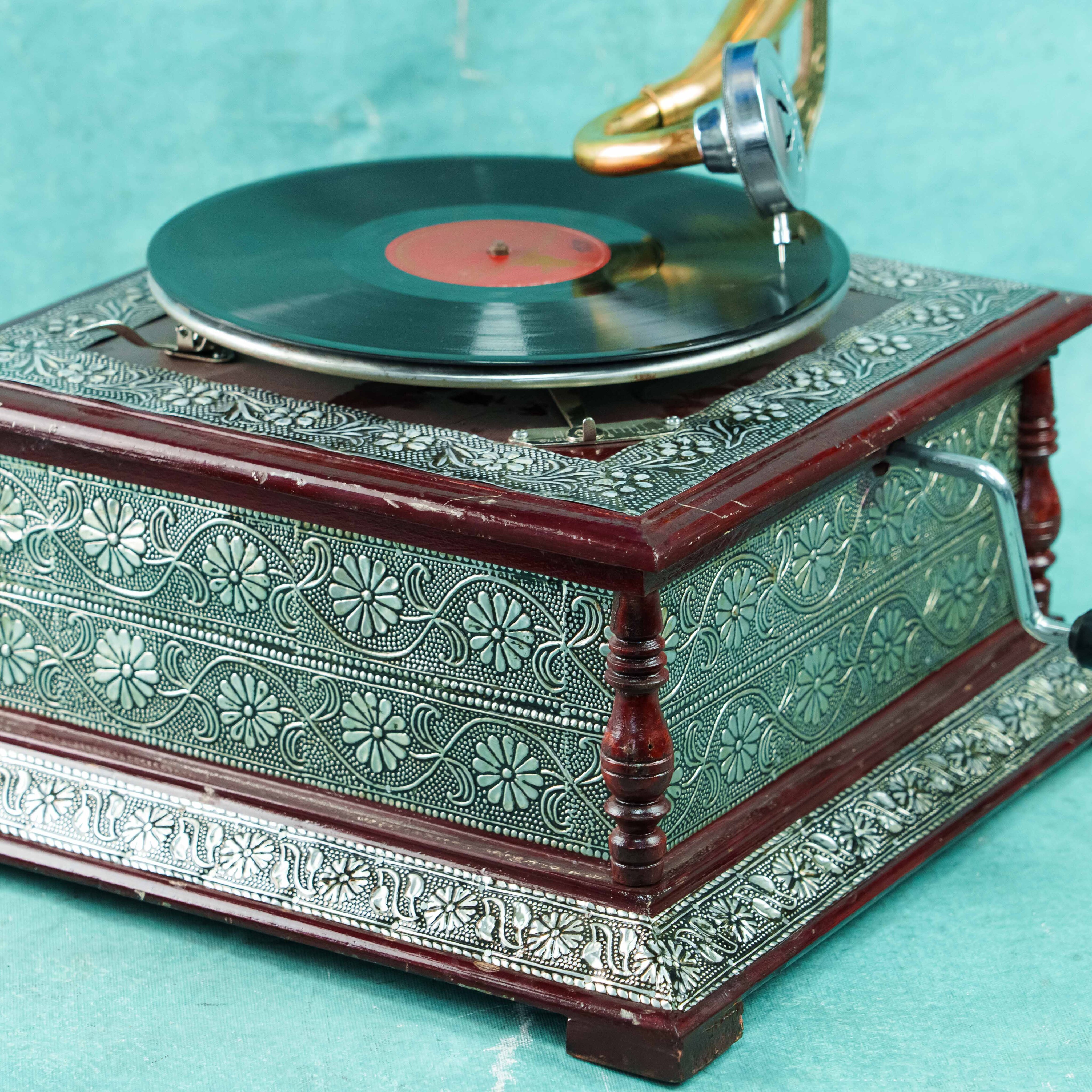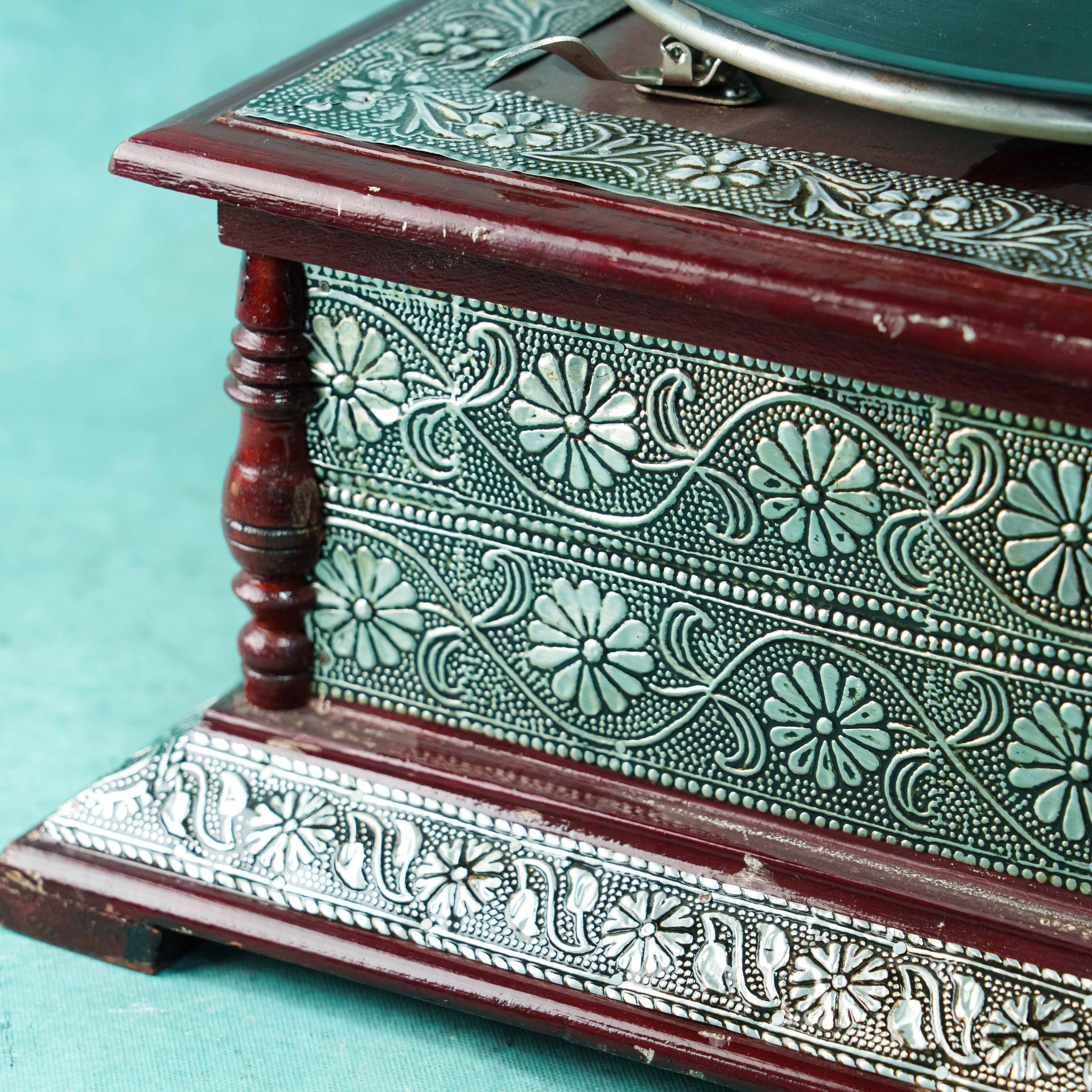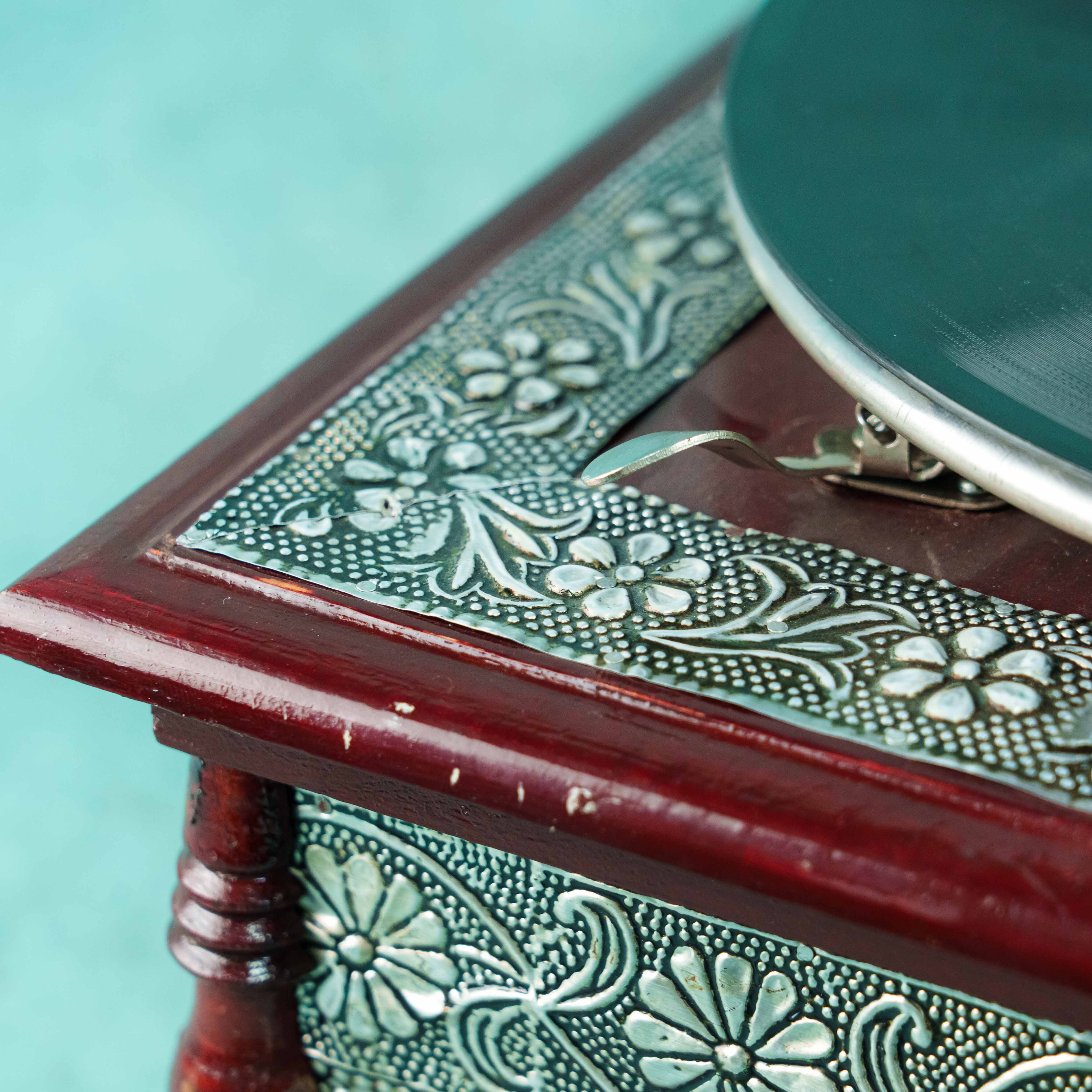 Основание граммофона представляет собой квадратный корпус из темного полированного дерева, грани которого богато украшены накладными панелями из серебристого металла с детальной цветочной чеканкой и растительными орнаментами. На правой боковой стороне корпуса расположена классическая изогнутая металлическая ручка с черной рукояткой, предназначенная для ручного завода пружинного механизма. Верхняя часть деревянного короба служит платформой для черного вращающегося диска, на который устанавливается грампластинка.