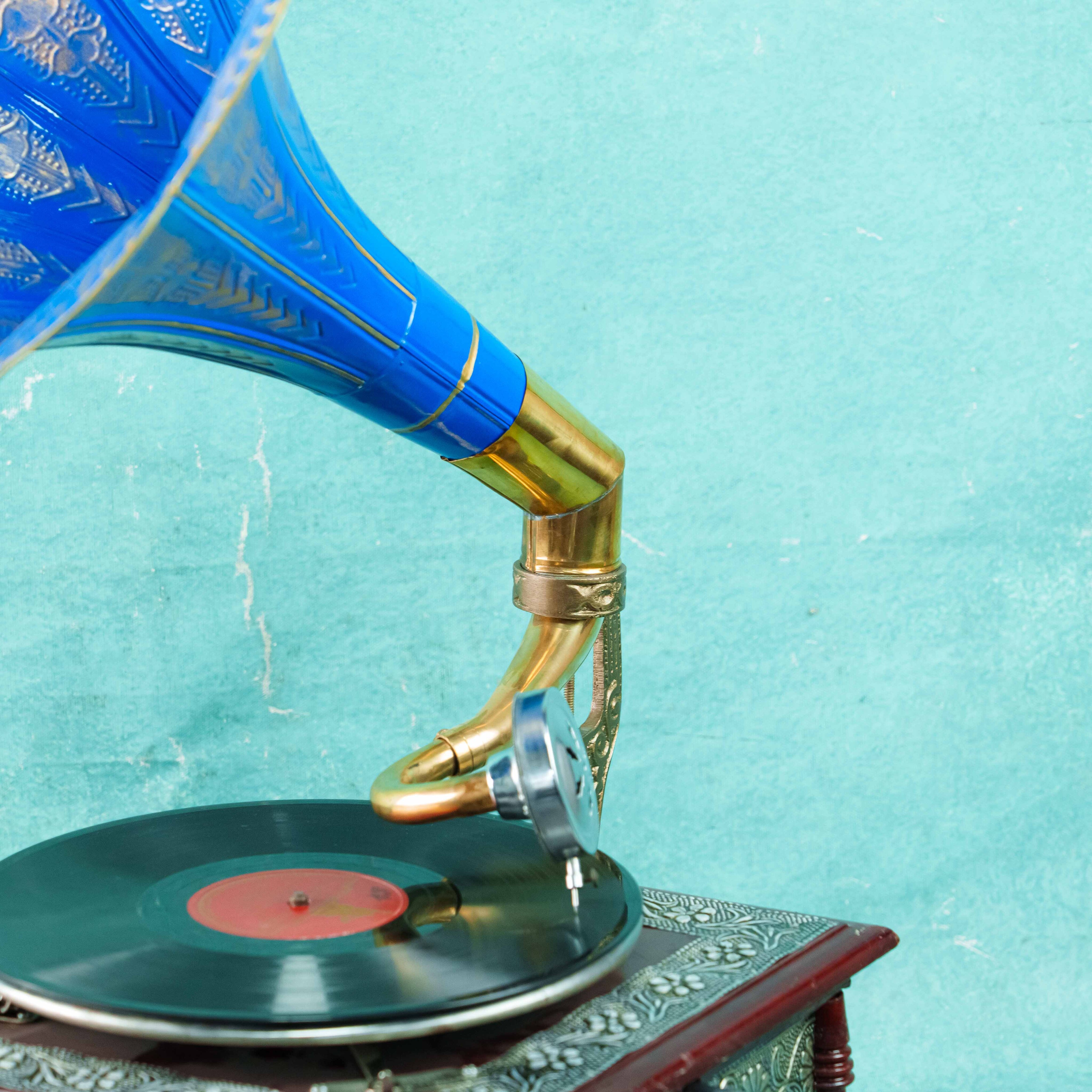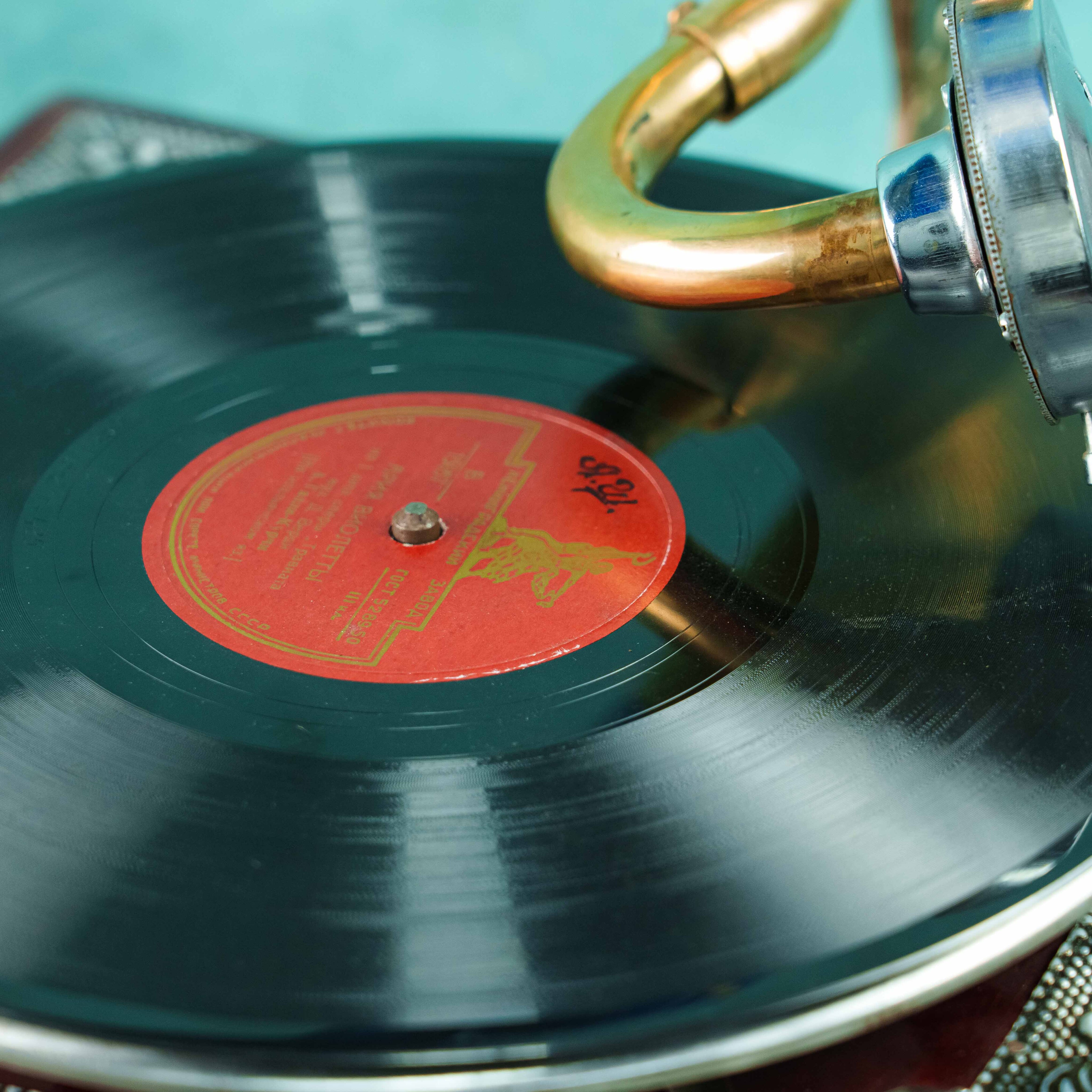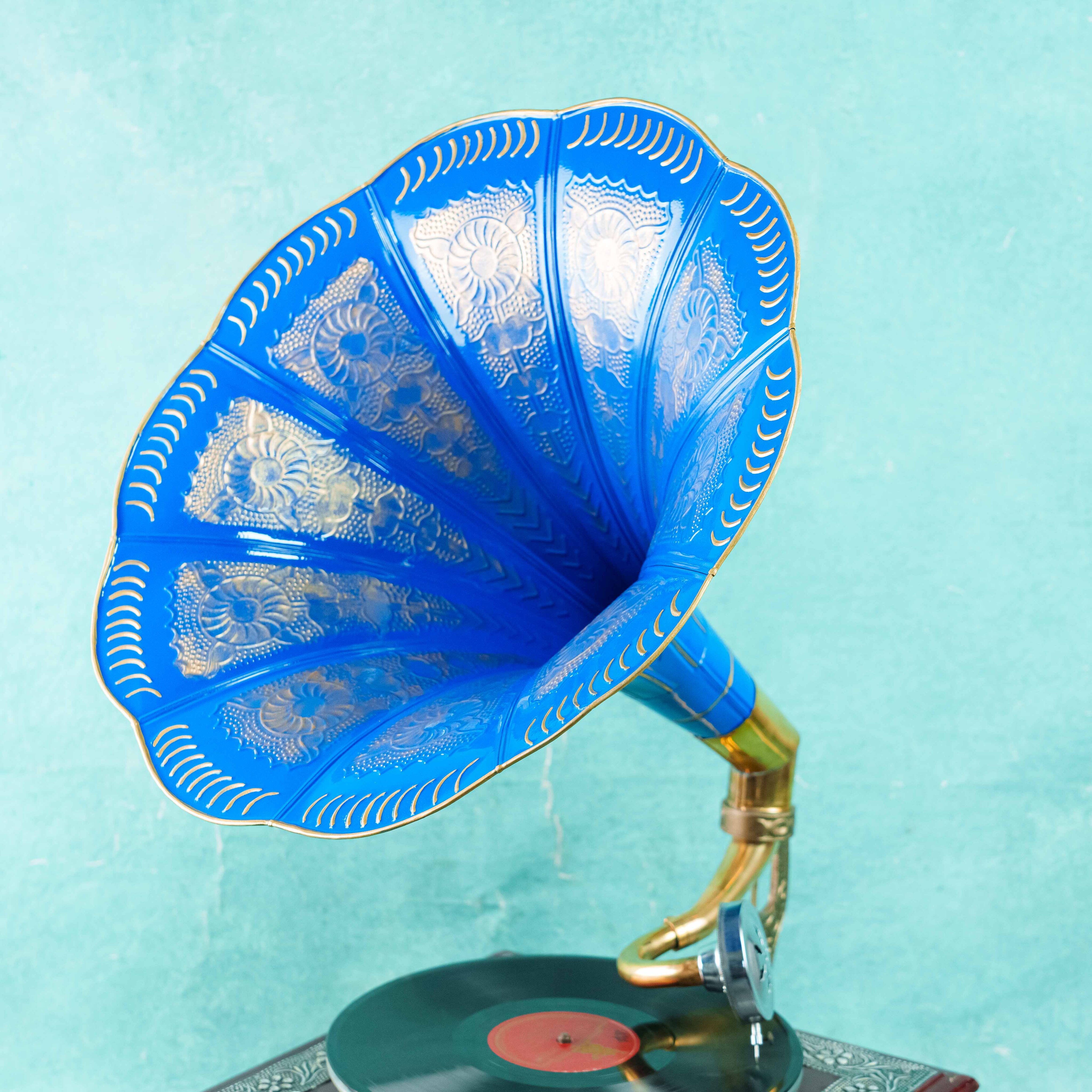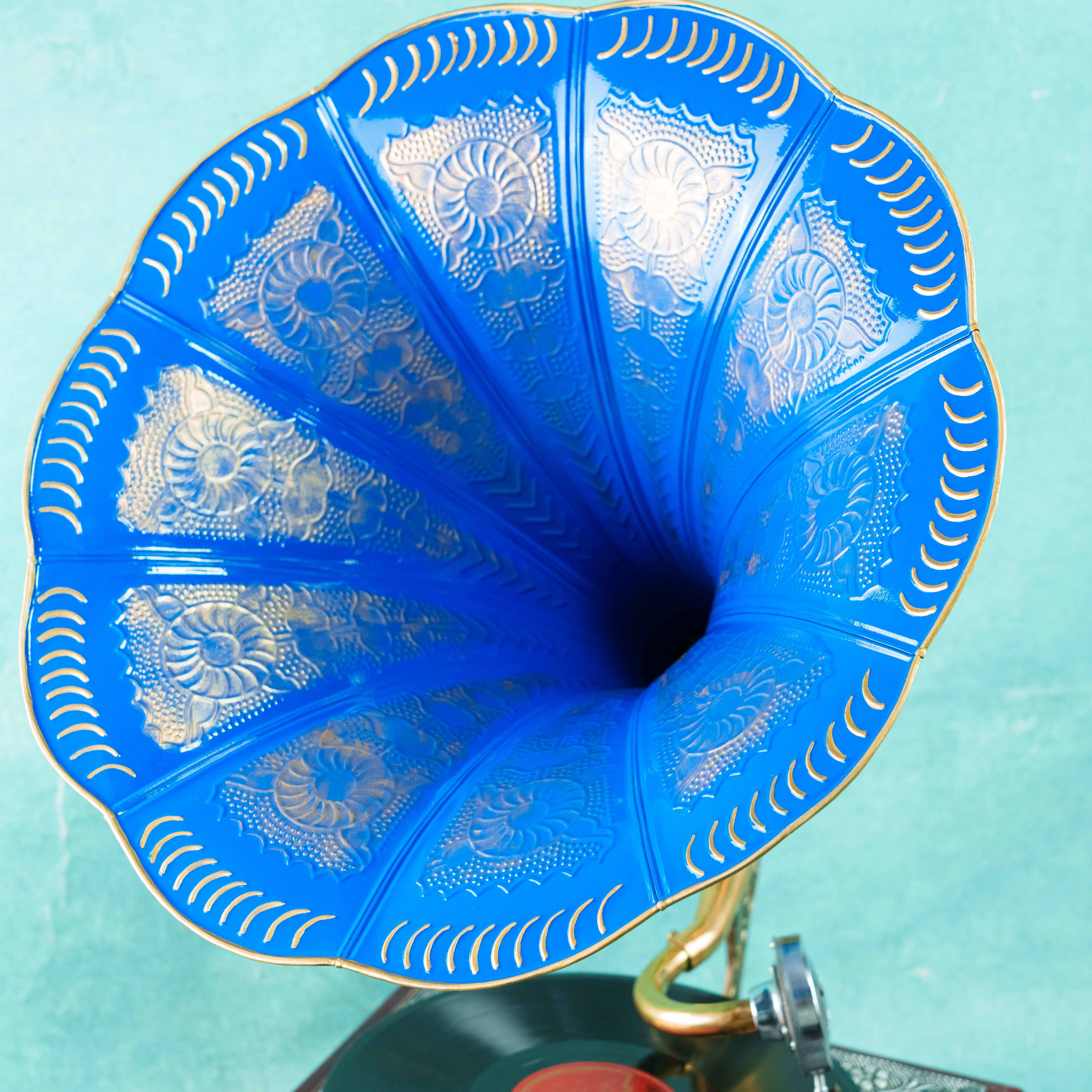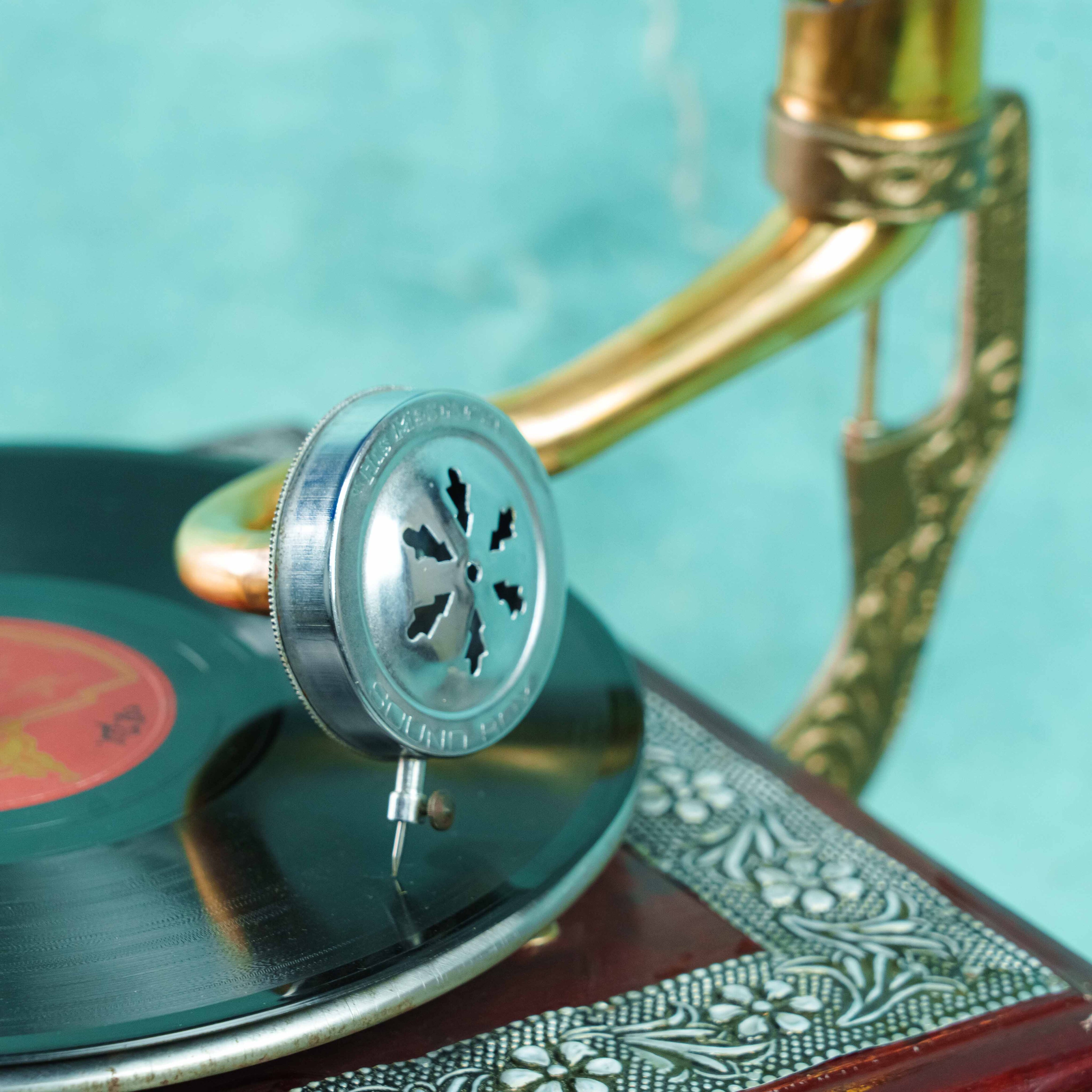 Основание граммофона представляет собой квадратный корпус из темного полированного дерева, грани которого богато украшены накладными панелями из серебристого металла с детальной цветочной чеканкой и растительными орнаментами. На правой боковой стороне корпуса расположена классическая изогнутая металлическая ручка с черной рукояткой, предназначенная для ручного завода пружинного механизма. Верхняя часть деревянного короба служит платформой для черного вращающегося диска, на который устанавливается грампластинка.