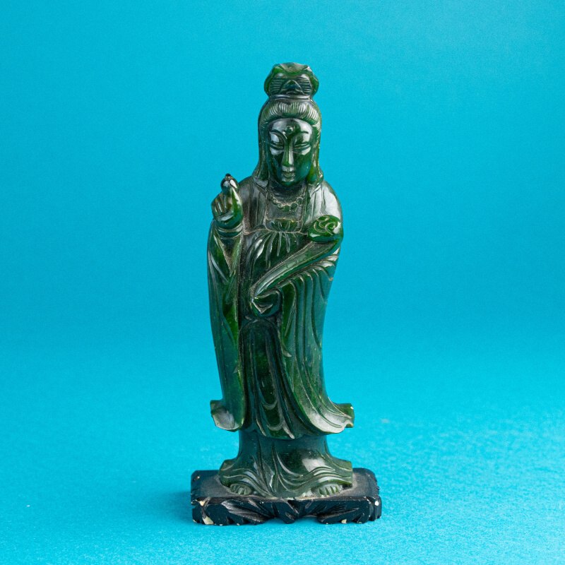 Гуаньинь — «слышащая все в мире». Женское божество, спасающее от всевозможных бедствий, помогающее всем, кто к ней обращается, особенно роженицам и беременным женщинам. Когда кому-то нужна помощь, у нее появляются тысяча рук, а на каждой ладони по глазу, чтобы видеть всех нуждающихся в ее поддержке. Часто ее изображают со священной книгой, кувшином, посохом или веревкой — ведь любой из этих предметов может выручить кого — то из беды. Покровительствует детям и оберегает их от болезней.