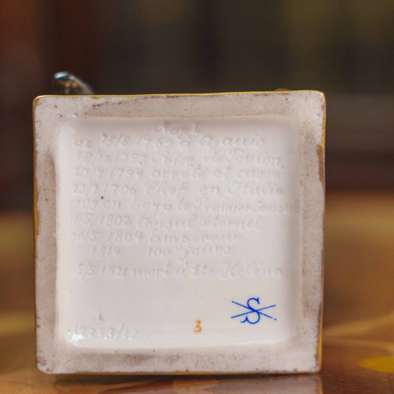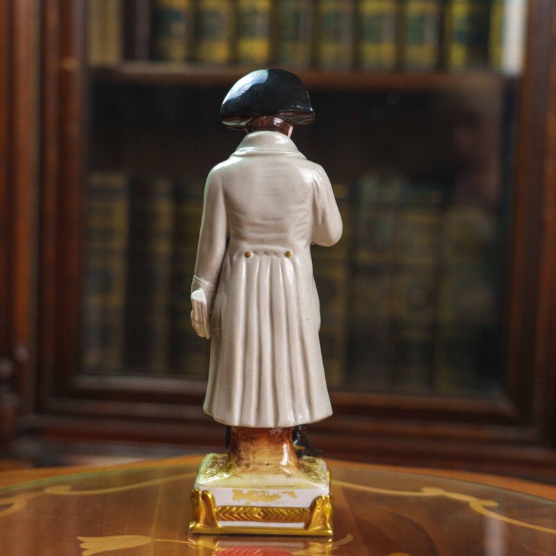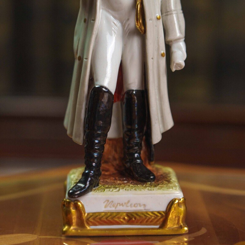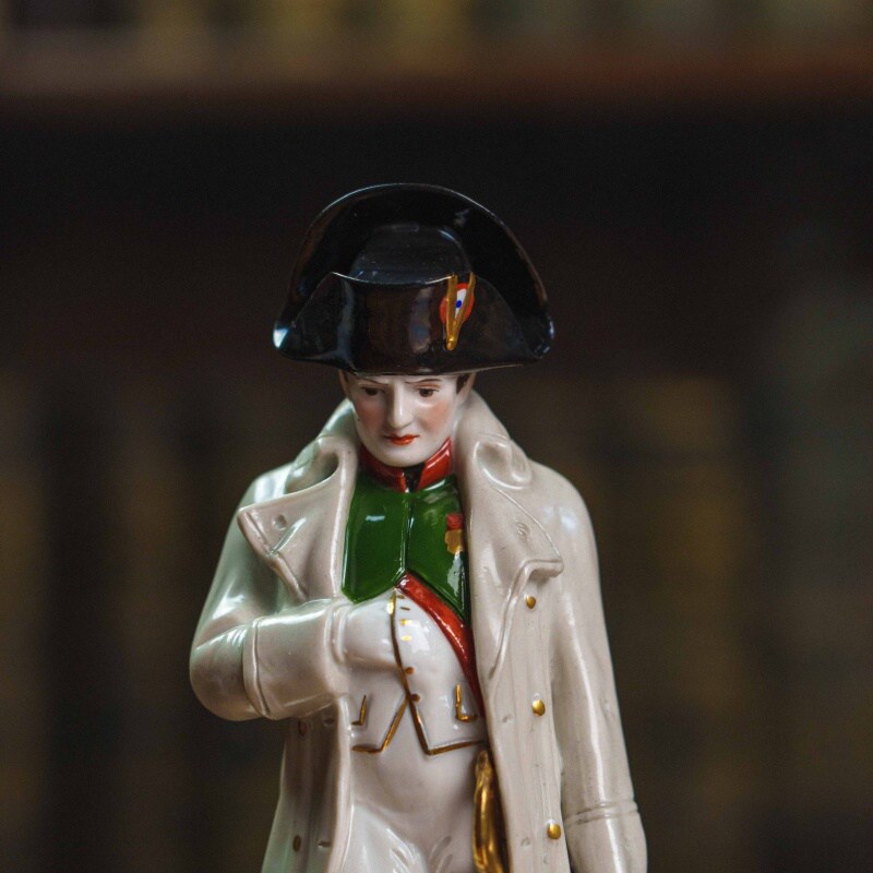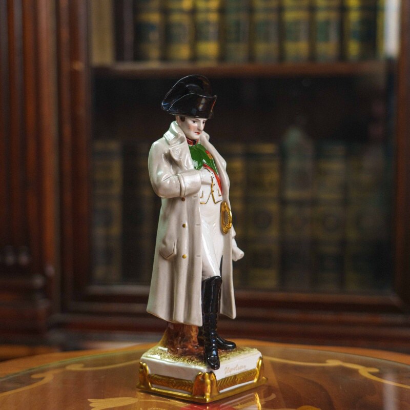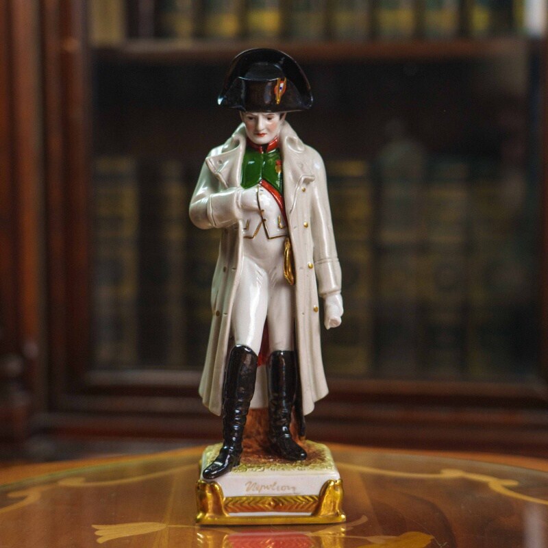 Элегантная фарфоровая статуэтка изображает императора Наполеона Бонапарта в его узнаваемой позе — с рукой, заложенной за лацкан мундира. Мастер искусно передал характерный образ полководца: чёткие черты лица, задумчивый, слегка сосредоточенный взгляд и уверенная осанка подчеркивают его стратегический ум и властный темперамент. Фигура выполнена в традиционном парадном стиле, типичном для европейской декоративной фарфоровой пластики второй половины ХХ века. Наполеон изображён в длинном светлом плаще поверх парадного мундира: зелёный жилет, белые бриджи, высокий ворот и красная лента ордена выделяются на фоне спокойных оттенков одежды. Детали костюма подчёркнуты тонкой золотой росписью, которая придаёт статуэтке торжественность и коллекционную выразительность.