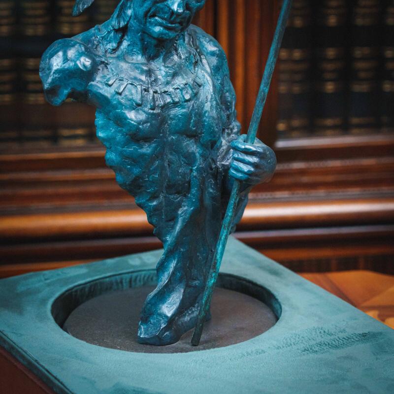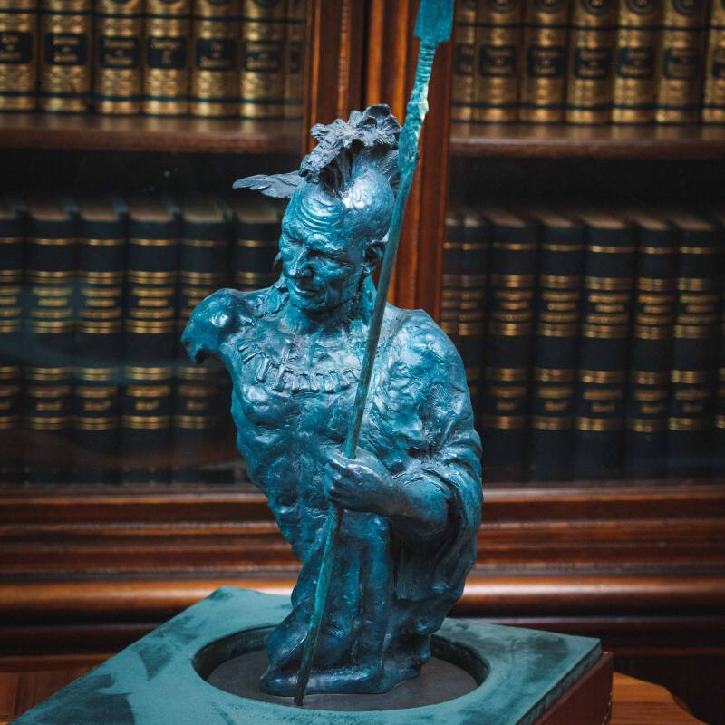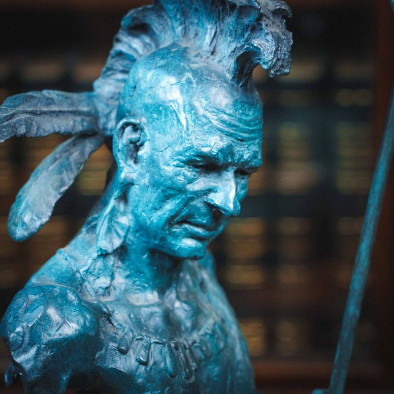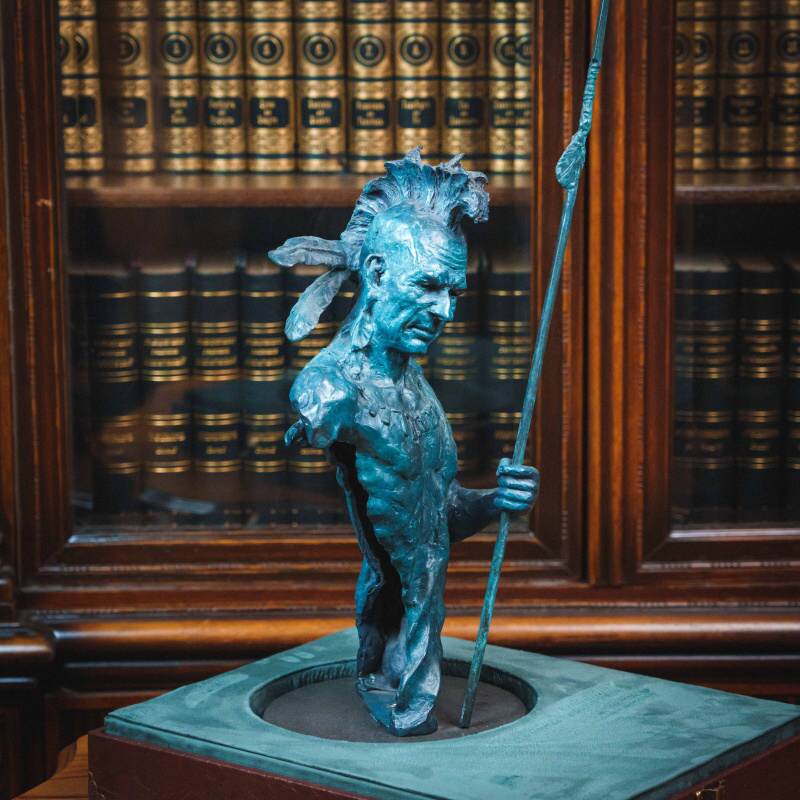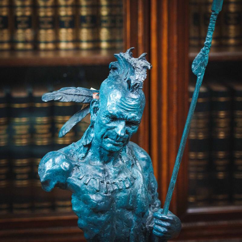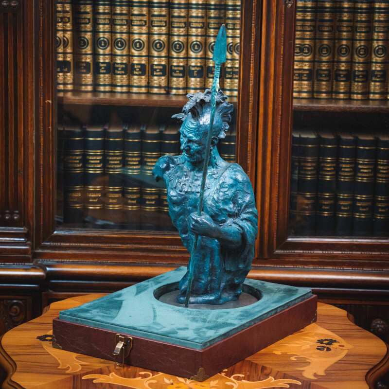 Композиция построена как динамичный бюст, полный внутренней энергией. Лицо героя передано с напряженной сосредоточенностью, в котором читаются сила характера и волевая собранность. Образ дополнен характерными деталями — перьями в головном уборе, ожерельем и копьем, что придает композиции этнографический оттенок, оставаясь при этом обобщенной художественной интерпретацией. Патина насыщенного зелено-бирюзового оттенка подчеркивает рельеф и глубину пластики, создавая выразительную игру света на поверхности бронзы.