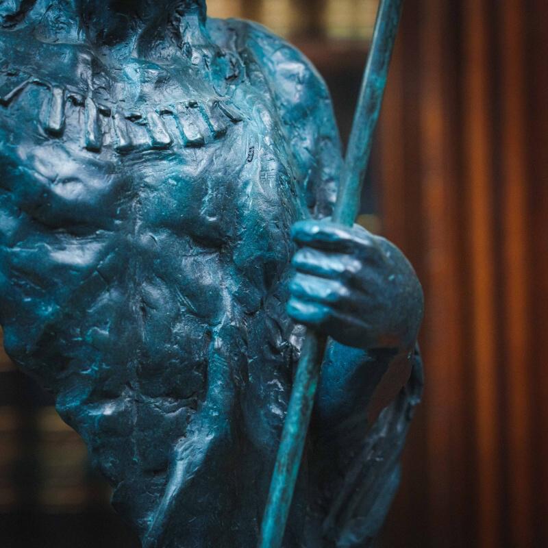 Выразительная бронзовая скульптура, изображающая фигуру воина с копьем.