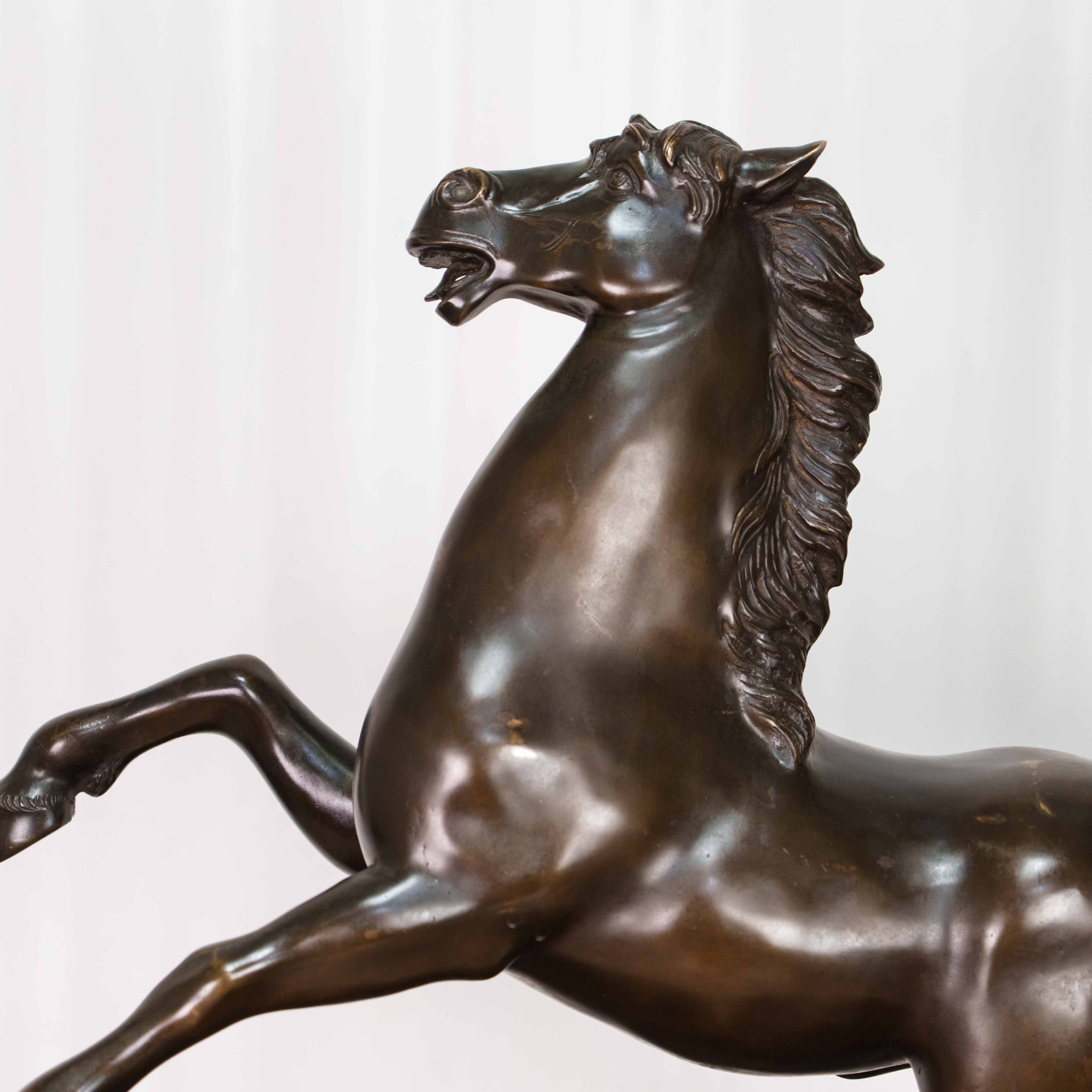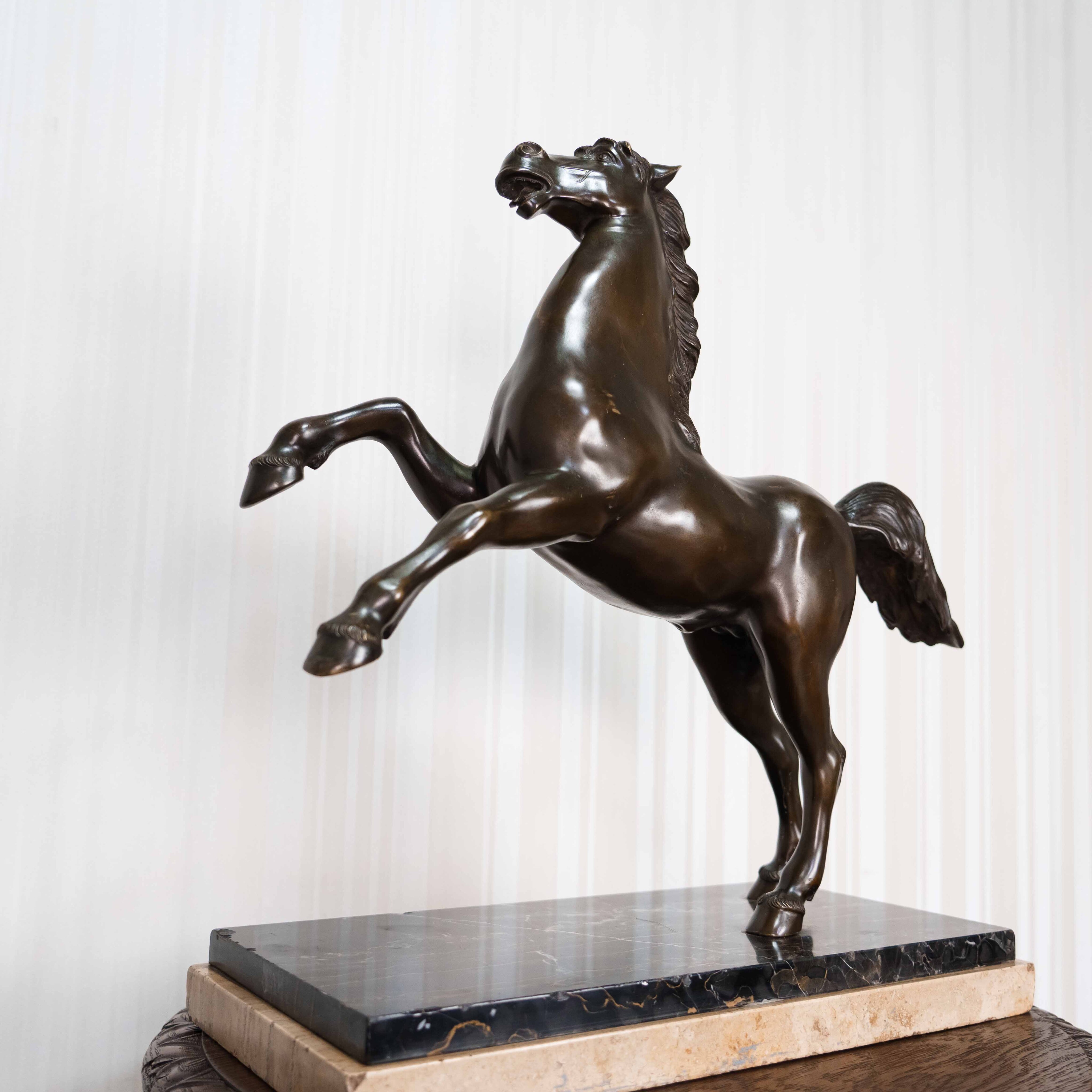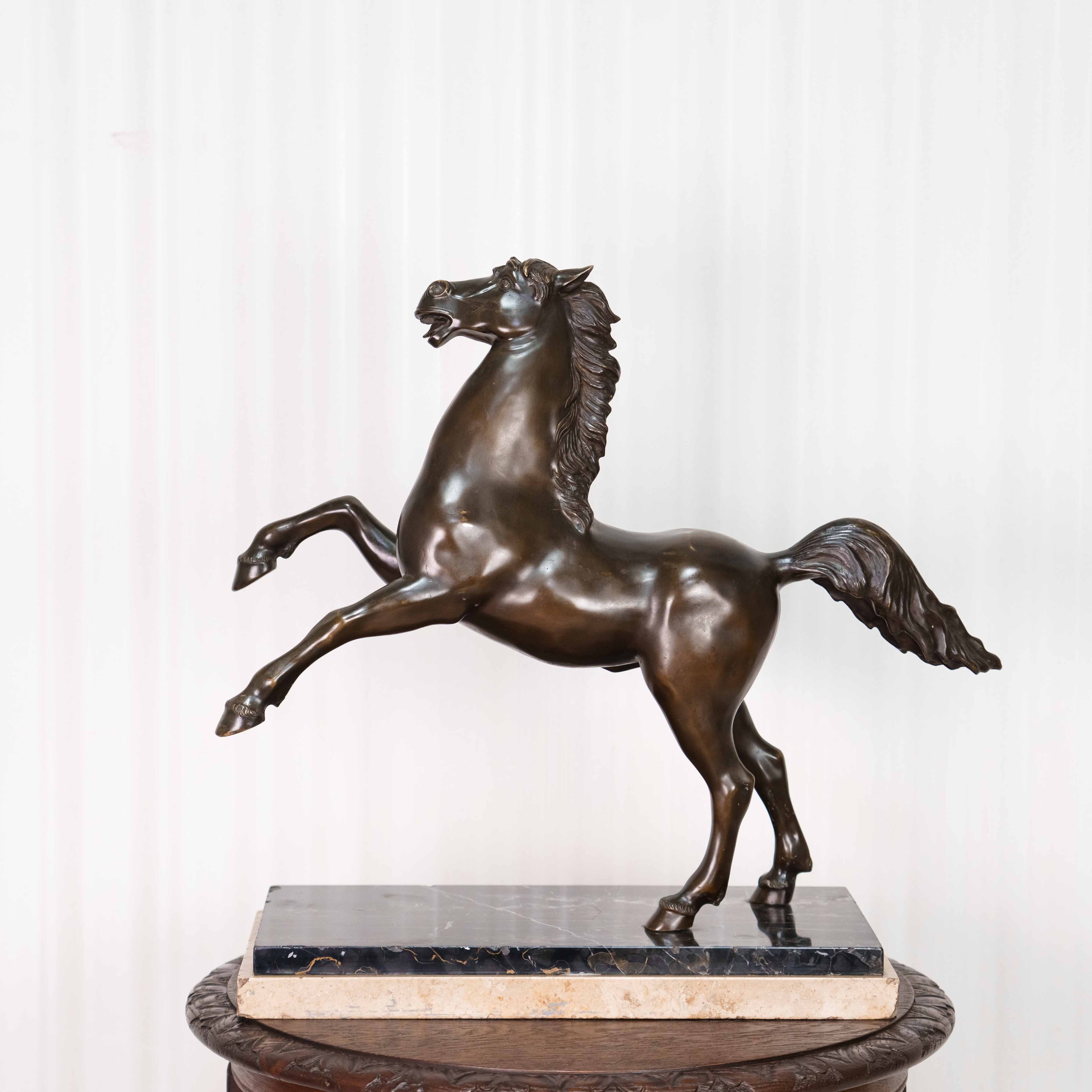 Бронзовая скульптура вставшего на дыбы коня воплощает образ мощи, свободы и неукротимой жизненной энергии. Фигура изображена в динамичном моменте: конь высоко поднимается на задние ноги, вытягивая корпус и напряжённо изогнув шею, что создаёт ощущение движения, силы и внутреннего импульса. Пластика тела подчёркивает развитую мускулатуру, а тщательно проработанная грива и хвост усиливают эффект живости и натуралистичности. В художественной и символической традиции конь олицетворяет силу духа, стремление к свободе, победу и благородство, а поза «на дыбах» трактуется как знак внутренней мощи, преодоления препятствий и лидерства. Такой образ издавна ассоциировался с воинской доблестью, успехом и защитой, поэтому подобные скульптуры нередко украшали интерьеры аристократических домов и кабинетов.