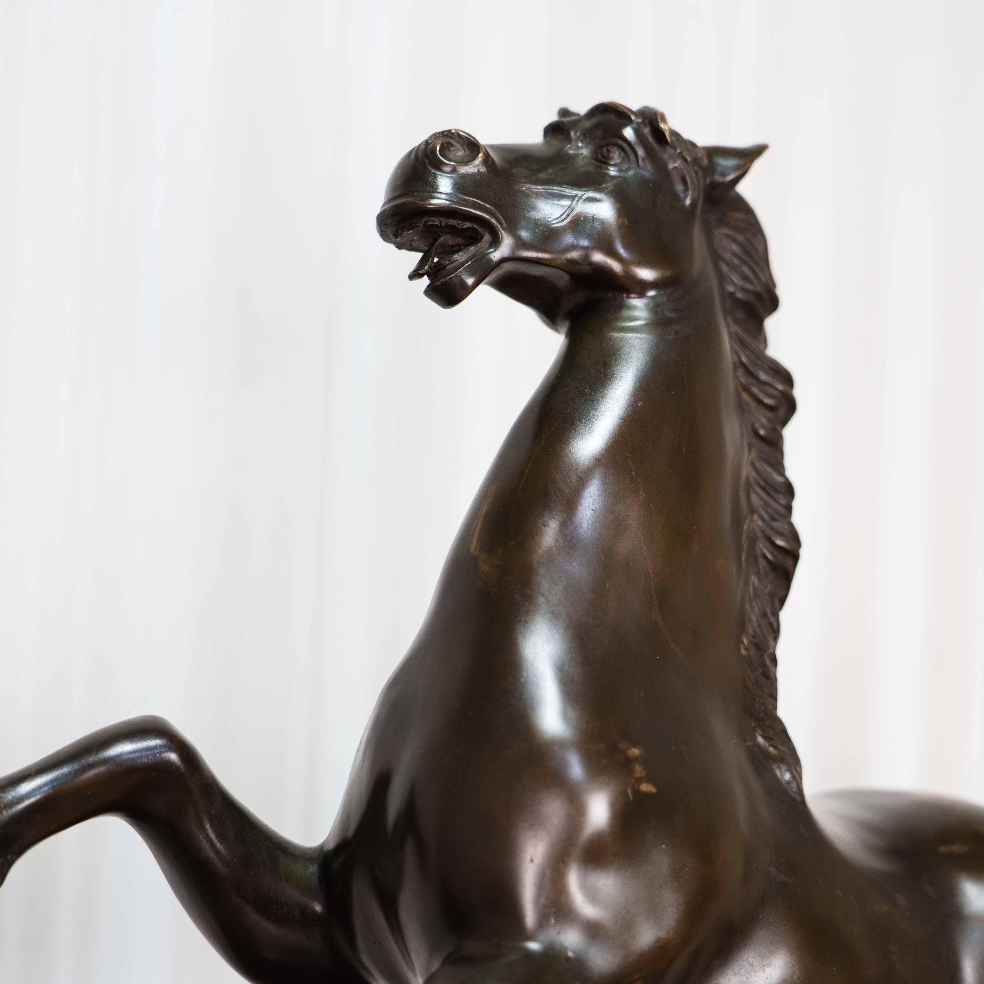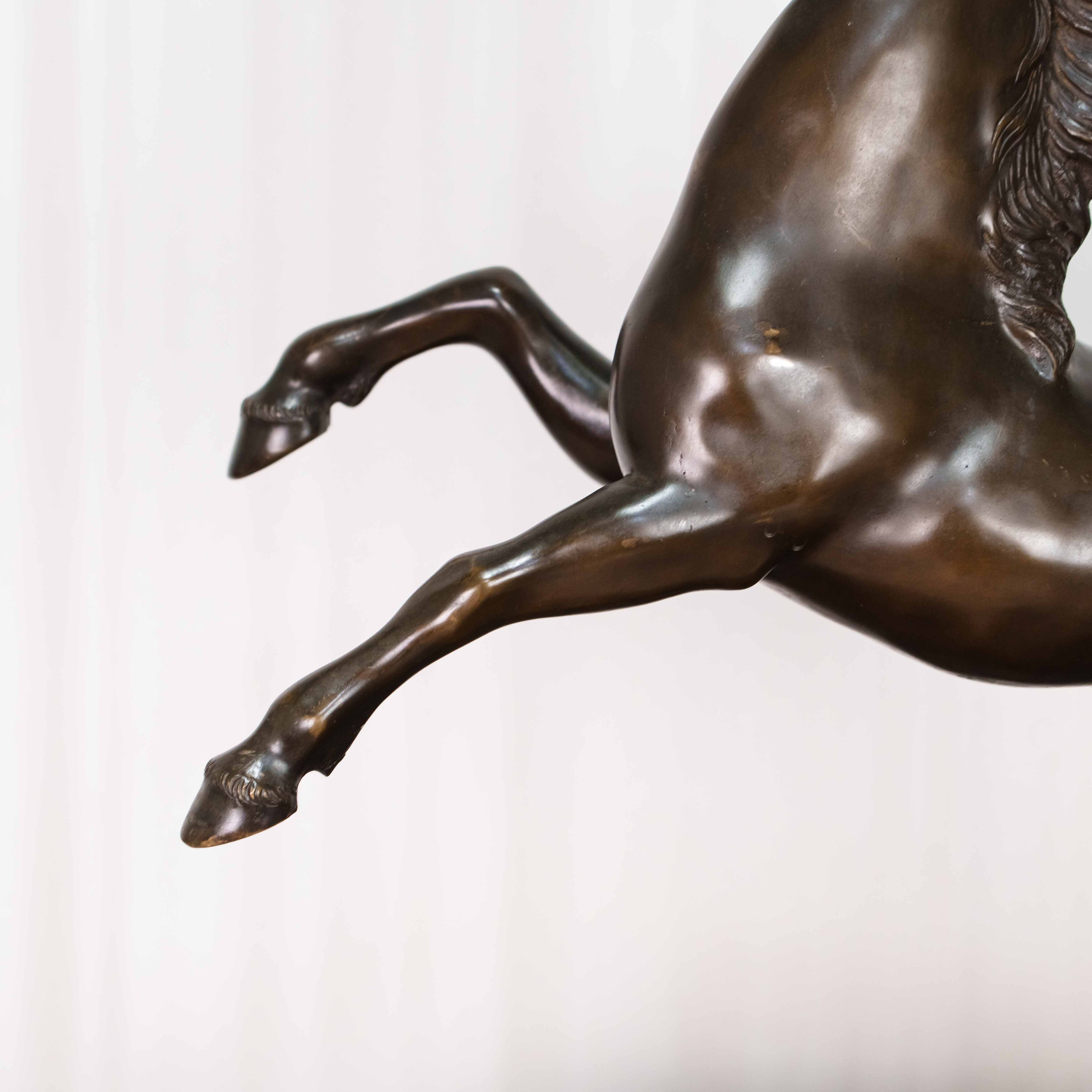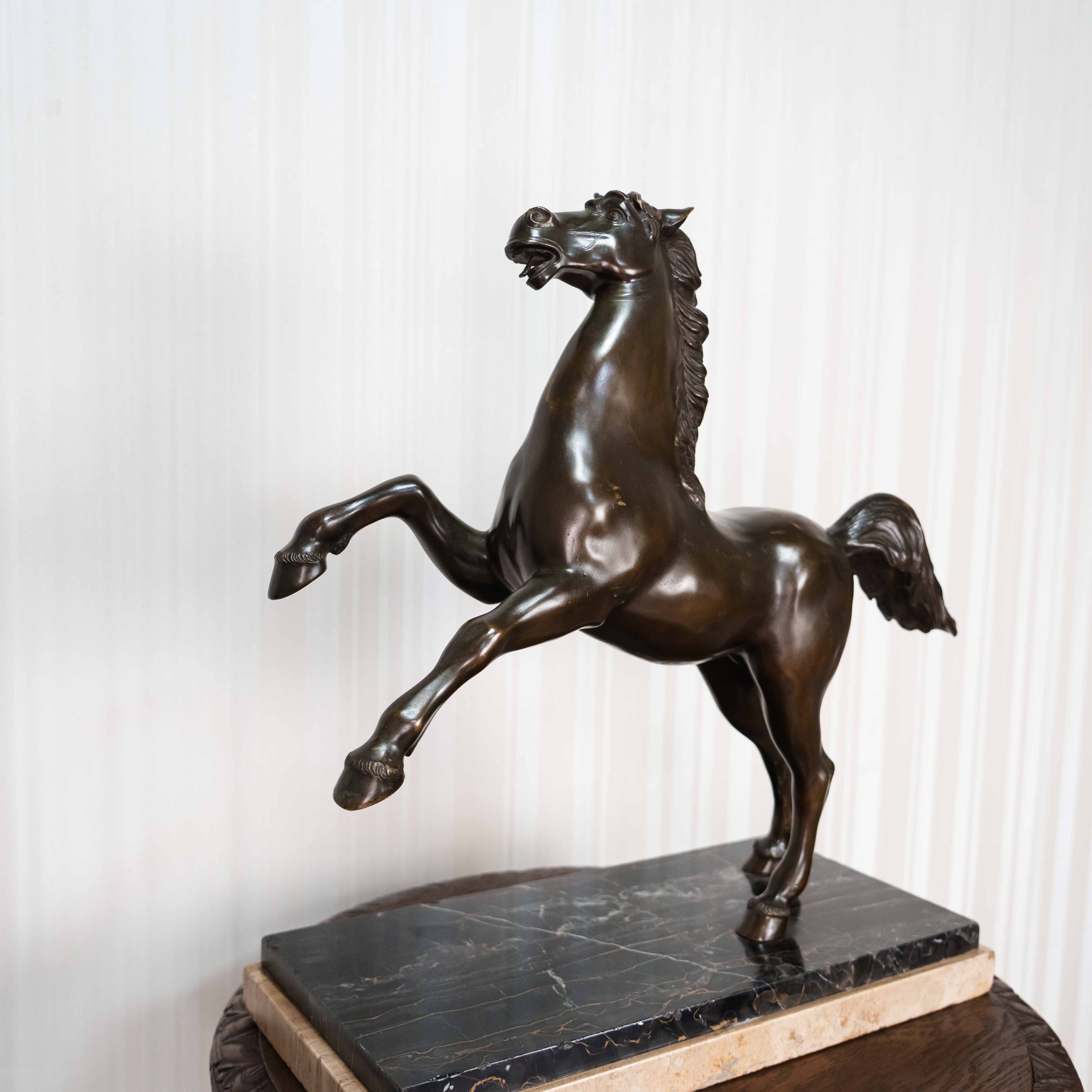Бронзовая скульптура вставшего на дыбы коня воплощает образ мощи, свободы и неукротимой жизненной энергии. Фигура изображена в динамичном моменте: конь высоко поднимается на задние ноги, вытягивая корпус и напряжённо изогнув шею, что создаёт ощущение движения, силы и внутреннего импульса. Пластика тела подчёркивает развитую мускулатуру, а тщательно проработанная грива и хвост усиливают эффект живости и натуралистичности. В художественной и символической традиции конь олицетворяет силу духа, стремление к свободе, победу и благородство, а поза «на дыбах» трактуется как знак внутренней мощи, преодоления препятствий и лидерства. Такой образ издавна ассоциировался с воинской доблестью, успехом и защитой, поэтому подобные скульптуры нередко украшали интерьеры аристократических домов и кабинетов.