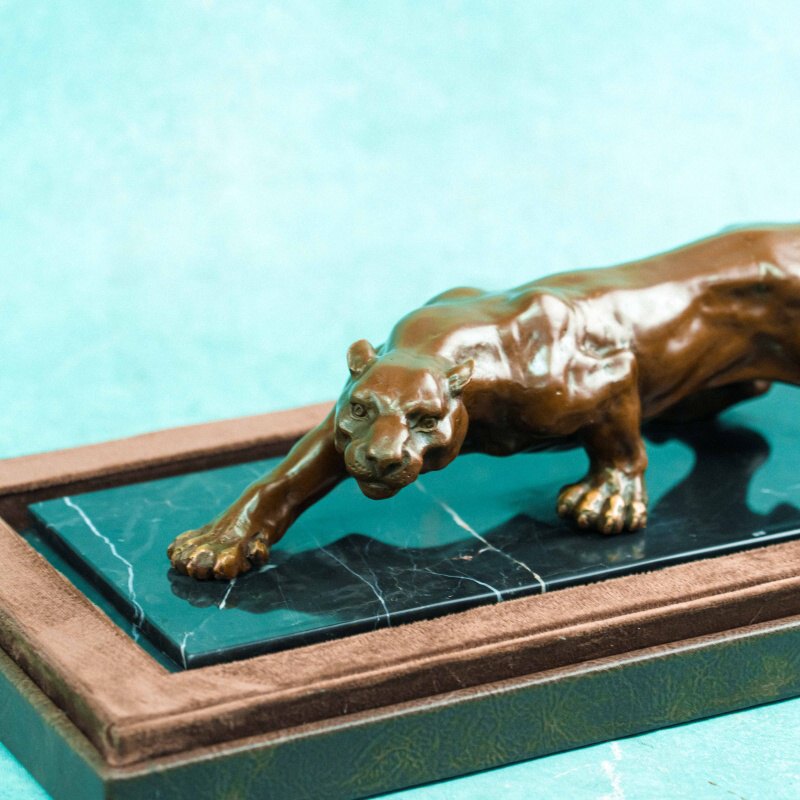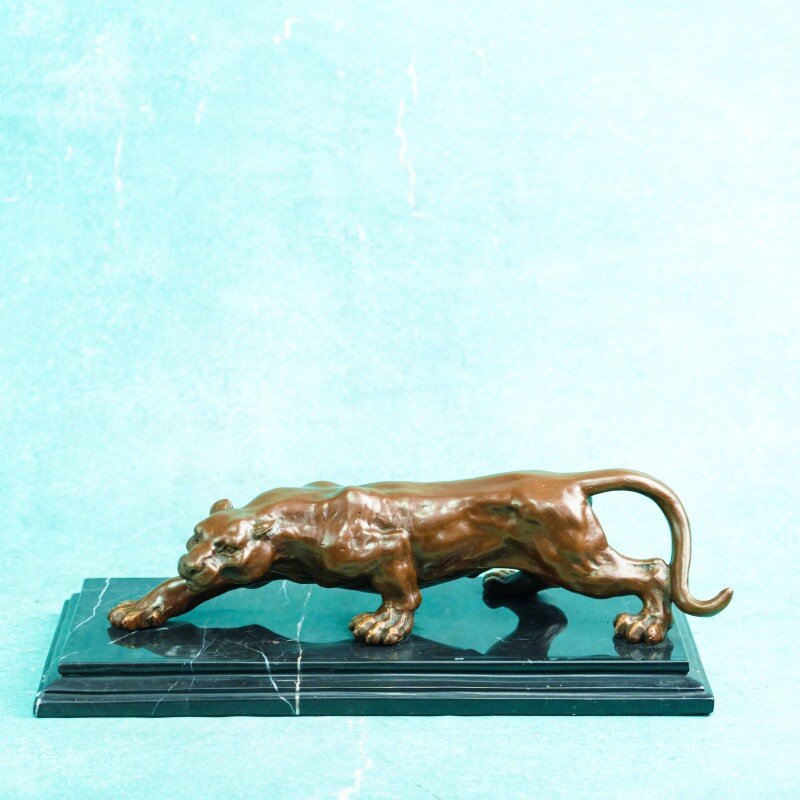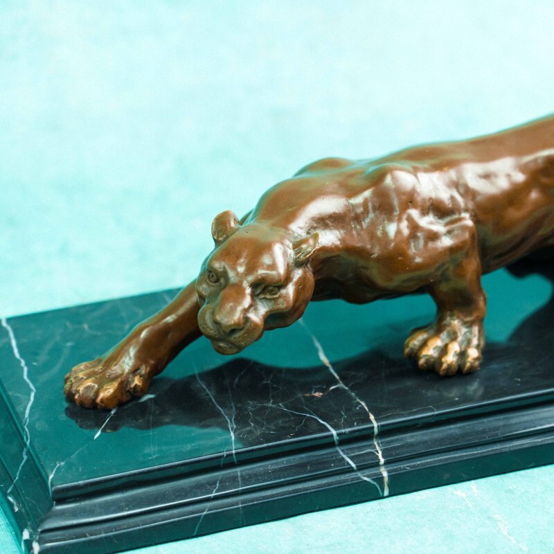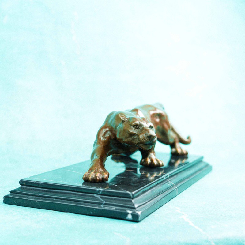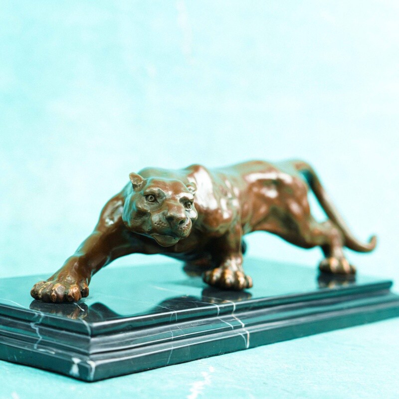 Мастер блестяще уловил момент перед атакой: в позе пантеры ощущается внутренняя энергия, сосредоточенность и ловкость. Теплый бронзовый оттенок с мягким блеском подчёркивает анатомическую точность и плавные линии тела, а полированное мраморное основание создаёт контраст и усиливает выразительность формы.