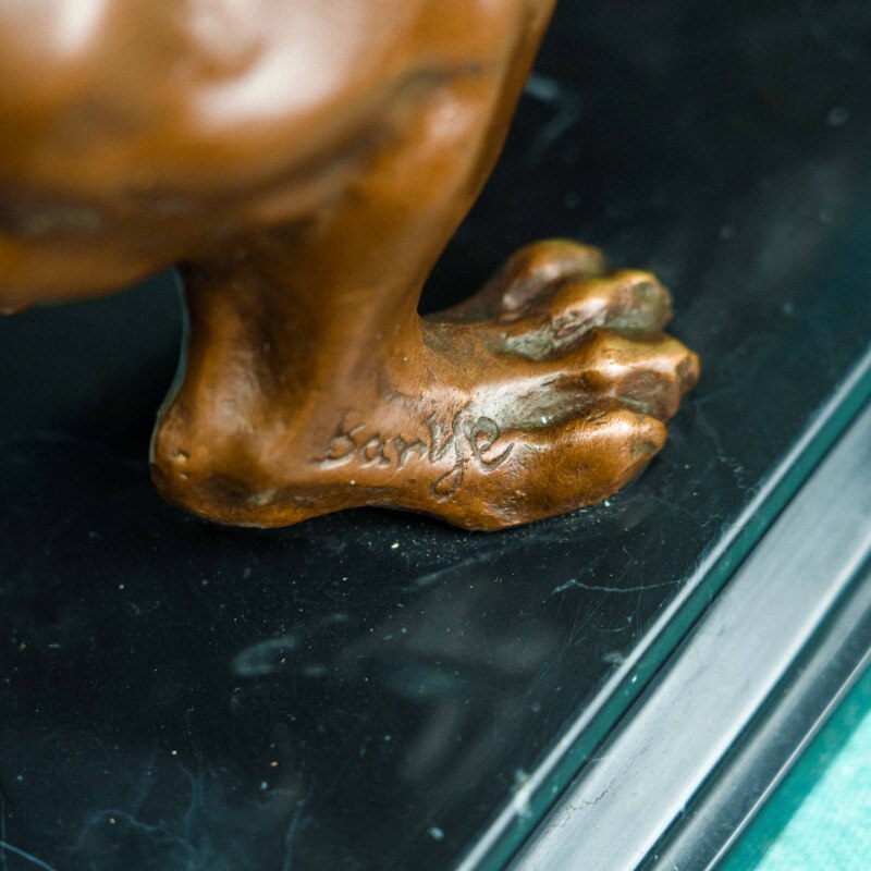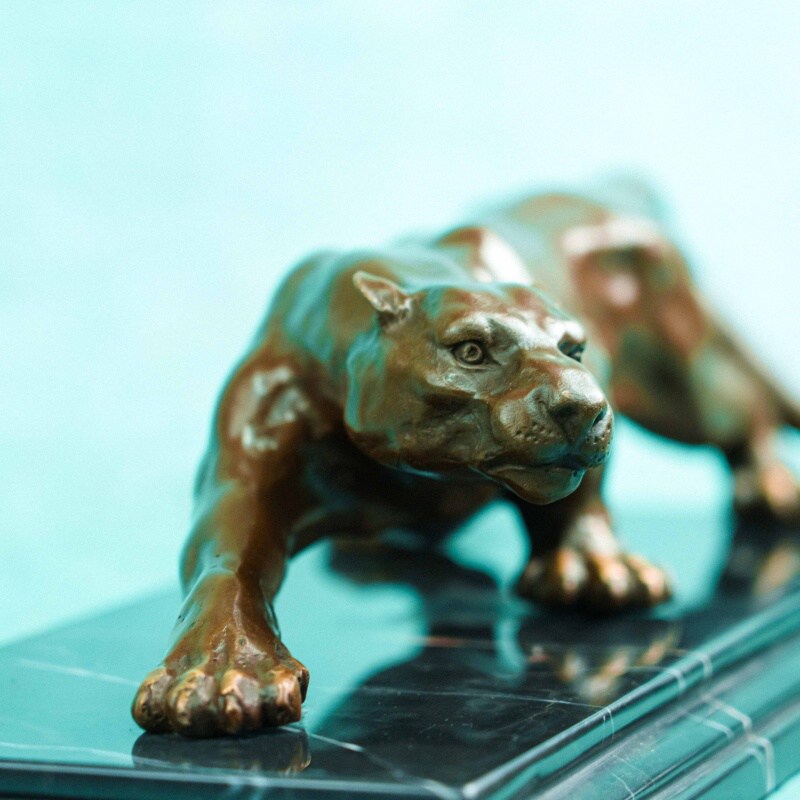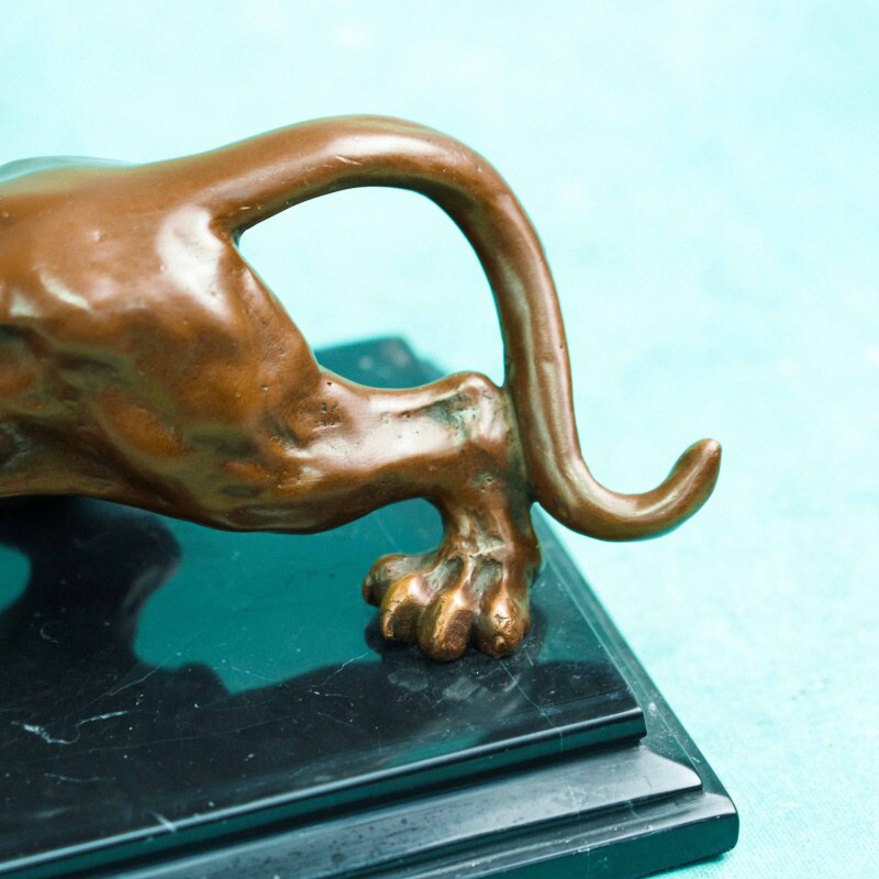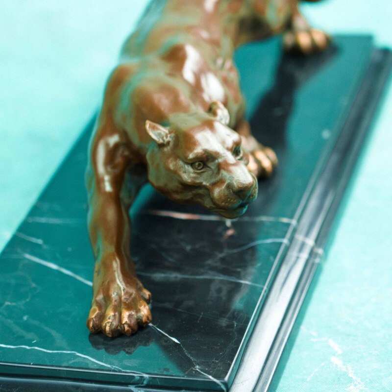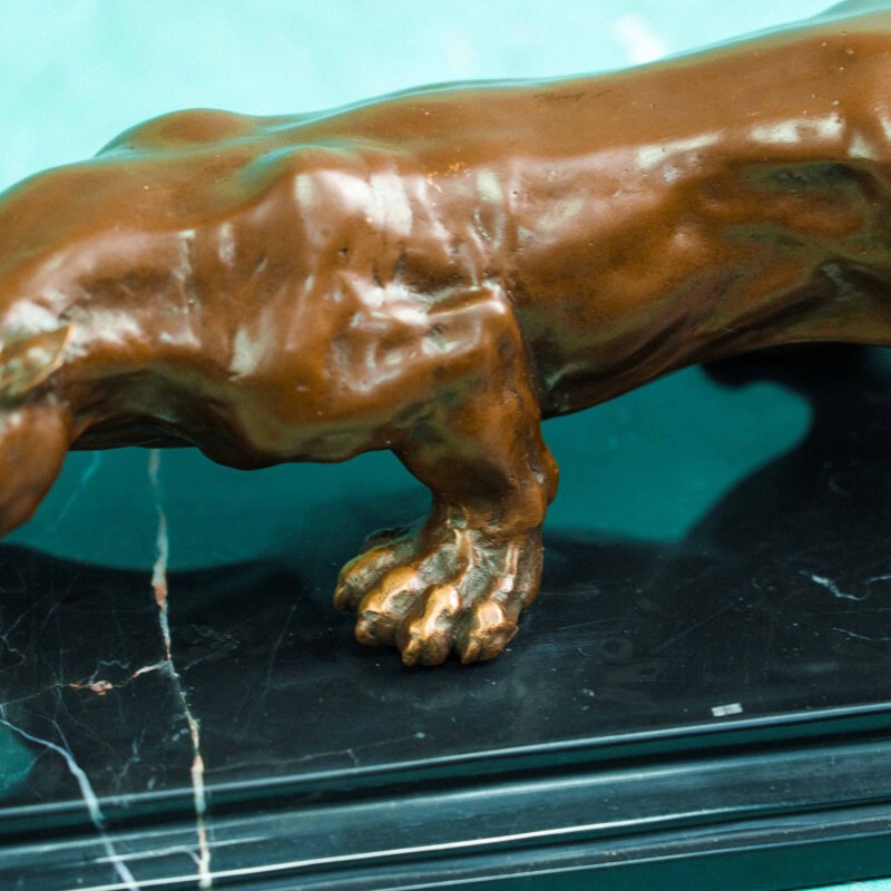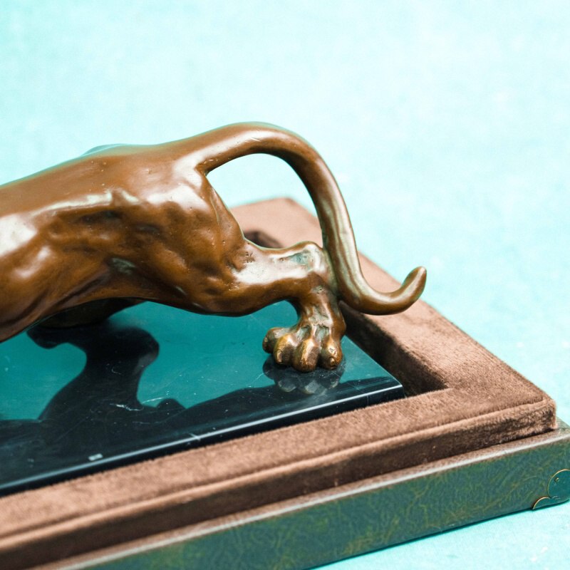 Мастер блестяще уловил момент перед атакой: в позе пантеры ощущается внутренняя энергия, сосредоточенность и ловкость. Теплый бронзовый оттенок с мягким блеском подчёркивает анатомическую точность и плавные линии тела, а полированное мраморное основание создаёт контраст и усиливает выразительность формы.