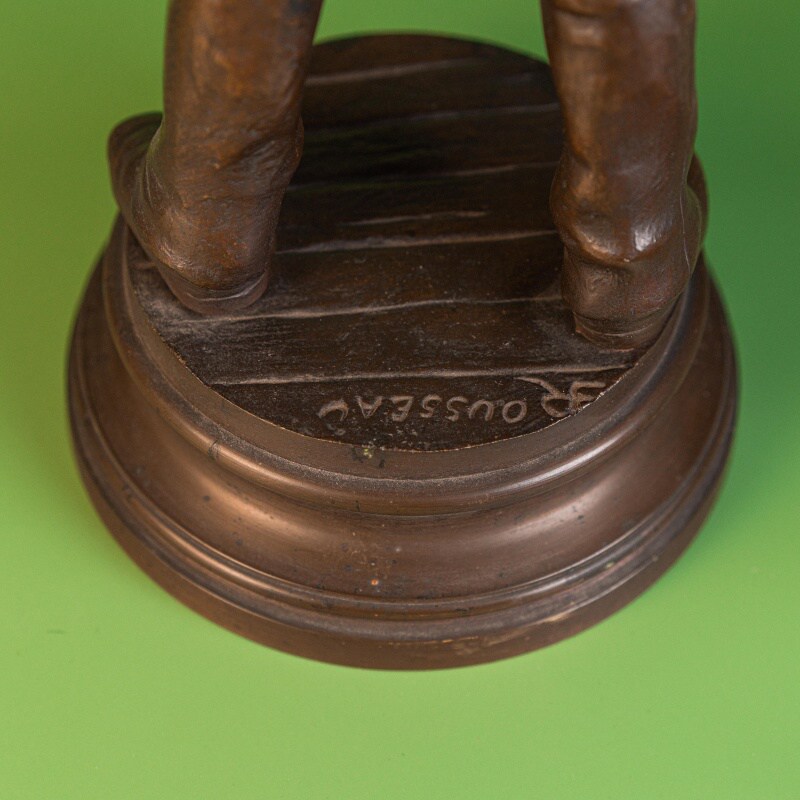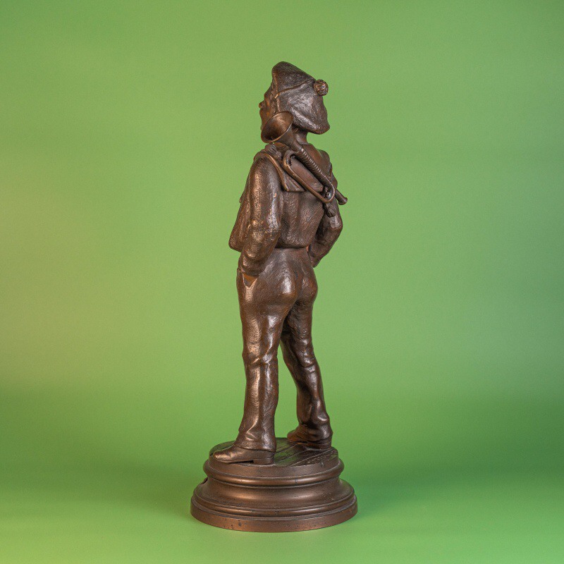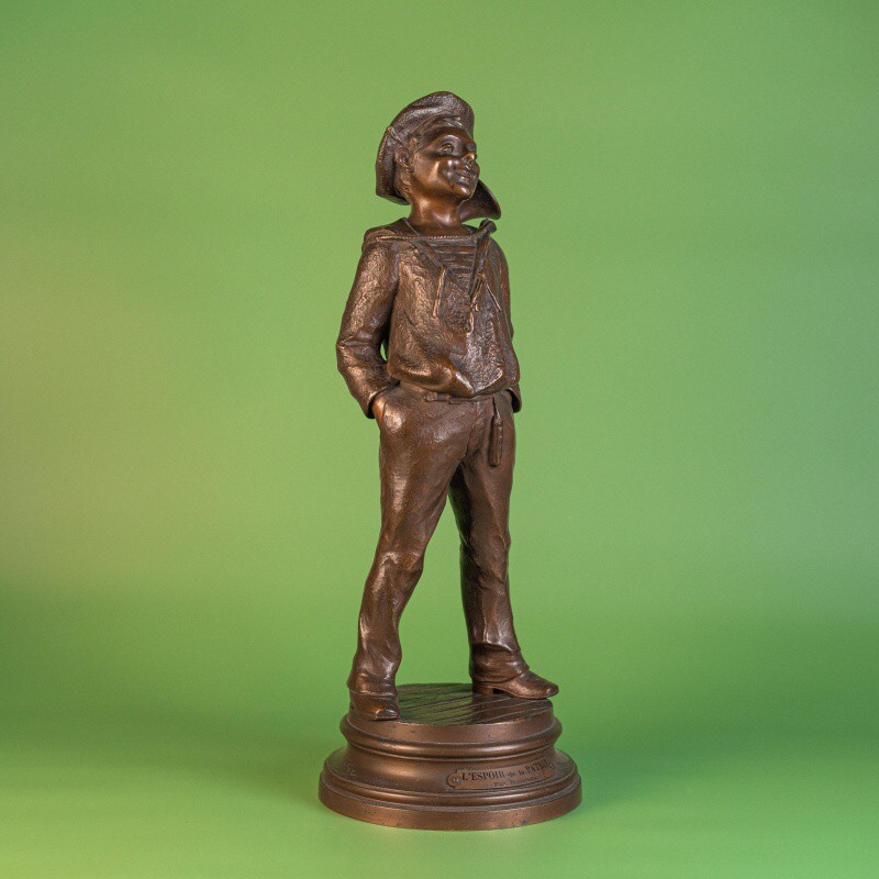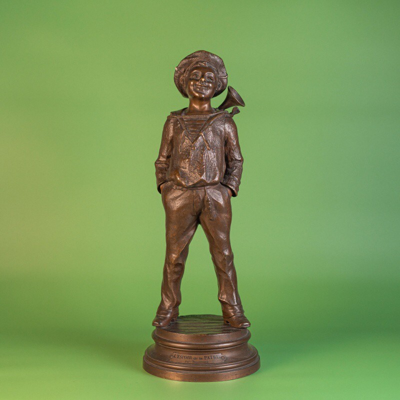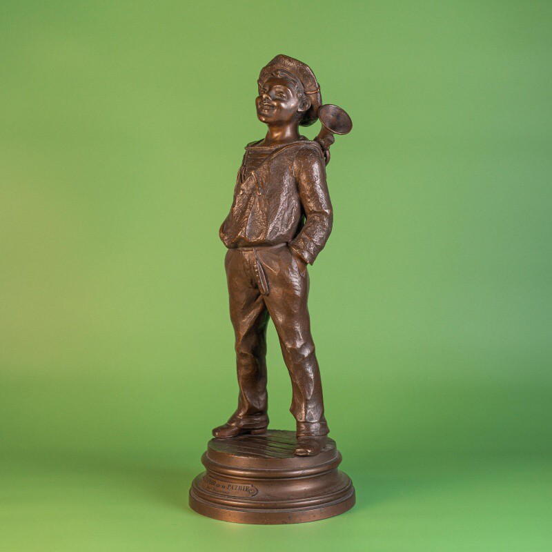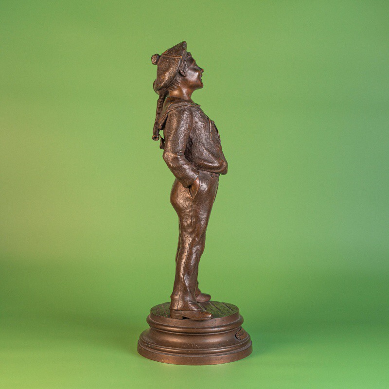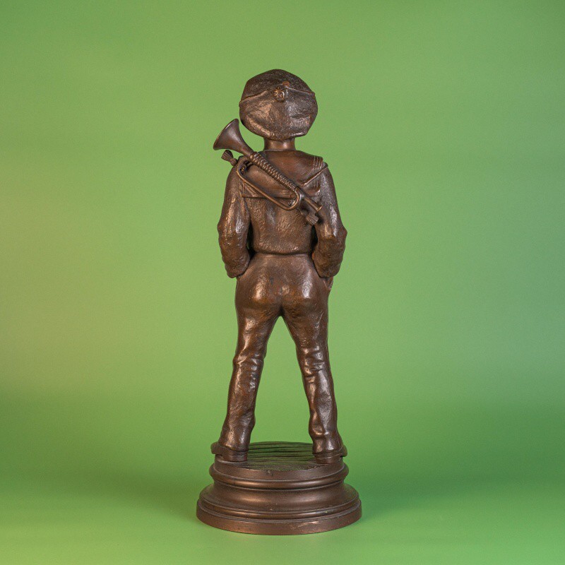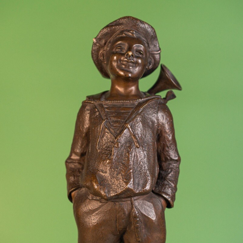 Прекрасная кабинетная скульптура известного французского скульптора Emile Francois Rousseau. Сюжет представляет собой маленького мальчика, засунувшего руки в карманы, за спиной которого расположен горн. Мальчишка одет в морскую тельняшку, брюки и берет с помпоном. Улыбающееся лицо мальчика внушает радость жизни. Автору превосходно удалось передать эмоциональное состояние радостного мальчика, также уделить проработке мелких деталей.