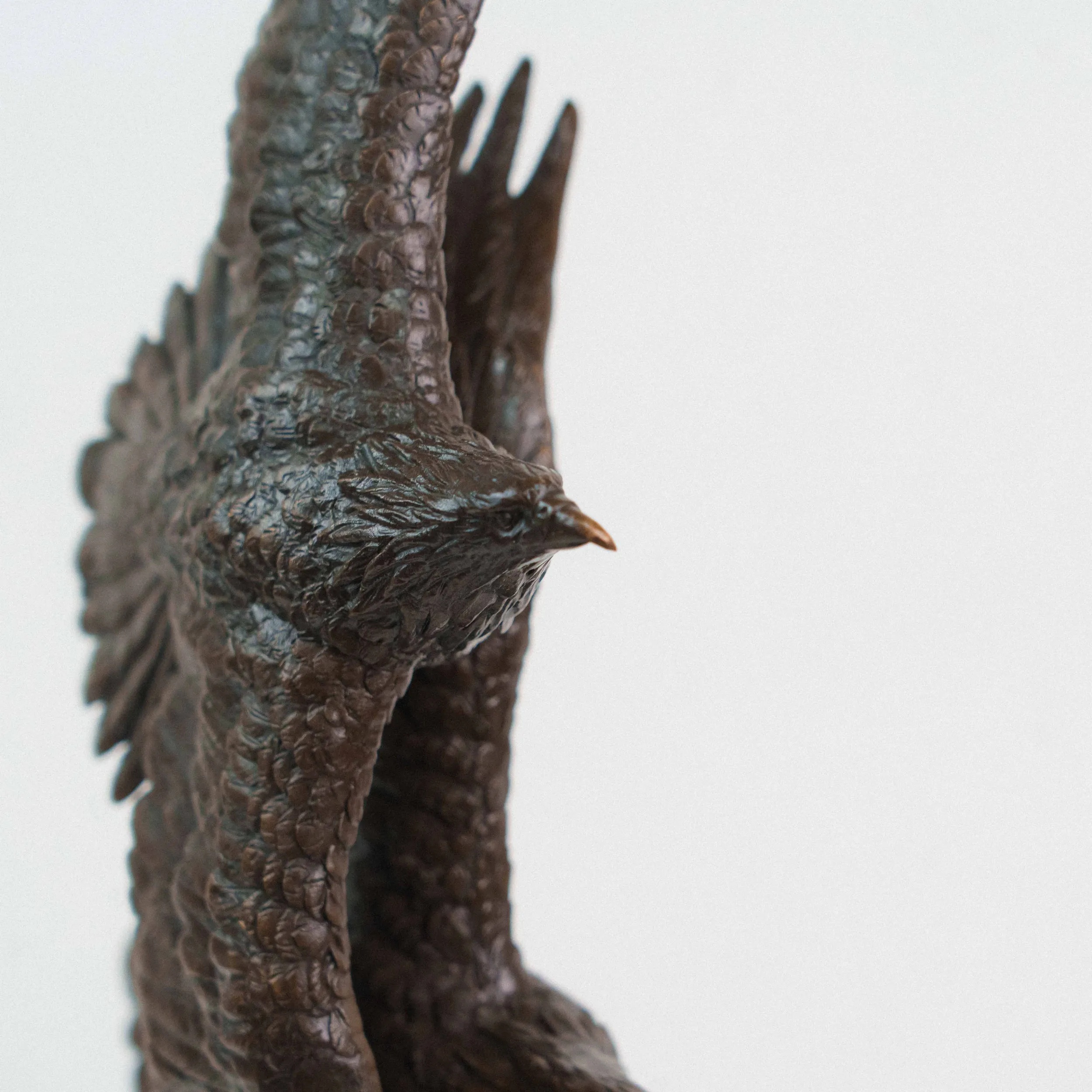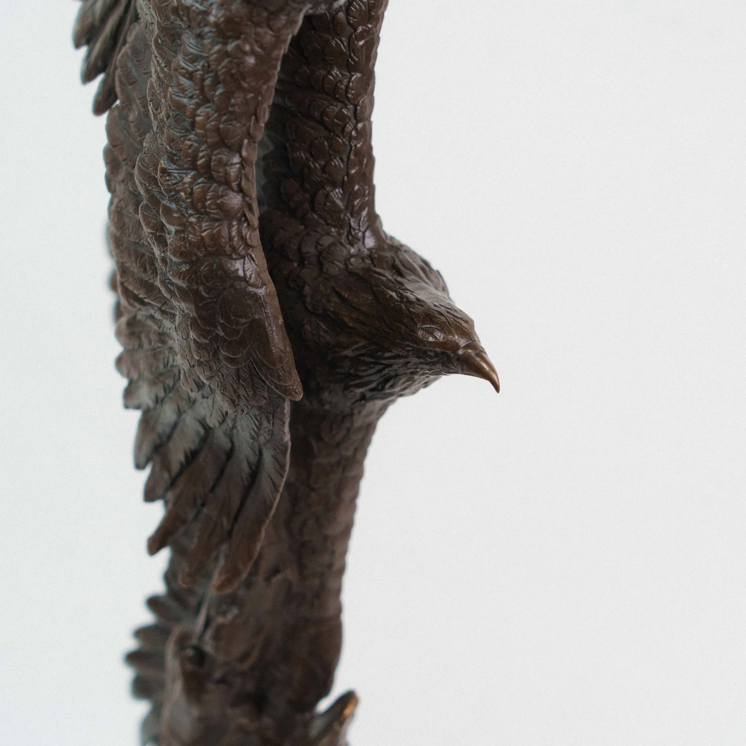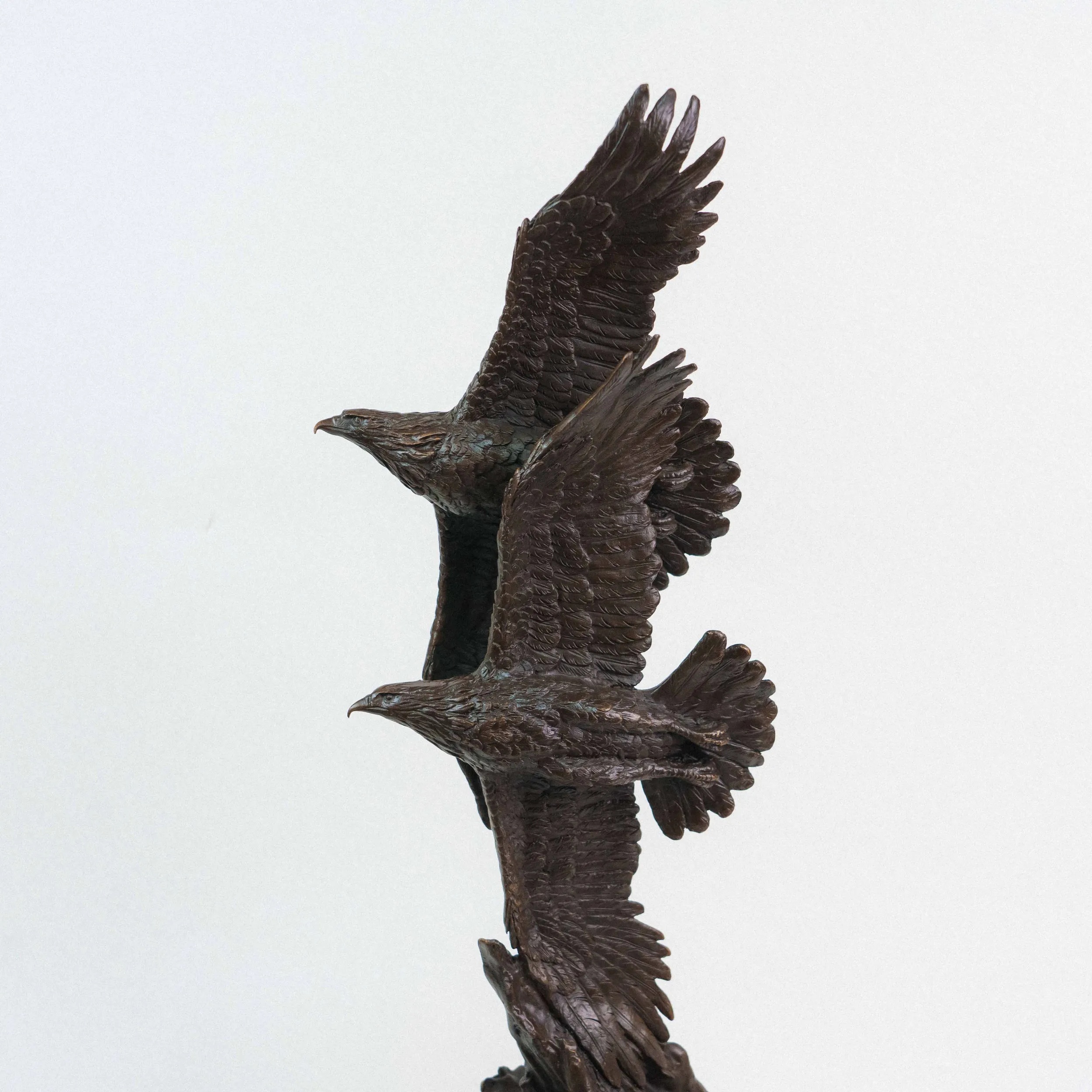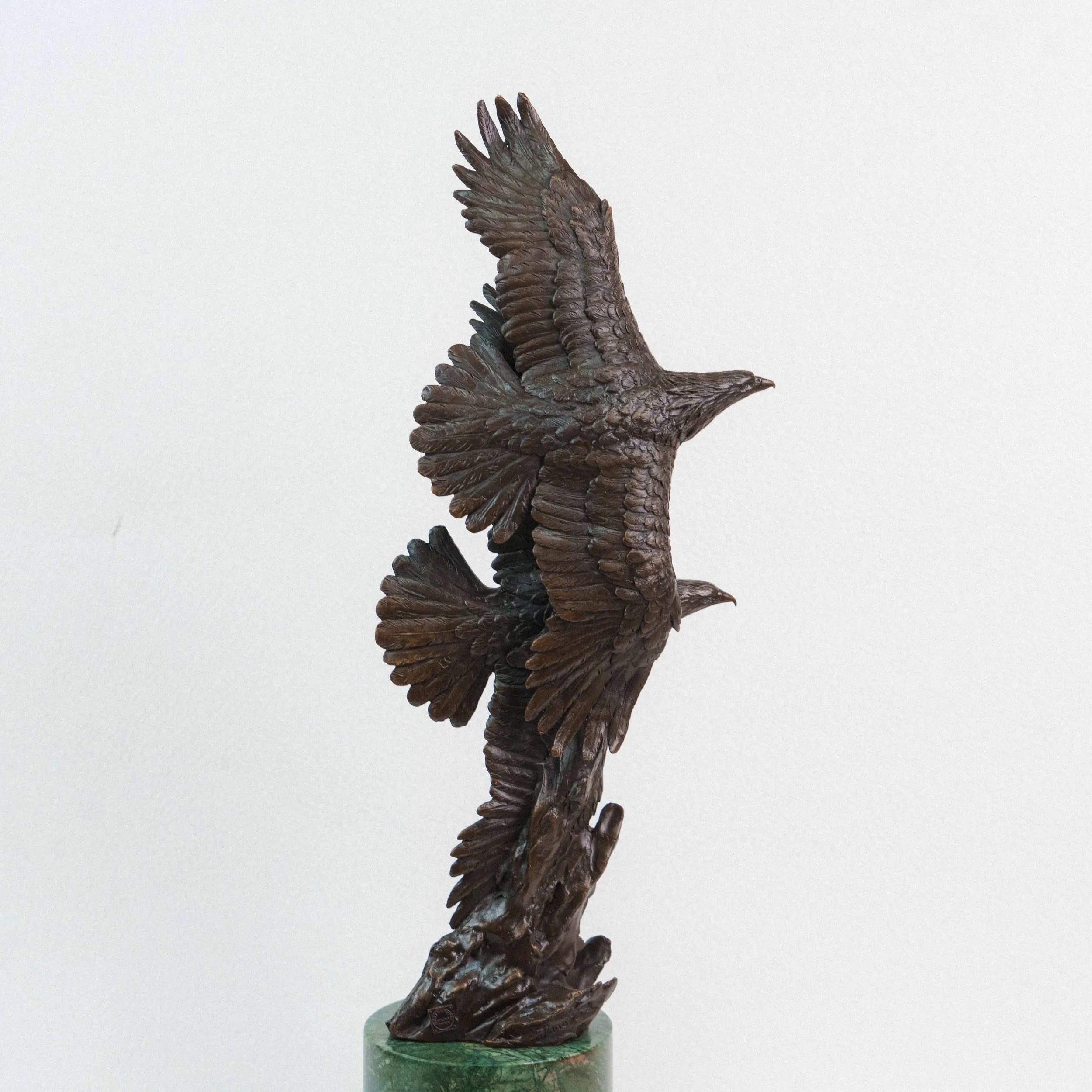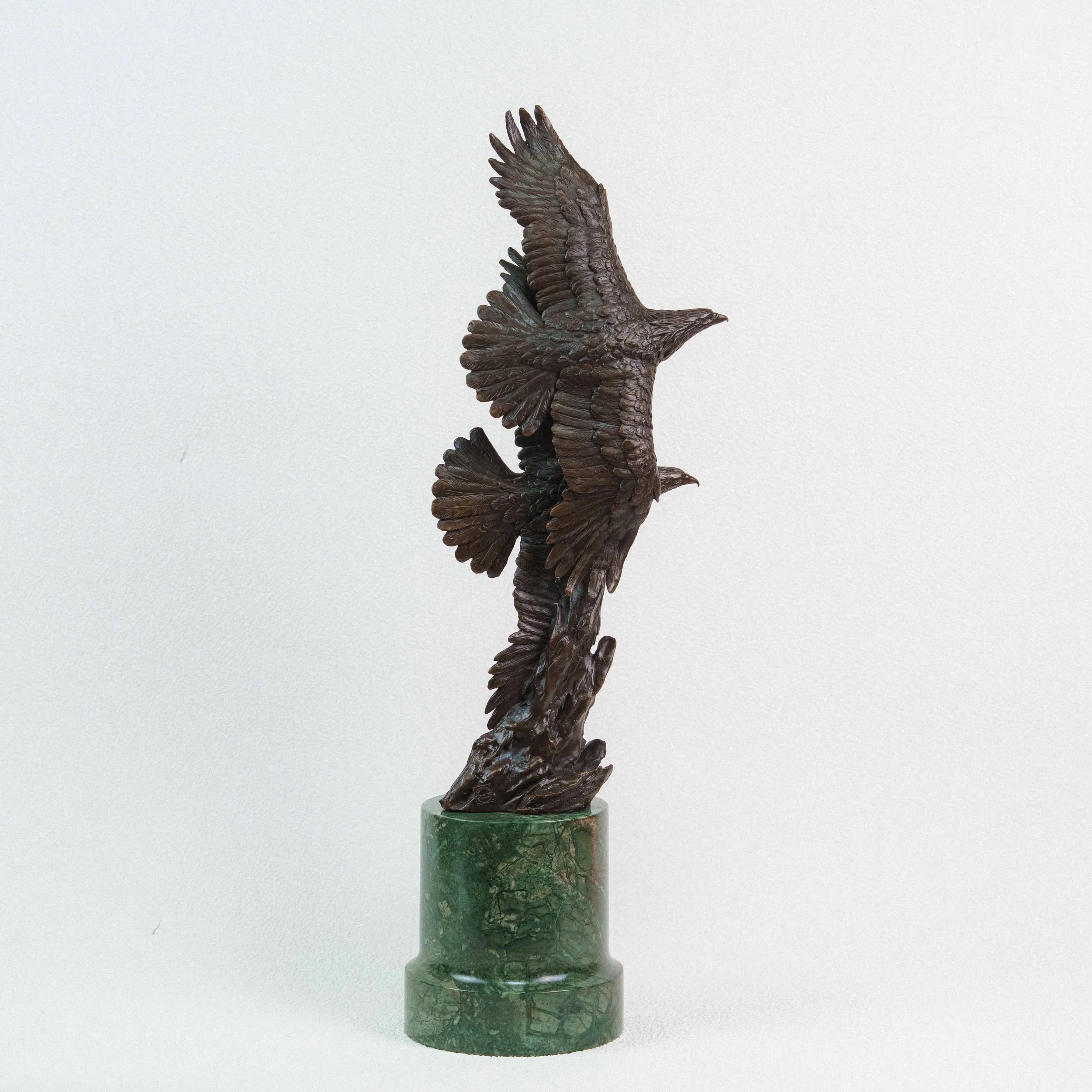 Изящная бронзовая скульптура изображает двух орлов, парящих в небе с широко расправленными крыльями. Динамичная композиция построена по вертикали: птицы словно взмывают вверх, увлекая взгляд зрителя за собой. Скульптор детально проработал фактуру перьев, добиваясь живописной игры света и тени на бронзовой поверхности. Фигура расположена на массивном цилиндрическом постаменте из зелёного камня, который гармонично контрастирует с тёмным оттенком бронзы и придаёт композиции устойчивость.