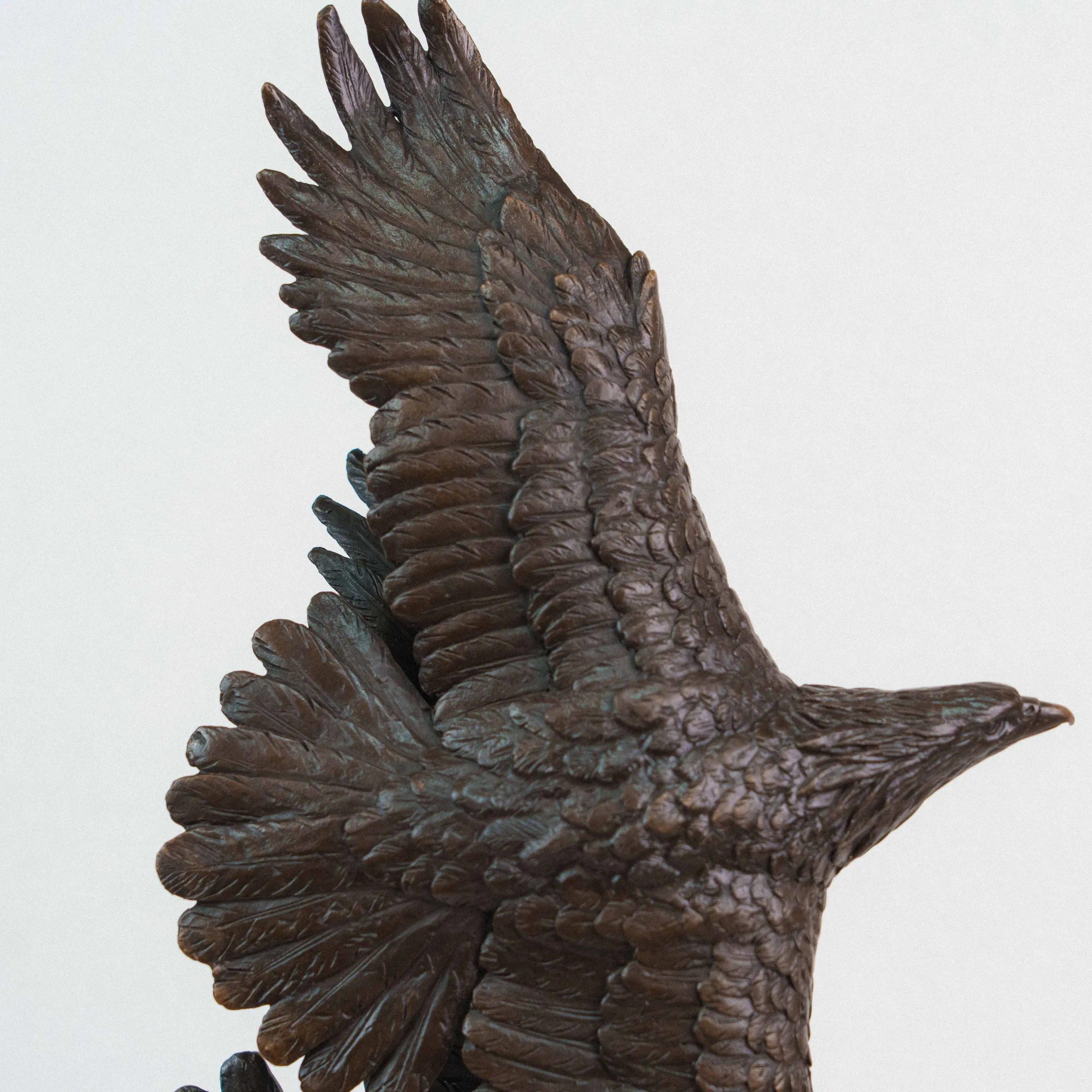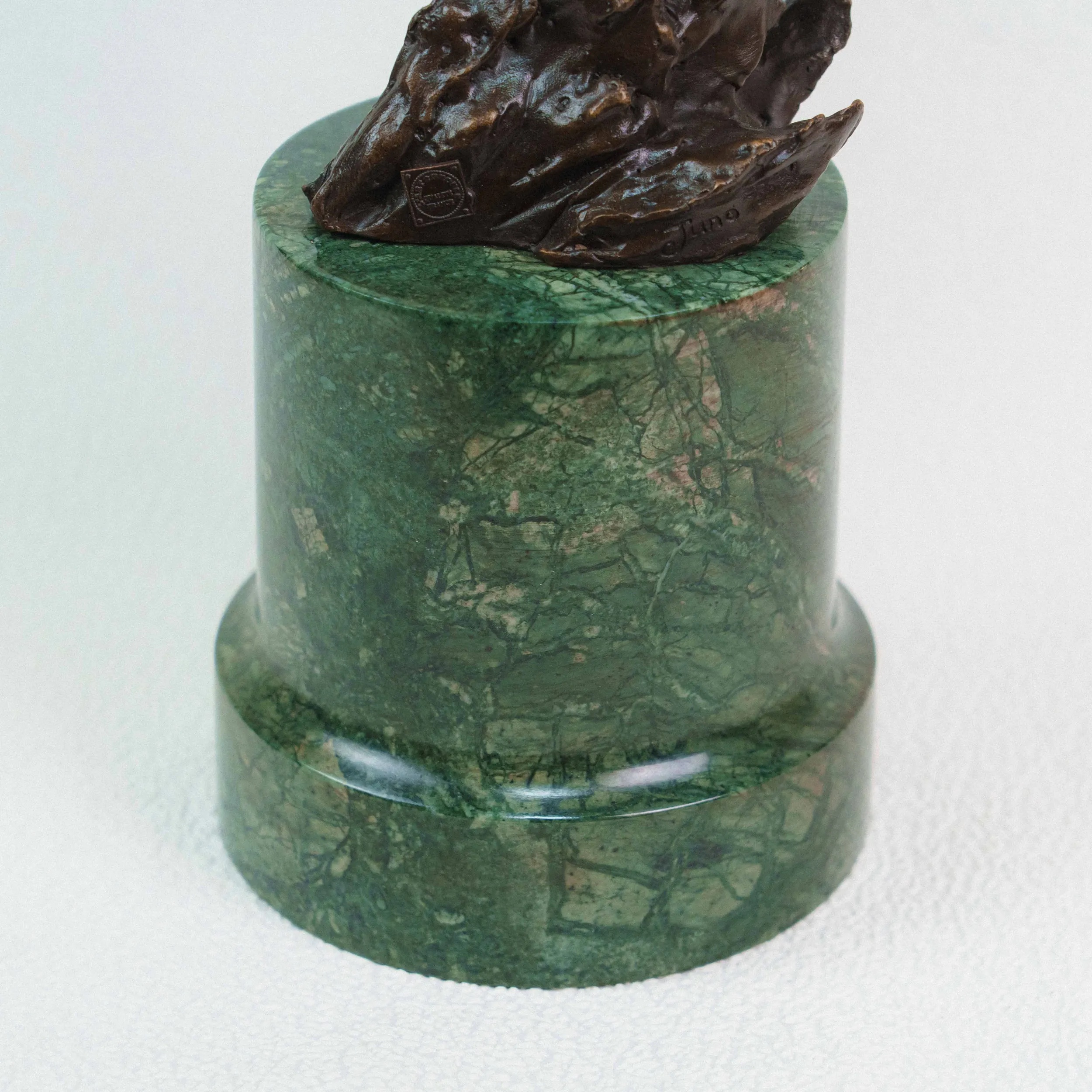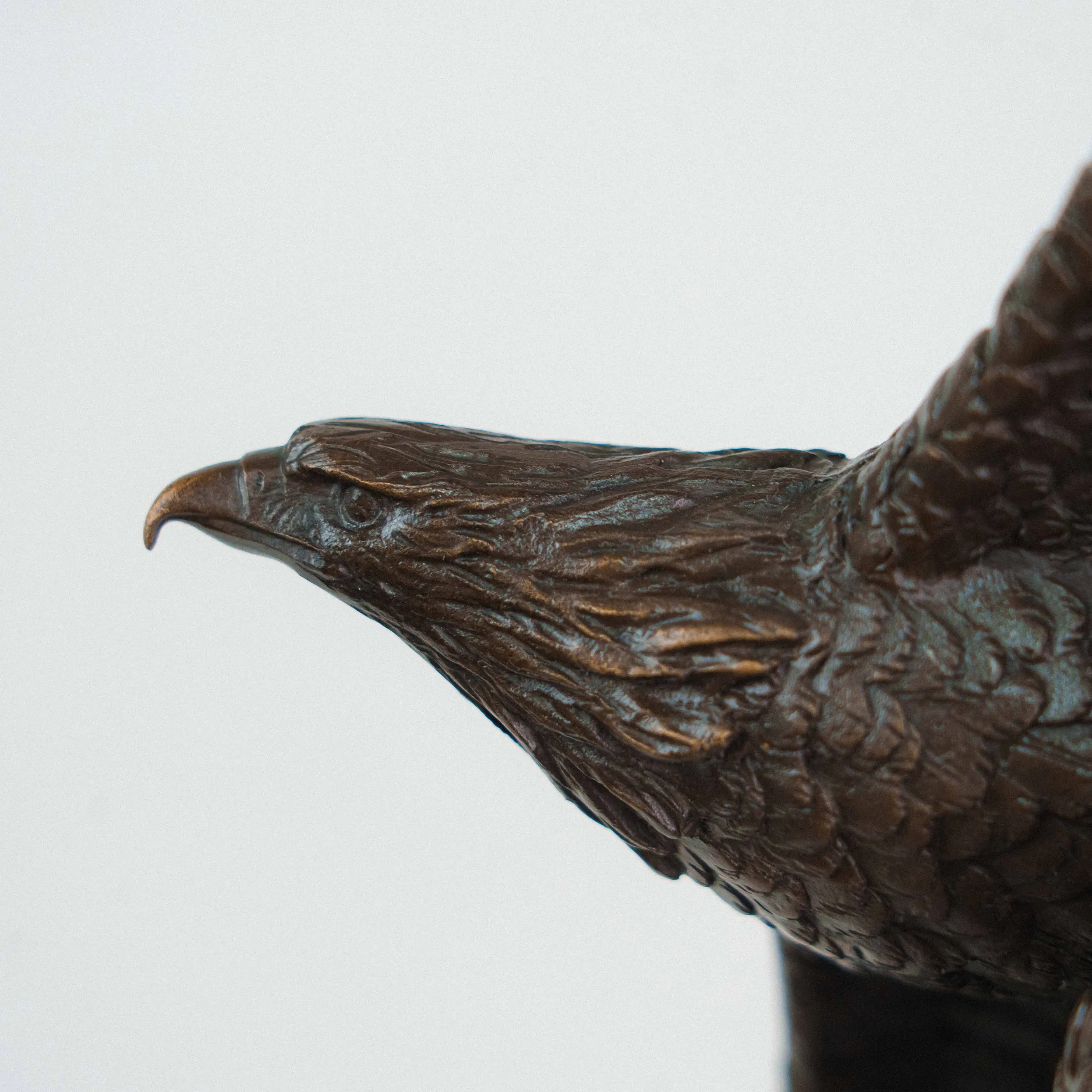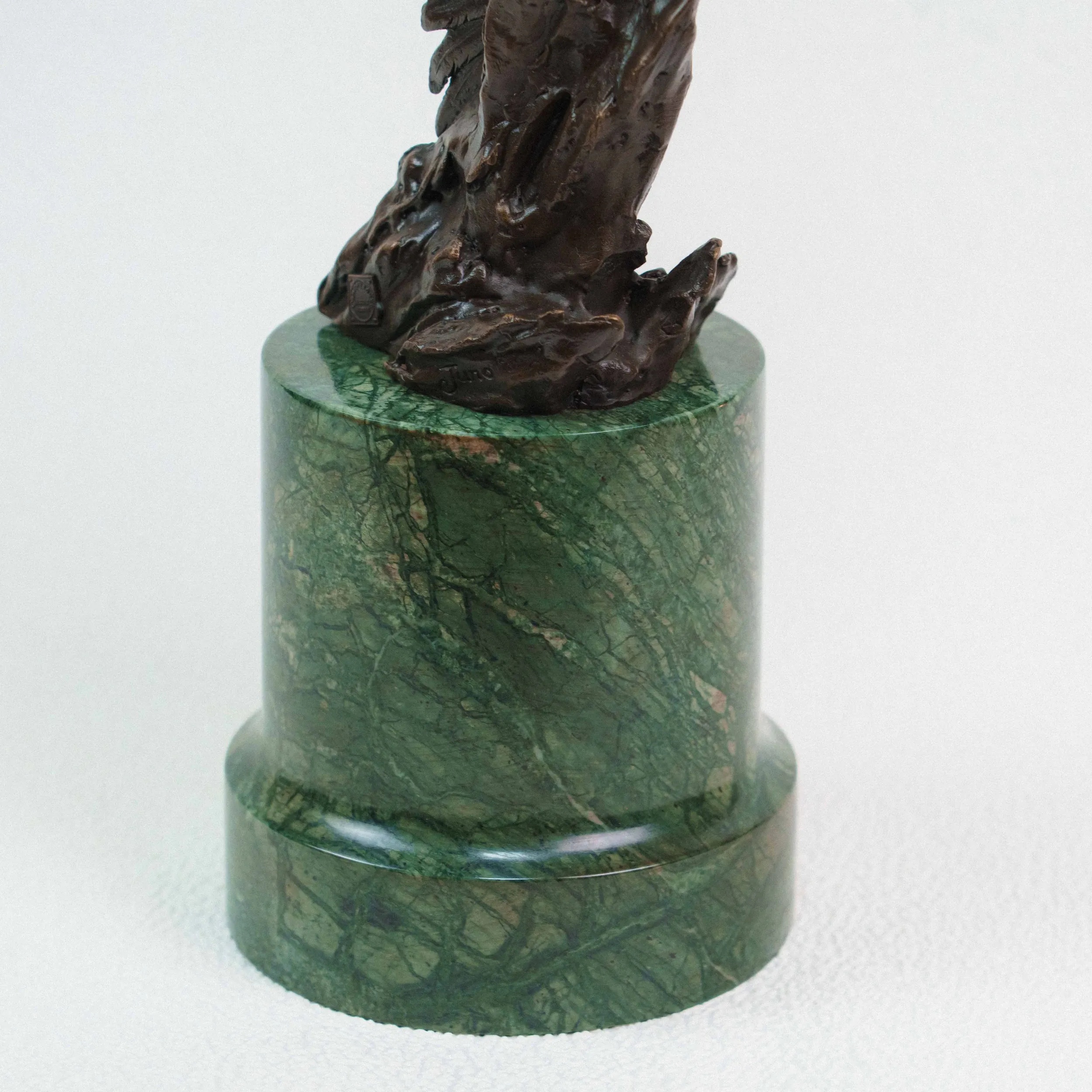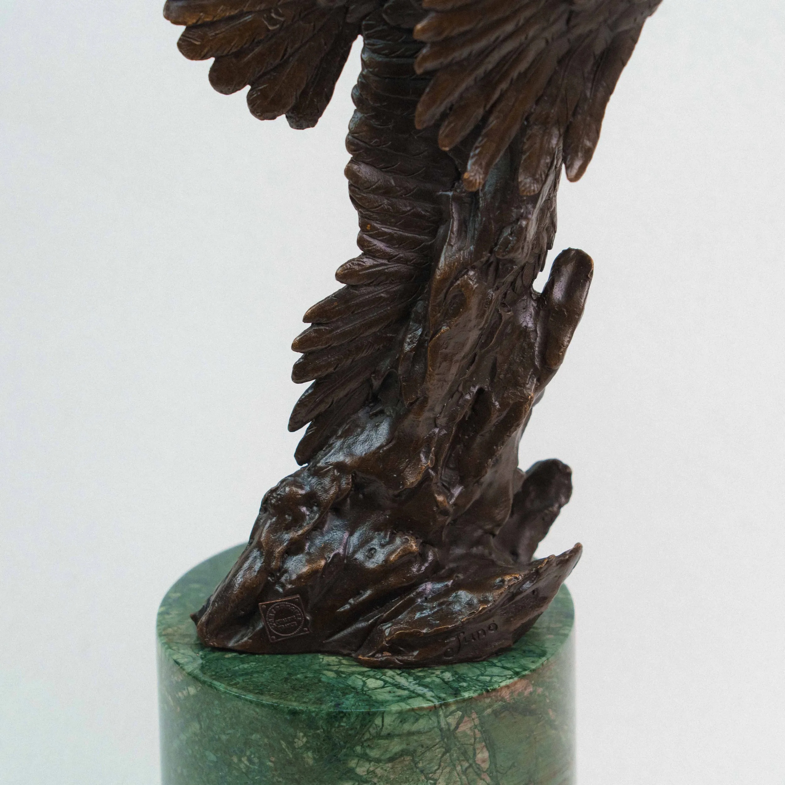 Изящная бронзовая скульптура изображает двух орлов, парящих в небе с широко расправленными крыльями. Динамичная композиция построена по вертикали: птицы словно взмывают вверх, увлекая взгляд зрителя за собой. Скульптор детально проработал фактуру перьев, добиваясь живописной игры света и тени на бронзовой поверхности. Фигура расположена на массивном цилиндрическом постаменте из зелёного камня, который гармонично контрастирует с тёмным оттенком бронзы и придаёт композиции устойчивость.