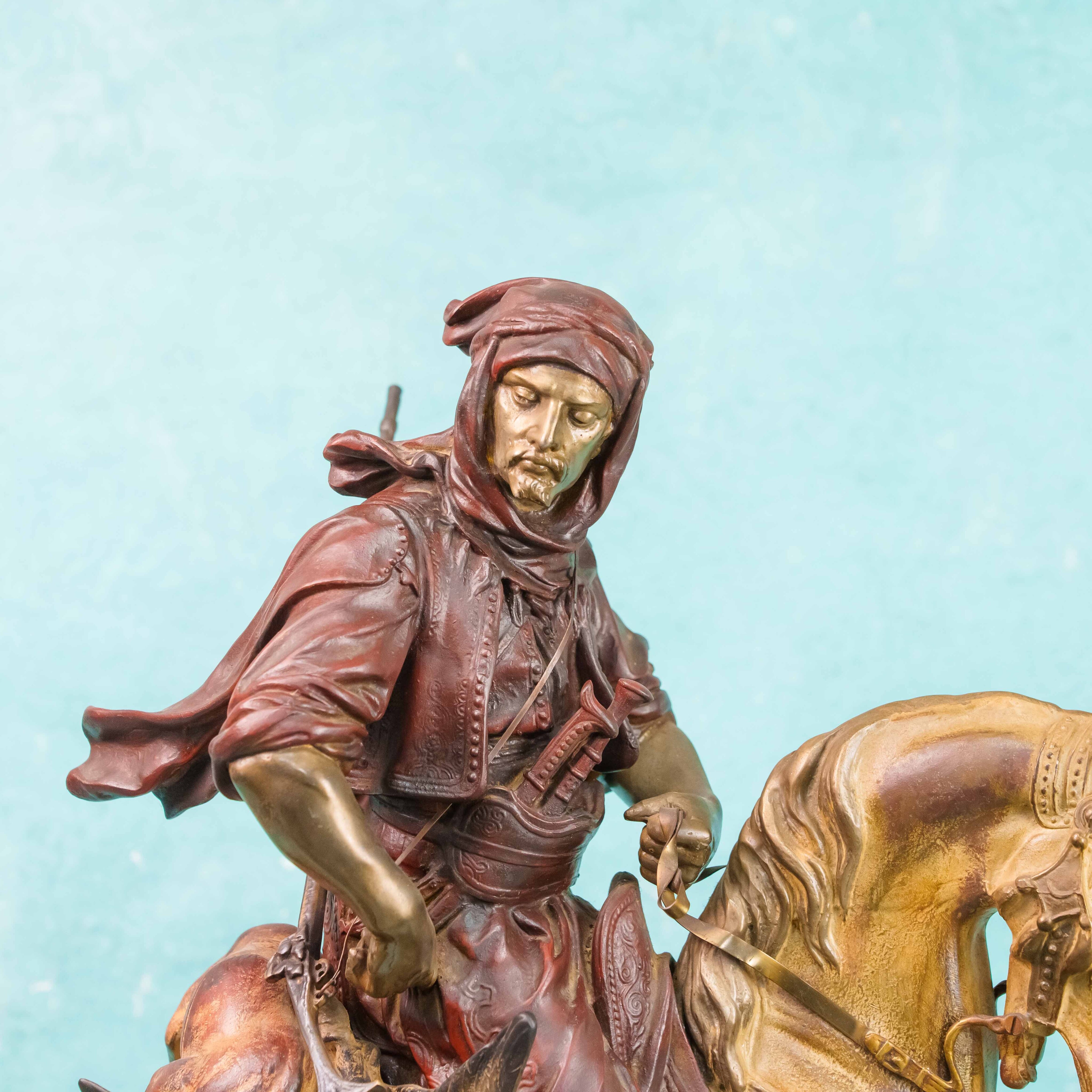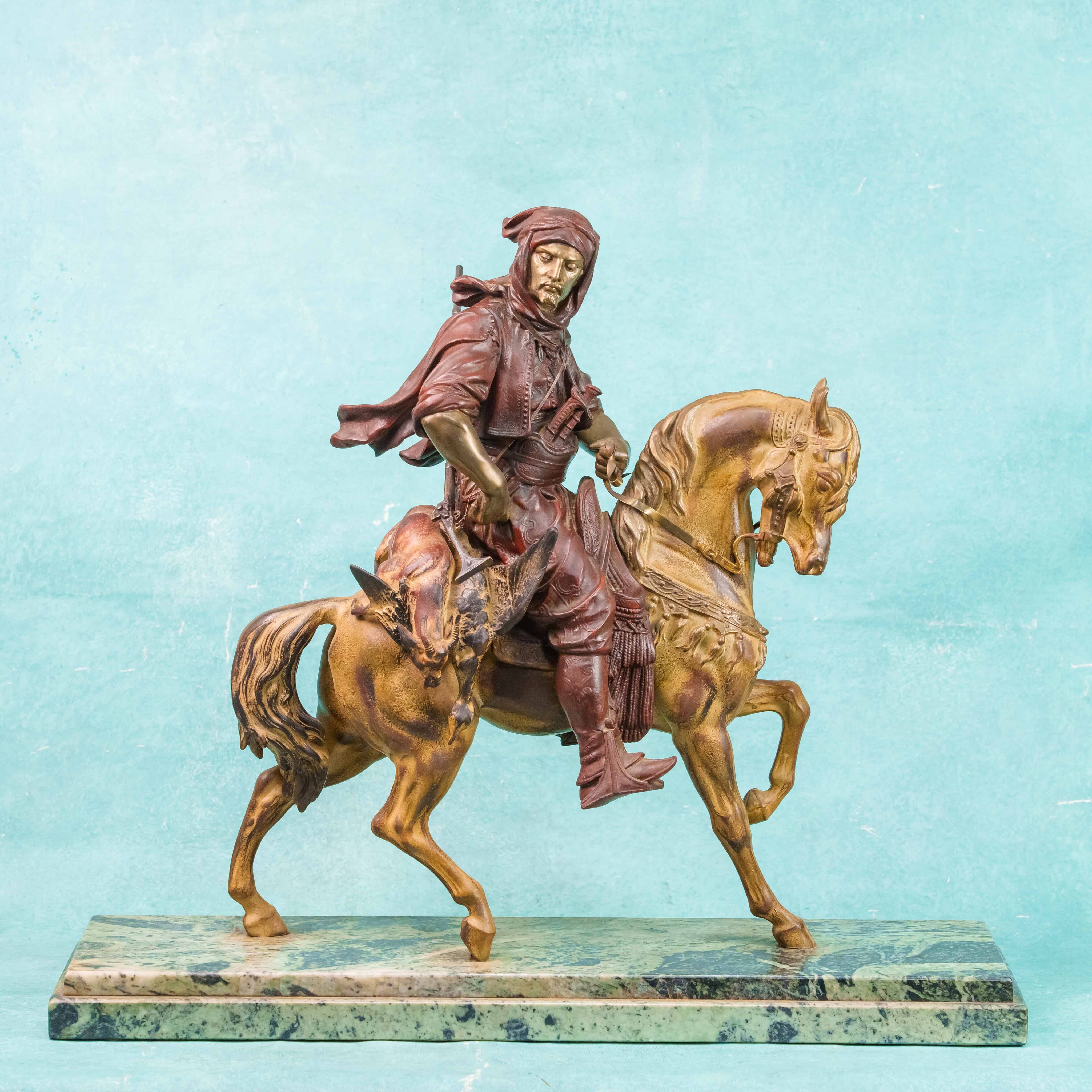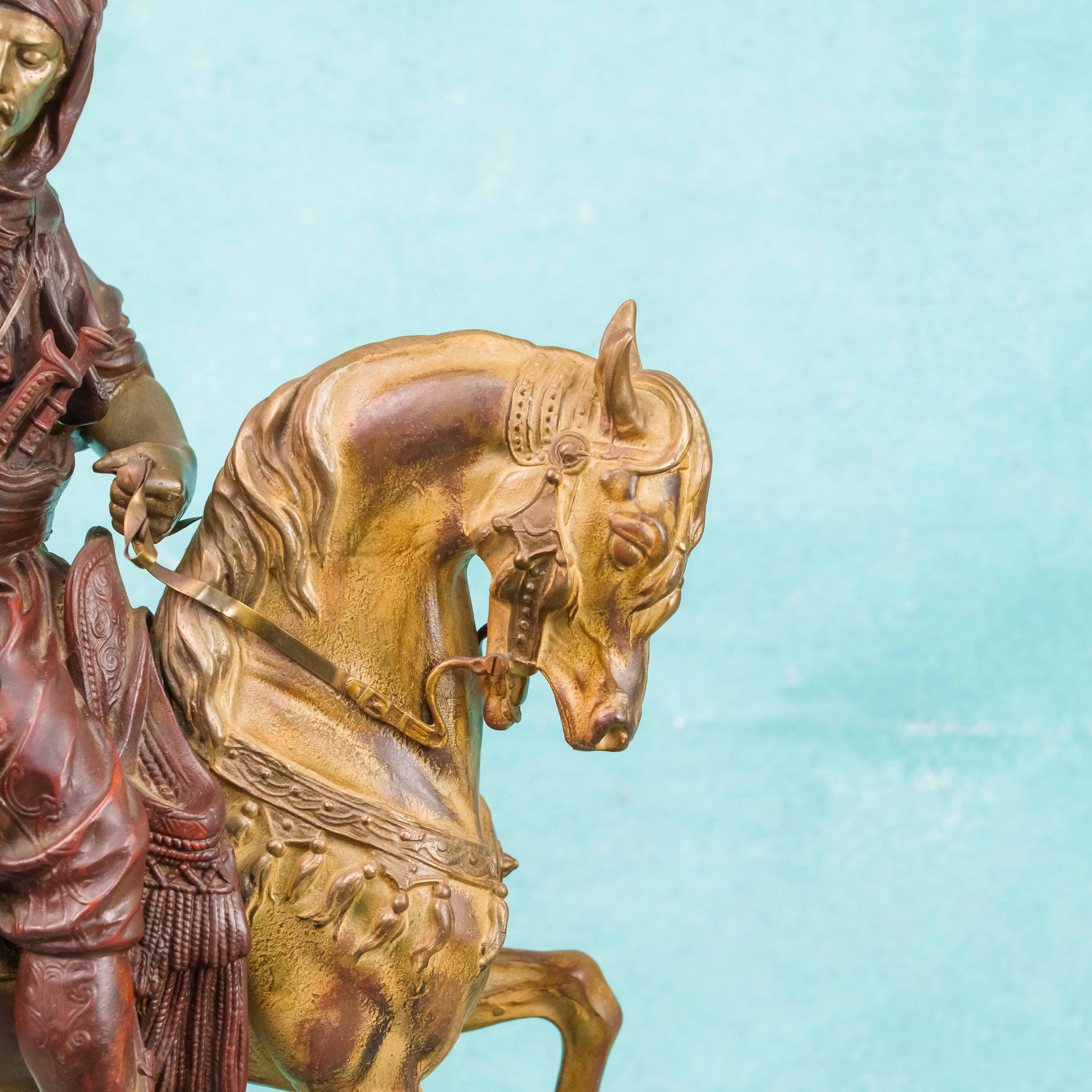 Выразительная кабинетная скульптурная композиция изображает мужчину в парадных восточных одеждах, сидящего на коне. В левой руке он держит поводья, через плечо перекинуто длинное ружьё. Работа выполнена из металла с художественным патинированием и установлена на массивном постаменте. Авторы уделили особое внимание тщательной проработке деталей костюма всадника, амуниции и анатомии лошади, что придаёт композиции выразительность, динамику и ощущение живого присутствия.