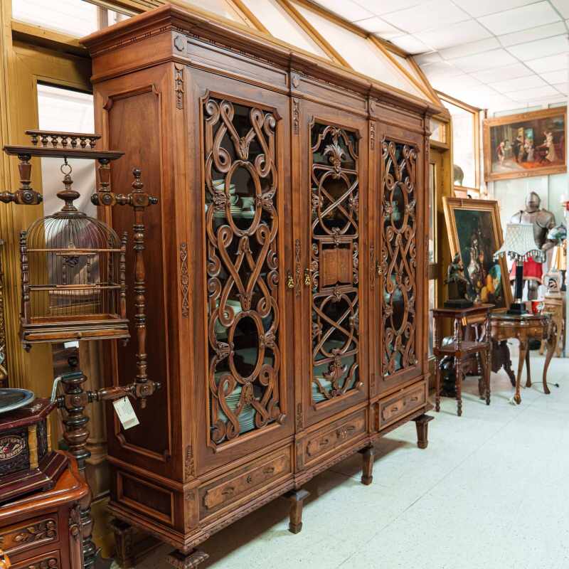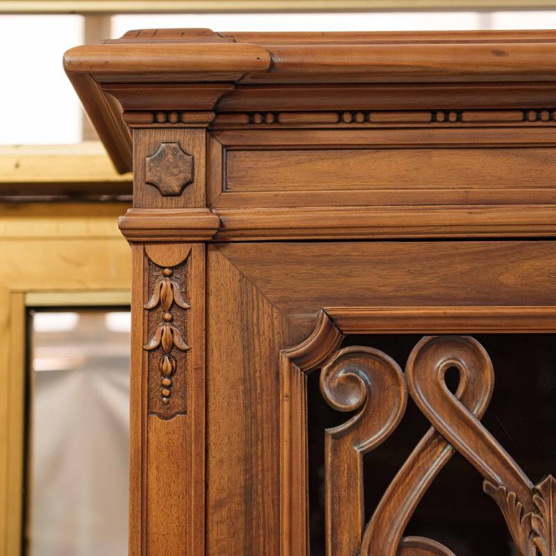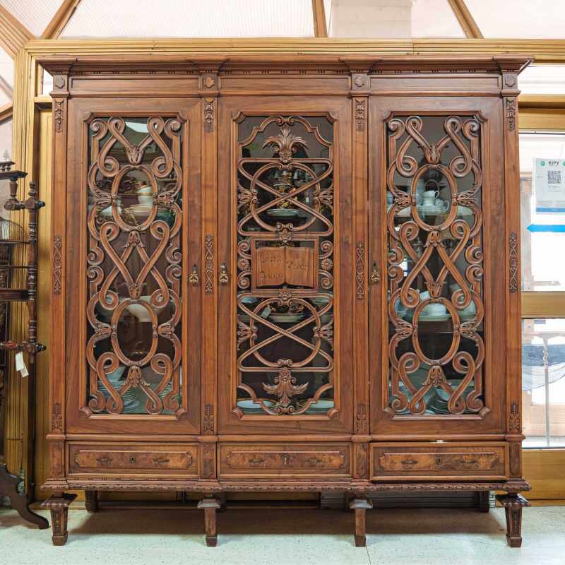 Перед вами впечатляющий антикварный шкаф, выполненный в духе европейского историзма конца XIX – начала XX века, где гармонично переплетаются элементы неоренессанса и декоративного модерна.