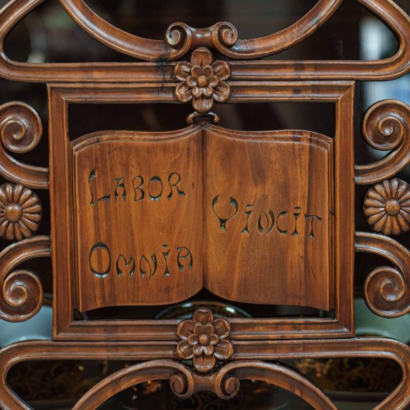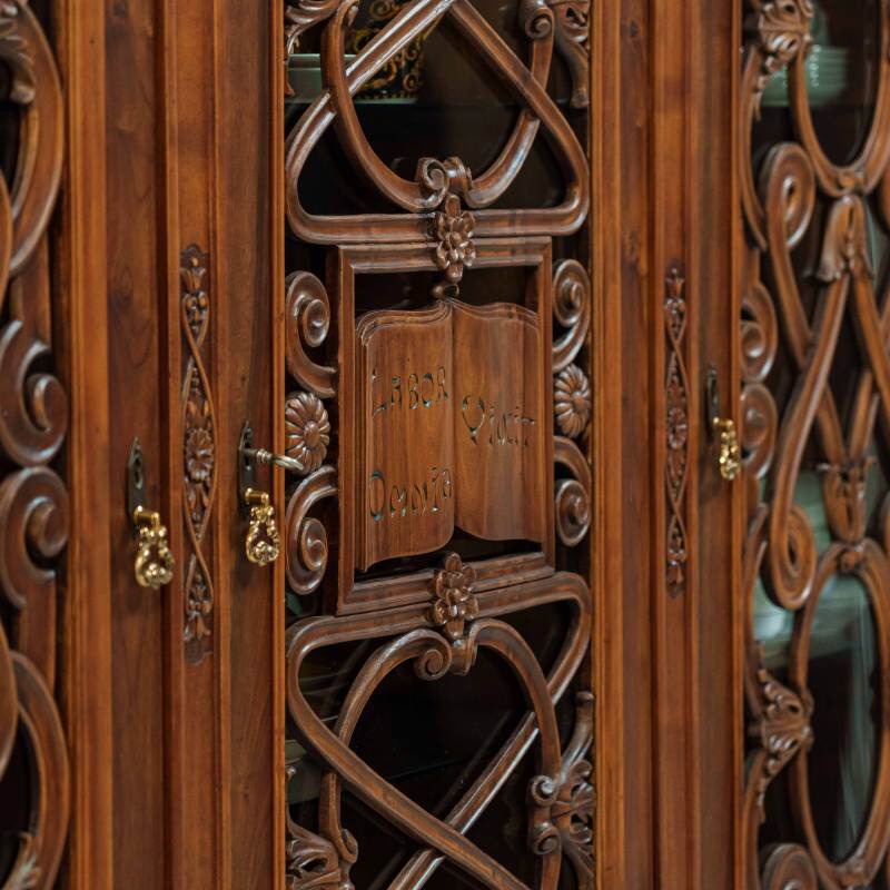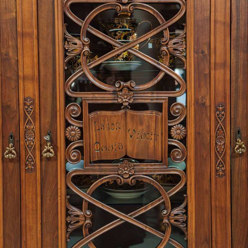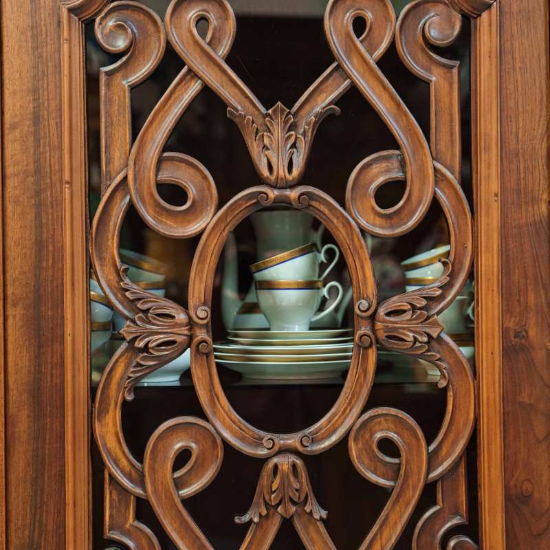 Фасад разделён на три основные секции, каждая из которых оформлена как самостоятельная декоративная композиция. Центральная часть акцентирована более сложным орнаментом: здесь резные переплетения образуют изящный геометризированный узор с растительными мотивами, в который органично вписаны небольшие филёнчатые элементы. Боковые створки украшены ажурными накладками с витиеватыми завитками и вставками из стекла — овальные и вытянутые формы придают фасаду лёгкость и визуальную глубину.