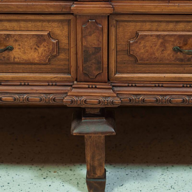 Корпус изготовлен из массива благородной древесины тёплого медово-коричневого оттенка, поверхность которого оживлена выразительным рисунком шпона. Богатая текстура дерева подчёркнута мягким блеском старинной полировки, придающей предмету глубину и особую «живую» теплоту.
