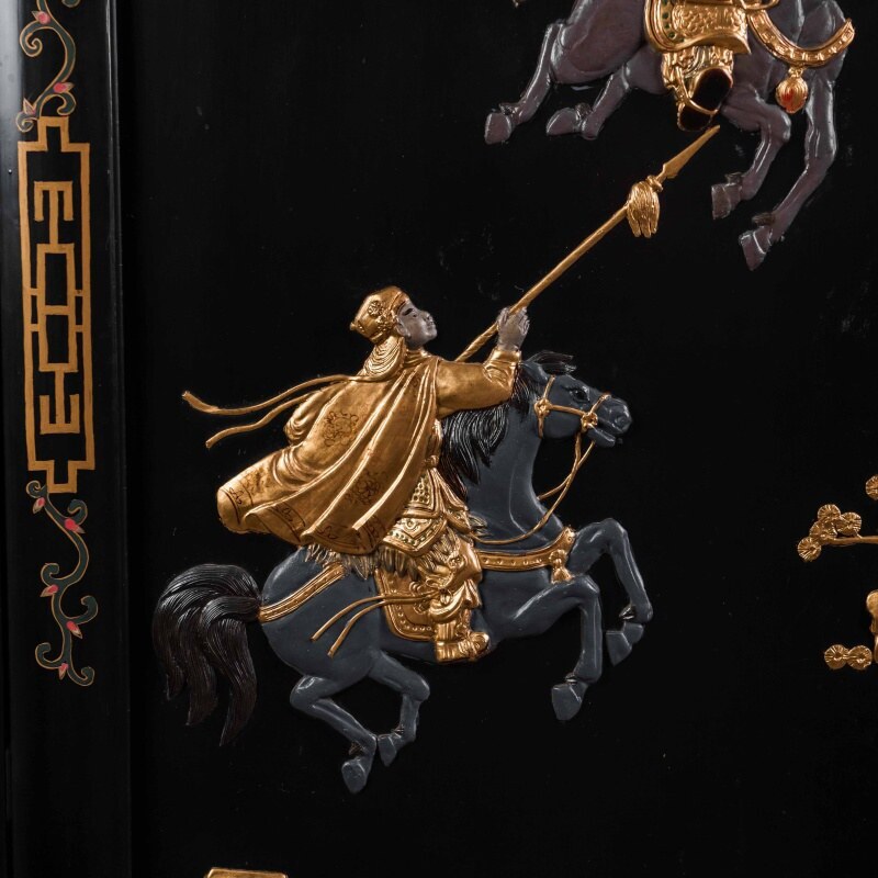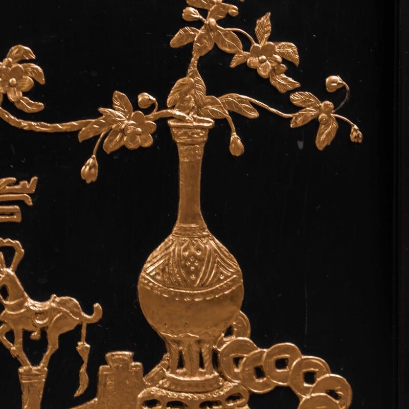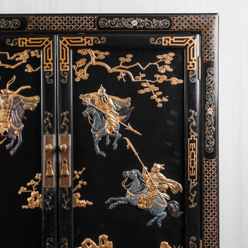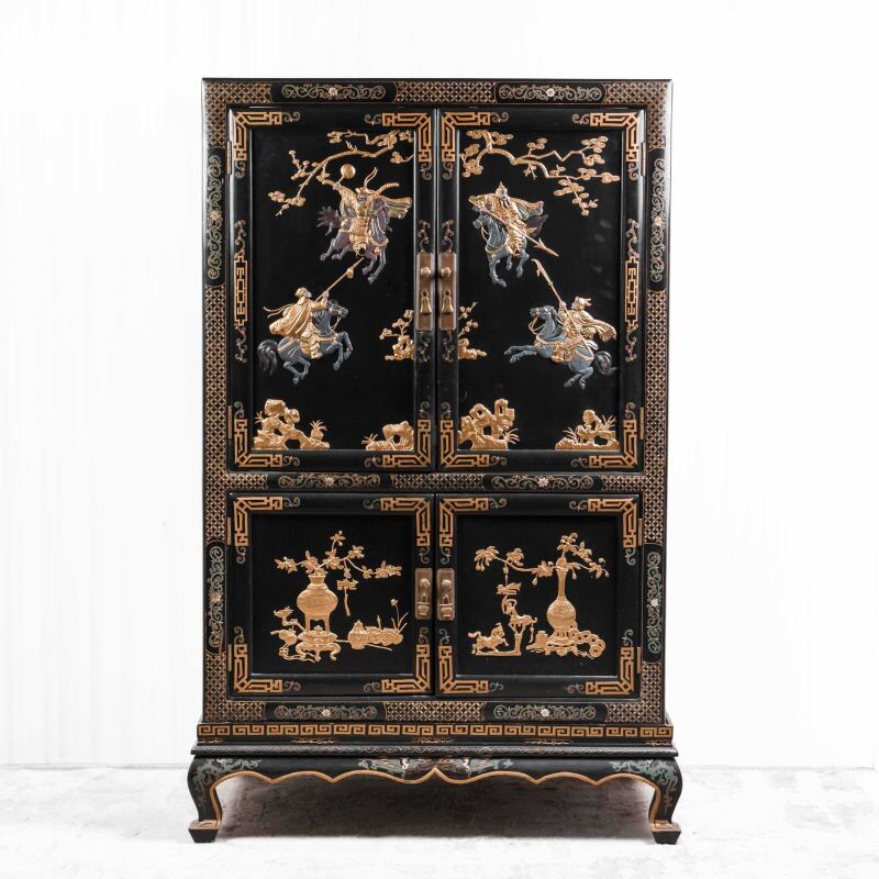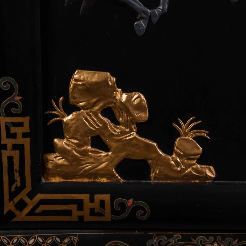 Этот антикварный шкаф выполнен в изысканном стиле Шинуазри — европейской интерпретации китайского декоративно-прикладного искусства, популярной в XVIII–XIX веках. Комод имеет строгие прямоугольные формы и стоит на изящных фигурных ножках с волнообразным основанием, что придаёт ему лёгкость и изысканность. Общий тон корпуса — глубокий чёрный лак, который создаёт контрастное и торжественное впечатление, идеально подчёркивая декоративные элементы. Главная особенность — богатое декоративное оформление в золотисто-бежевых тонах с инкрустациями. Поверхность комода украшена живописными панно с традиционными китайскими сценами, выполненными с высокой степенью детализации. Все изображения выполнены в технике лаковой росписи с золочением и перламутровыми вставками, создающими игру света и глубину изображения.