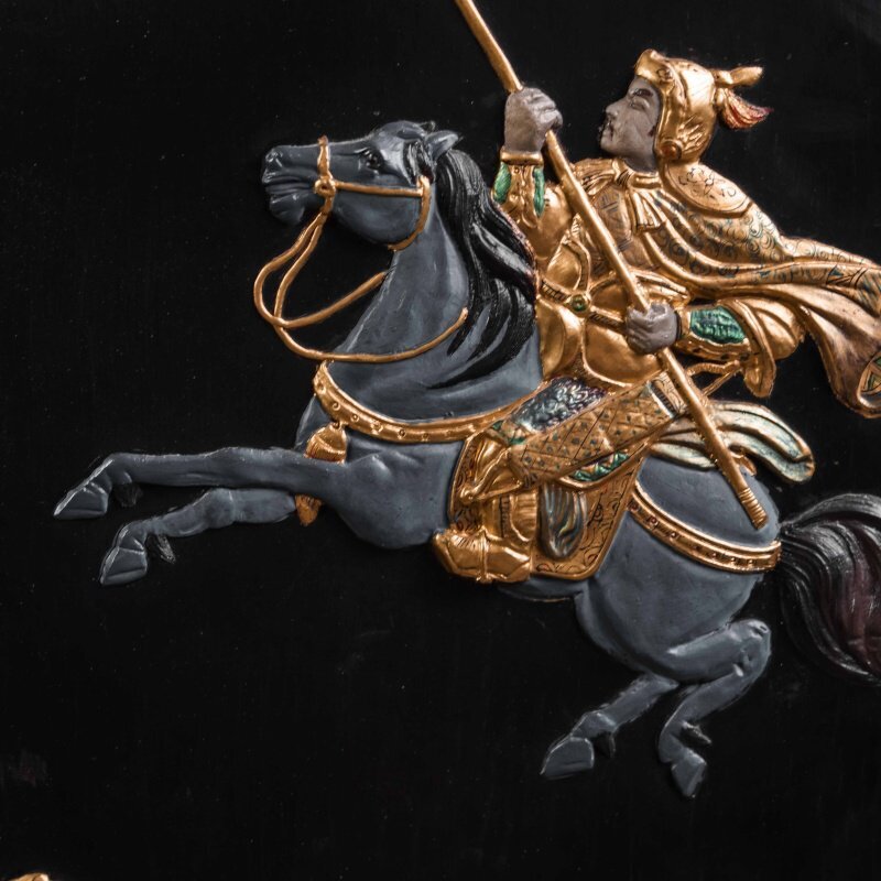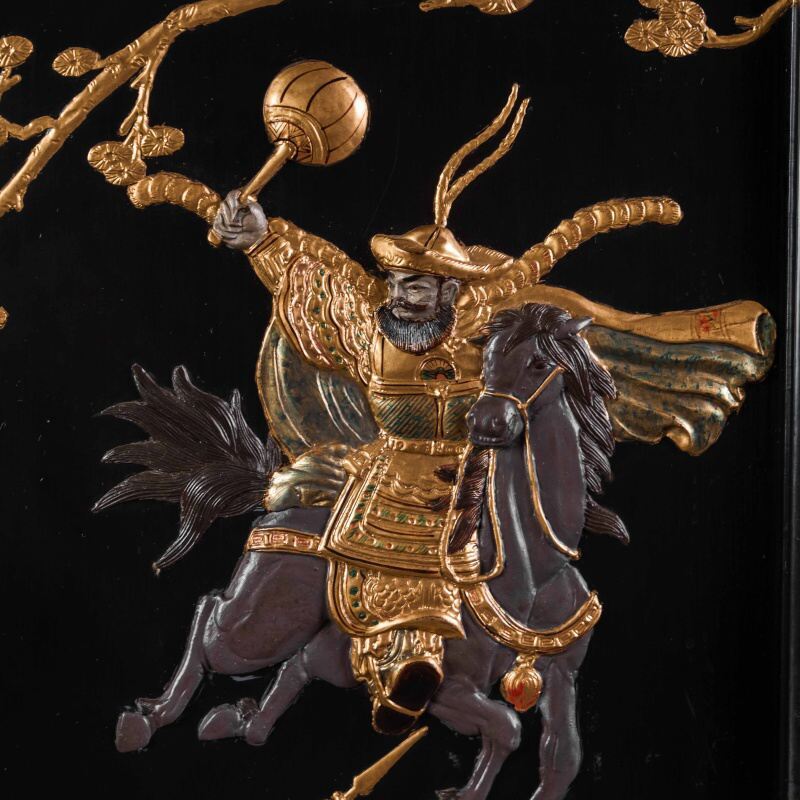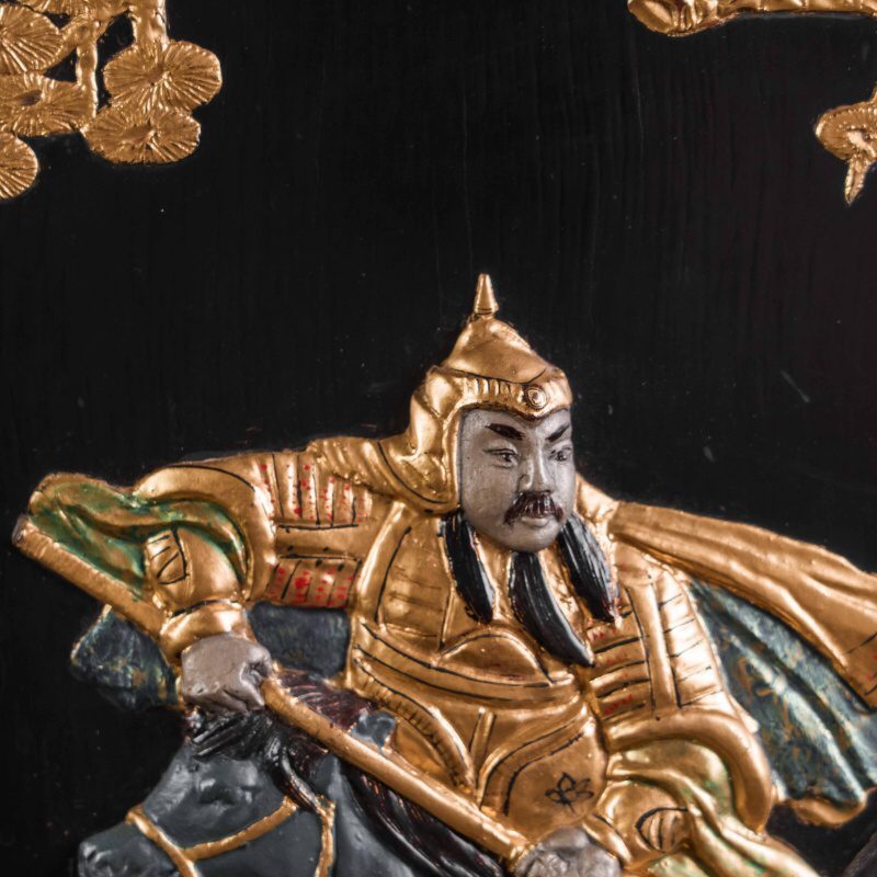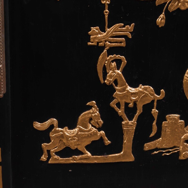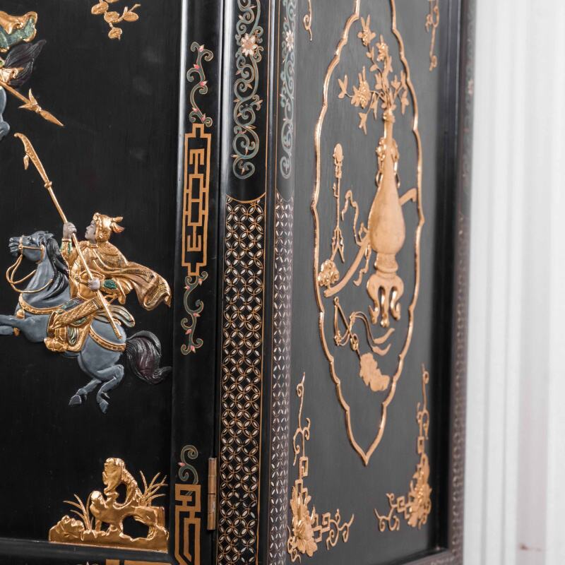 Этот антикварный шкаф выполнен в изысканном стиле Шинуазри — европейской интерпретации китайского декоративно-прикладного искусства, популярной в XVIII–XIX веках. Комод имеет строгие прямоугольные формы и стоит на изящных фигурных ножках с волнообразным основанием, что придаёт ему лёгкость и изысканность. Общий тон корпуса — глубокий чёрный лак, который создаёт контрастное и торжественное впечатление, идеально подчёркивая декоративные элементы. Главная особенность — богатое декоративное оформление в золотисто-бежевых тонах с инкрустациями. Поверхность комода украшена живописными панно с традиционными китайскими сценами, выполненными с высокой степенью детализации. Все изображения выполнены в технике лаковой росписи с золочением и перламутровыми вставками, создающими игру света и глубину изображения.