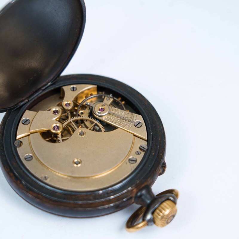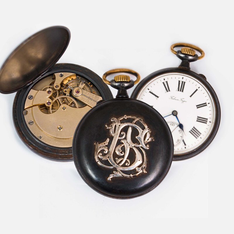 Старинные карманные часы «Павел Буре» Поставщик двора Величества. Производство: часовая мануфактура «Павелъ Буре» , Швейцария, рубеж XIX — ХХ веков. Анкерный механизм на рубинах. В часах этой марки часто использовались высококачественные швейцарские механизмы, в том числе от фабрики Longines. Завод головкой, перевод стрелок — кнопочный. Часы на ходу, в хорошем состоянии! Циферблат эмалевый с классическими стрелками, римские цифры черного цвета, малая секунда в положении цифры 6, секунды обозначены арабскими цифрами. Название марки «Павелъ Буре» в положении цифры 12. В большом корпусе из вороненой стали, с серебряной накладной вензель-монограмма, которая крепится на клёпках к внешней крышке.