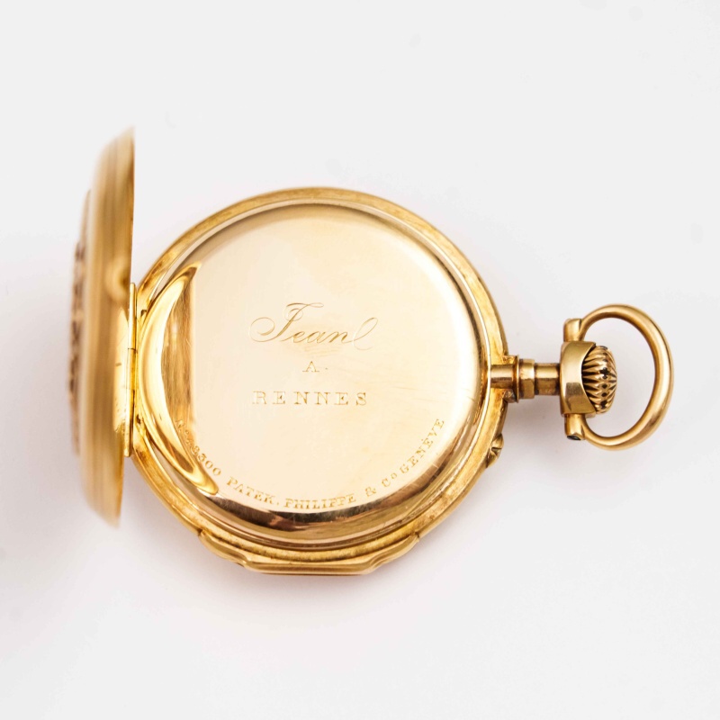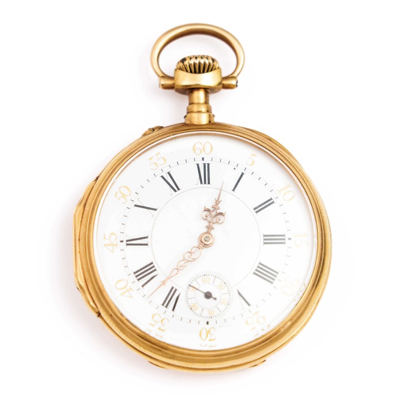 Классические карманные часы швейцарского часового бренда «Patek, Philippe & Cie». Исполненные на высочайшем уровне, карманные часы сочетают в себе типичные элементы стиля рубежа XIX—XX веков. Корпус золотой, клейма пробы 0,750, подтверждающее что корпус изготовлен из массивного золота 750 пробы. Механизм со швейцарским анкерным ходом на рубиновых камнях. Белый циферблат с черными римскими цифрами для обозначения часов (I-XII) и арабскими золотыми цифрами (5-60) для обозначения минут. Изящные золотистые стрелки, так же демонстрируют высокое мастерство и внимание к деталям. Малая секунда в положении цифры 6.