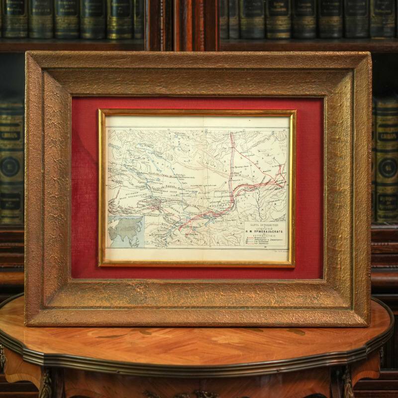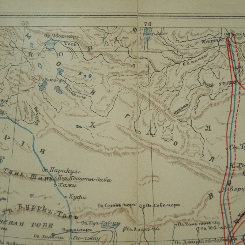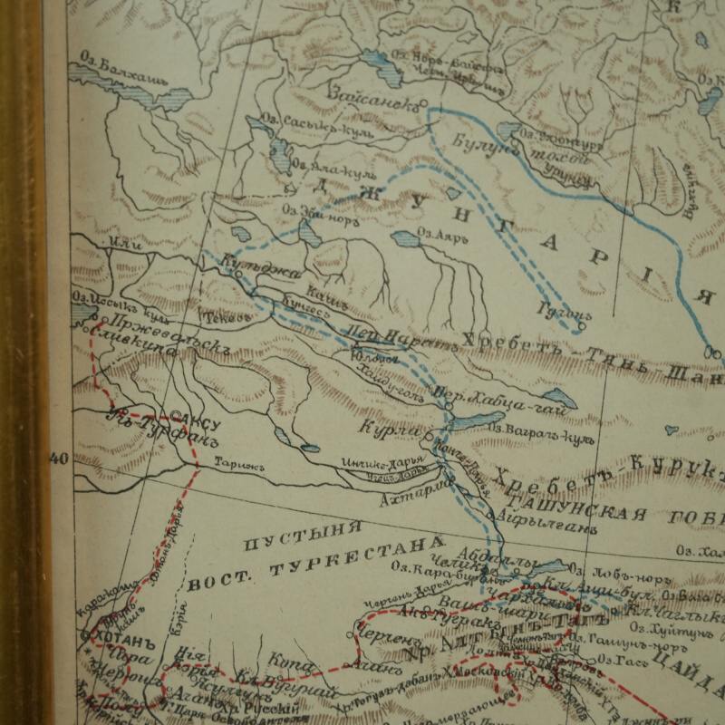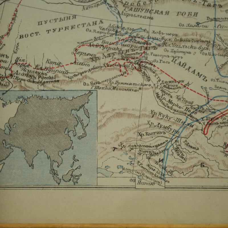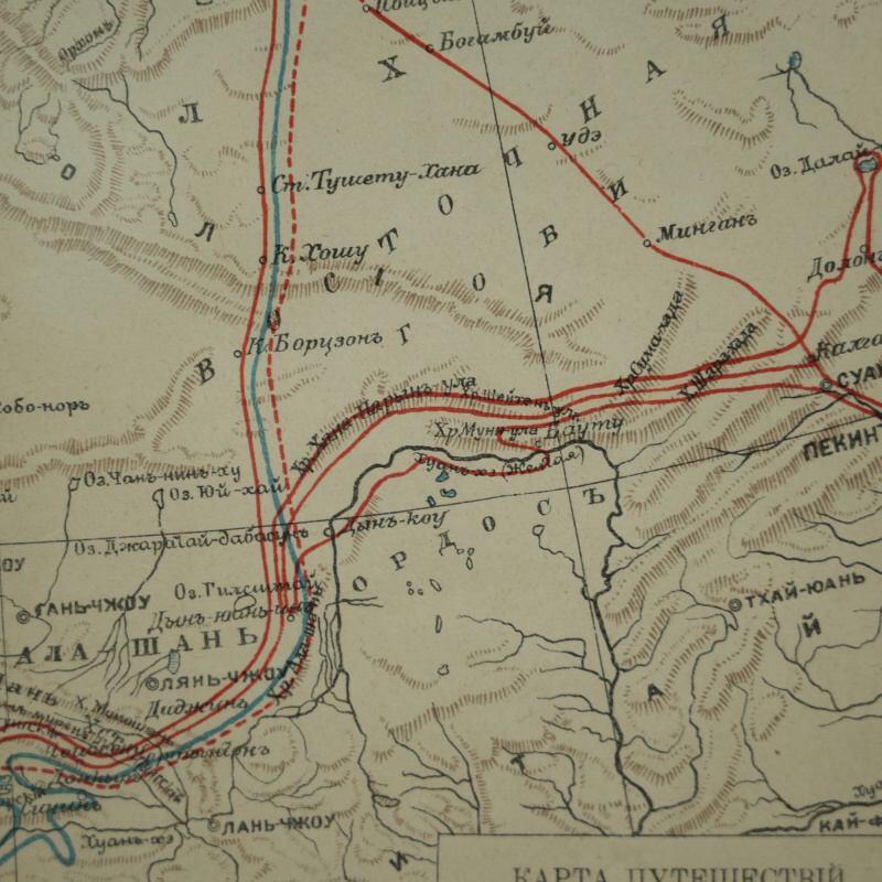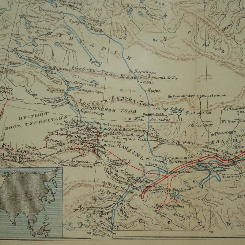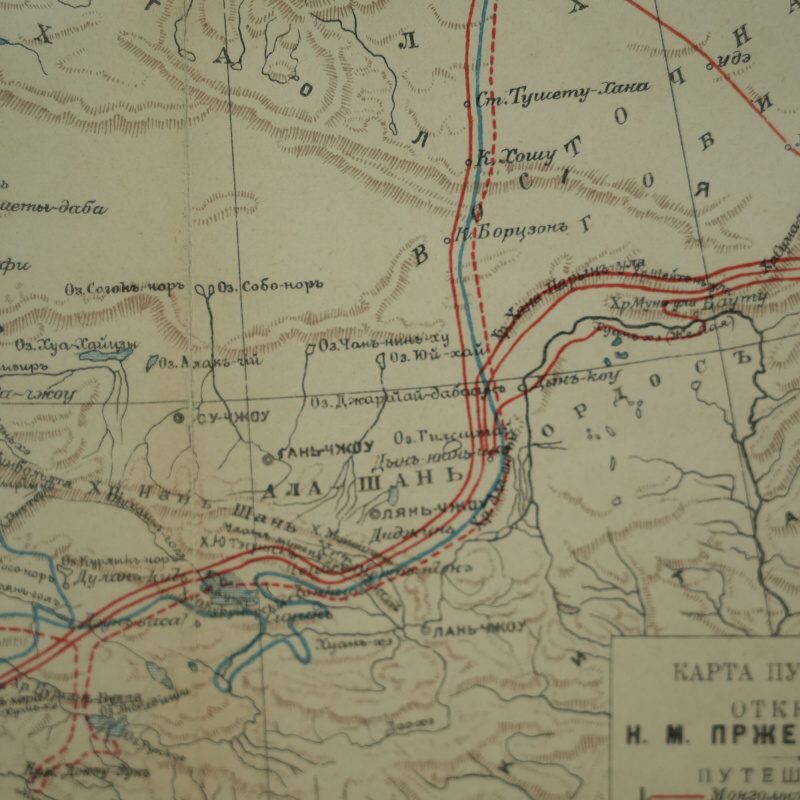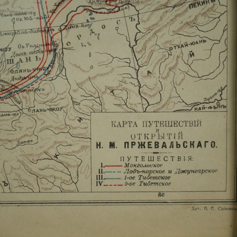 Карта из издания «Путешествия и открытия Н. М. Пржевальского» под редакцией П. П. Сойкина, опубликованная в 1899 году, иллюстрирует маршруты четырех экспедиций Николая Михайловича Пржевальского, выдающегося русского путешественника и исследователя Центральной Азии. Карта включает маршруты, по которым исследователь проходил с 1871 по 1885 годы, и содержит данные о географических особенностях, таких как реки, горы, пустыни и значимые населенные пункты, расположенные на пути его экспедиций.