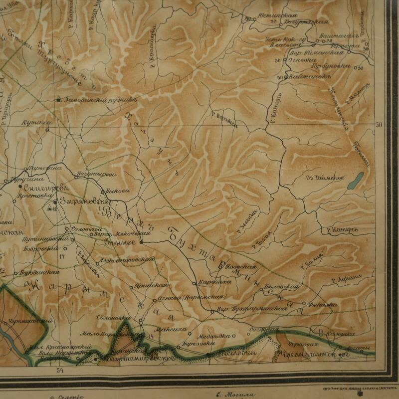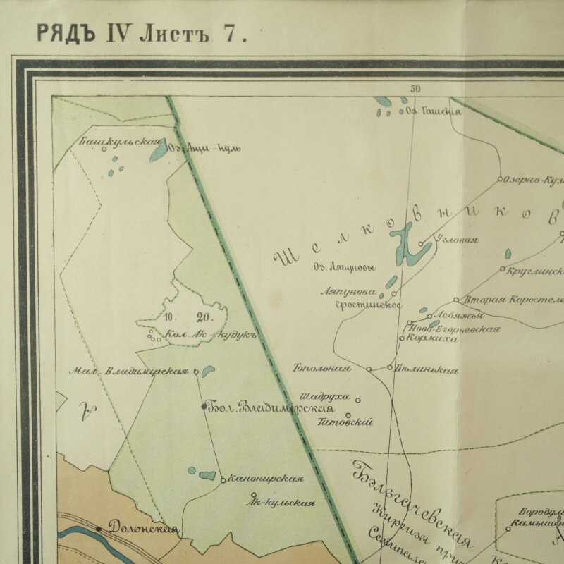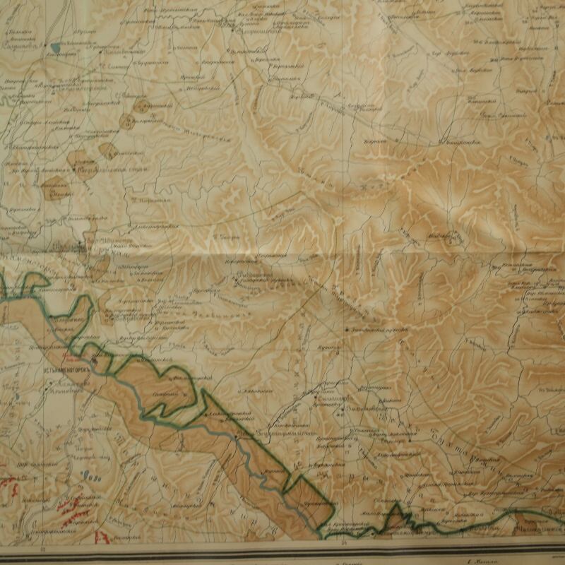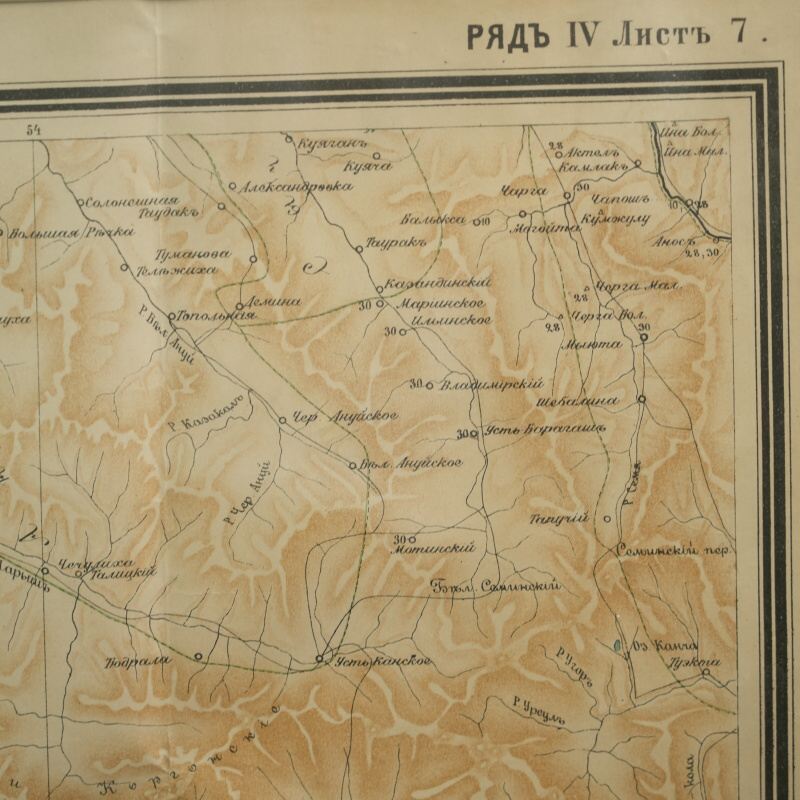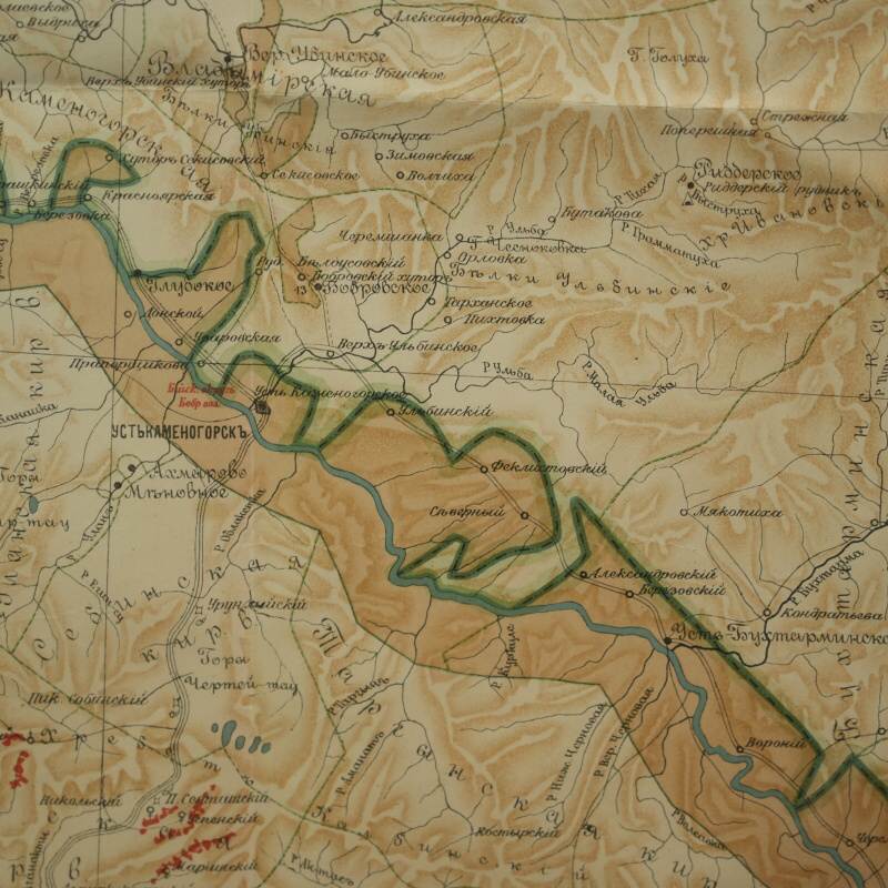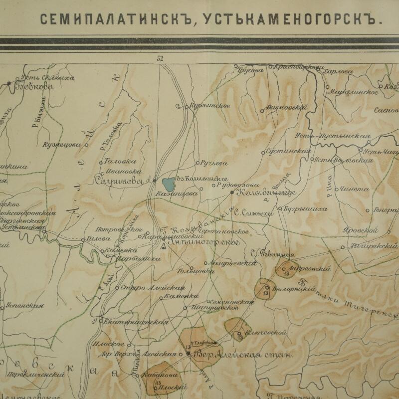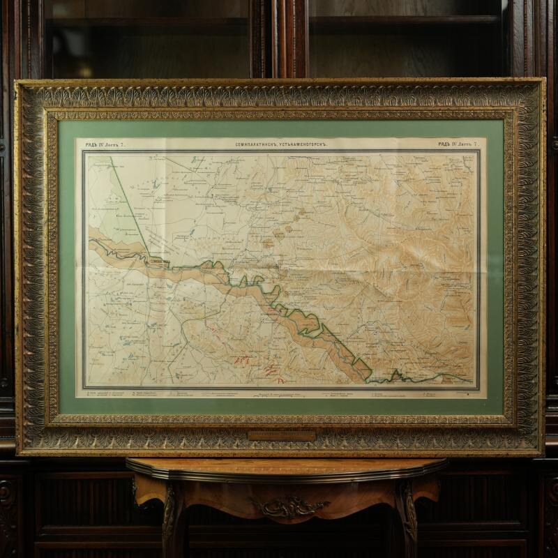 Подлинная топографическая карта охватывает территорию между городами Семипалатинск (ныне Семей) и Усть-Каменогорск (ныне Өскемен), лежащую вдоль течения реки Иртыш. Лист принадлежит к ряду IV, листу 7 из крупномасштабной серии имперских карт, составленных в конце XIX — начале XX века и напечатанных в одном из ведущих картографических центров Российской империи — Картографическом заведении А. Ильина в Санкт-Петербурге. На карте с высокой точностью переданы русла рек Иртыш, Бухтарма, Уба, Ульба, озёра и горные хребты Восточного Казахстана. Изображены многочисленные сёла и станицы (Семипалатинская, Верх-Алексеевская, Александровская, Казанцево, Белокаменская, Кузнецова и др.), а также казахские аулы и зимовки, отмеченные по волостному делению. Подобные карты создавались в рамках масштабной программы топографических съёмок Туркестанского и Сибирского краёв, проводившихся под эгидой Военно-топографического депо и частных геодезических заведений.