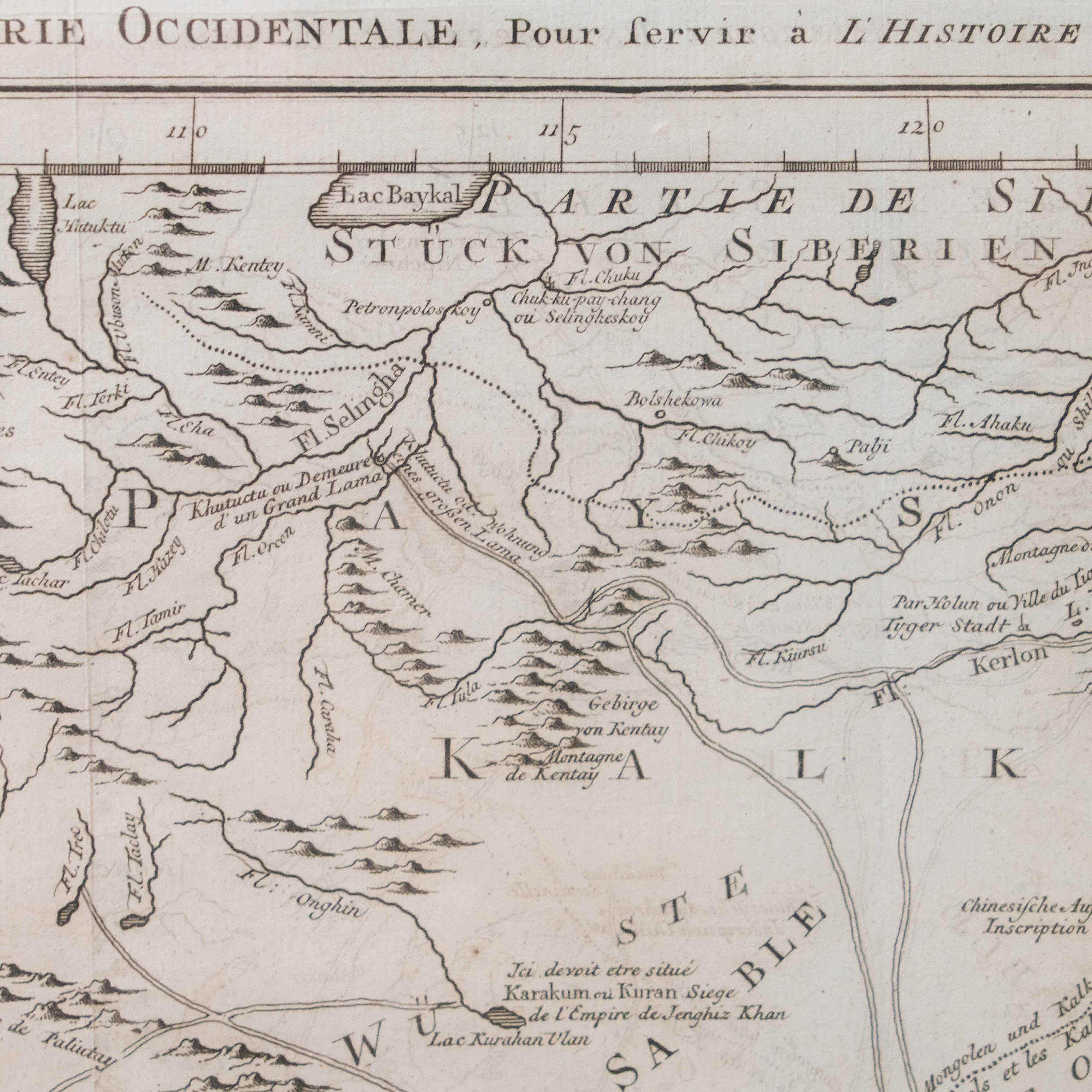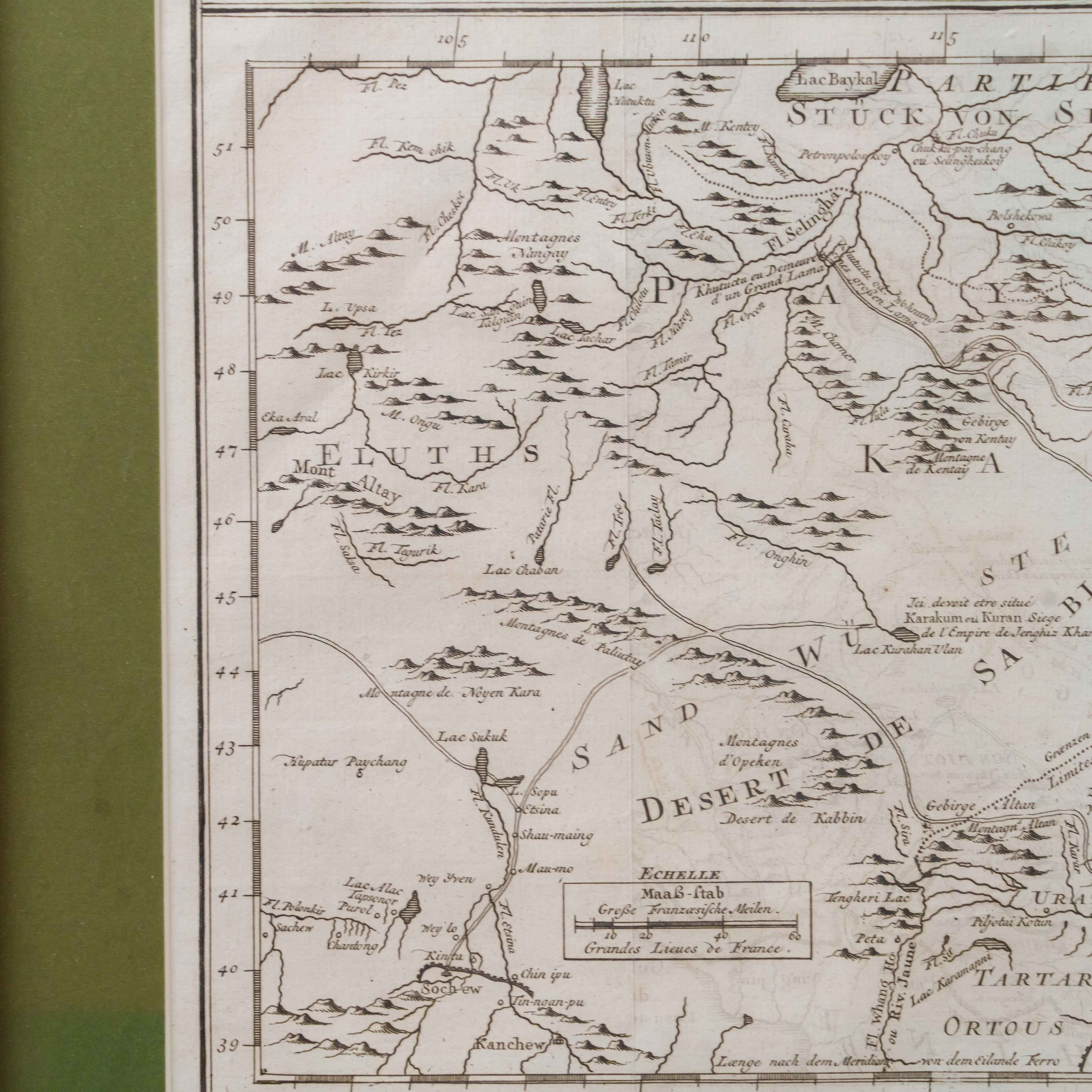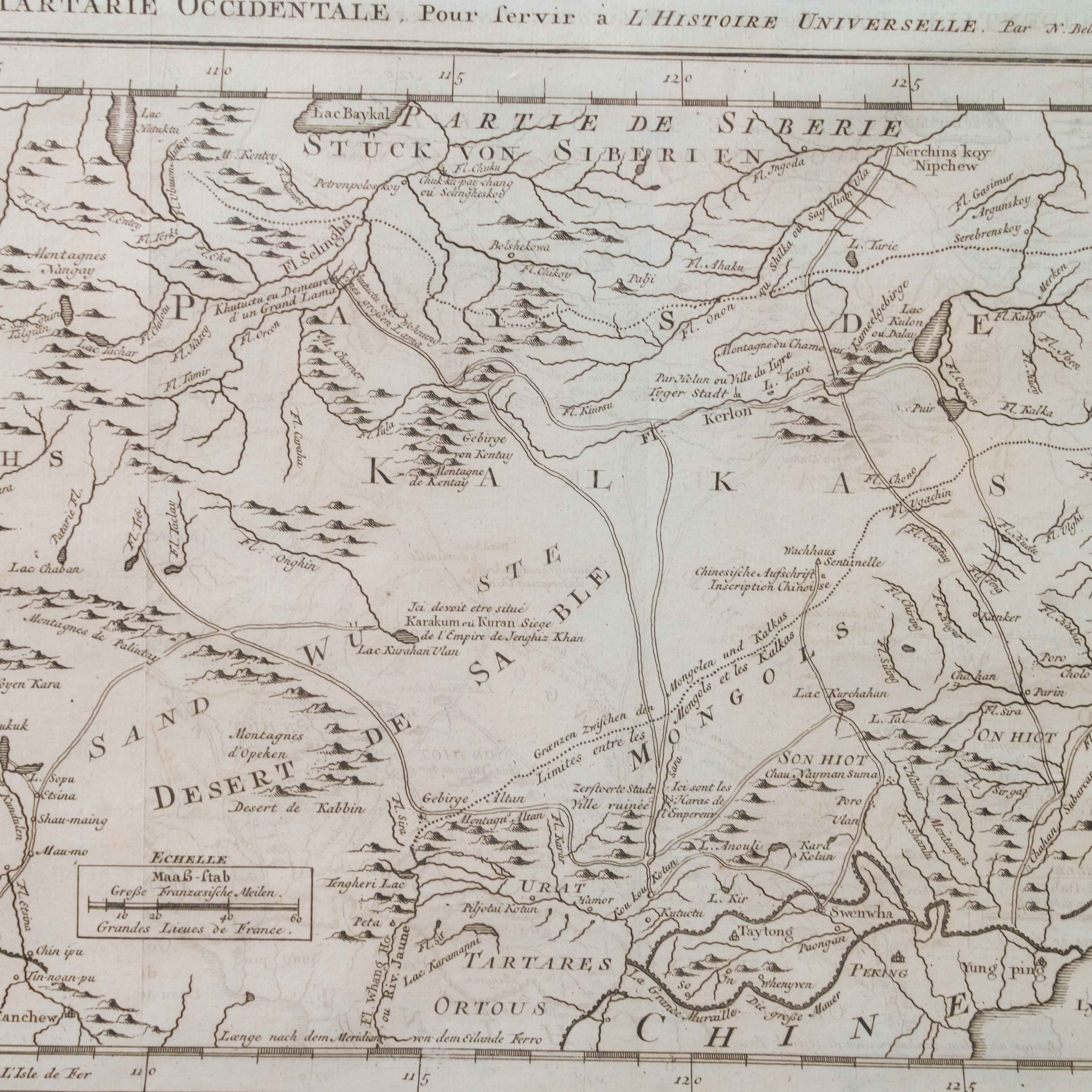Карта была создана выдающимся инженером-гидрографом Жаком-Николя Беллин, служившим при Морском министерстве Франции. На карте изображены обширные территории Центральной Азии – Западная Тартария, включавшая земли Казахского ханства, Джунгарии, Западного Китая и Южной Сибири. В верхней части обозначено озеро Байкал (Lac Baykal), далее к западу – горы Алтай (Mont Altay) и реки Селенга (Fl. Selinga) и другие. В центре карты показаны земли Кал-мыков (Kalkas) и Элутов (Eluths) – то есть джунгар и ойратов, а южнее Песчаная пустыня (Desert de Sable). В нижней части отмечены области Тартарии Ортус (Tartares Ortous), Монголия (Mon-gols) и Китай (Chine), с указанием древних городов Пекин (Peking) и Датун (taytong), а также побережья залива Ляодун (Golphe de Lyau-tong).