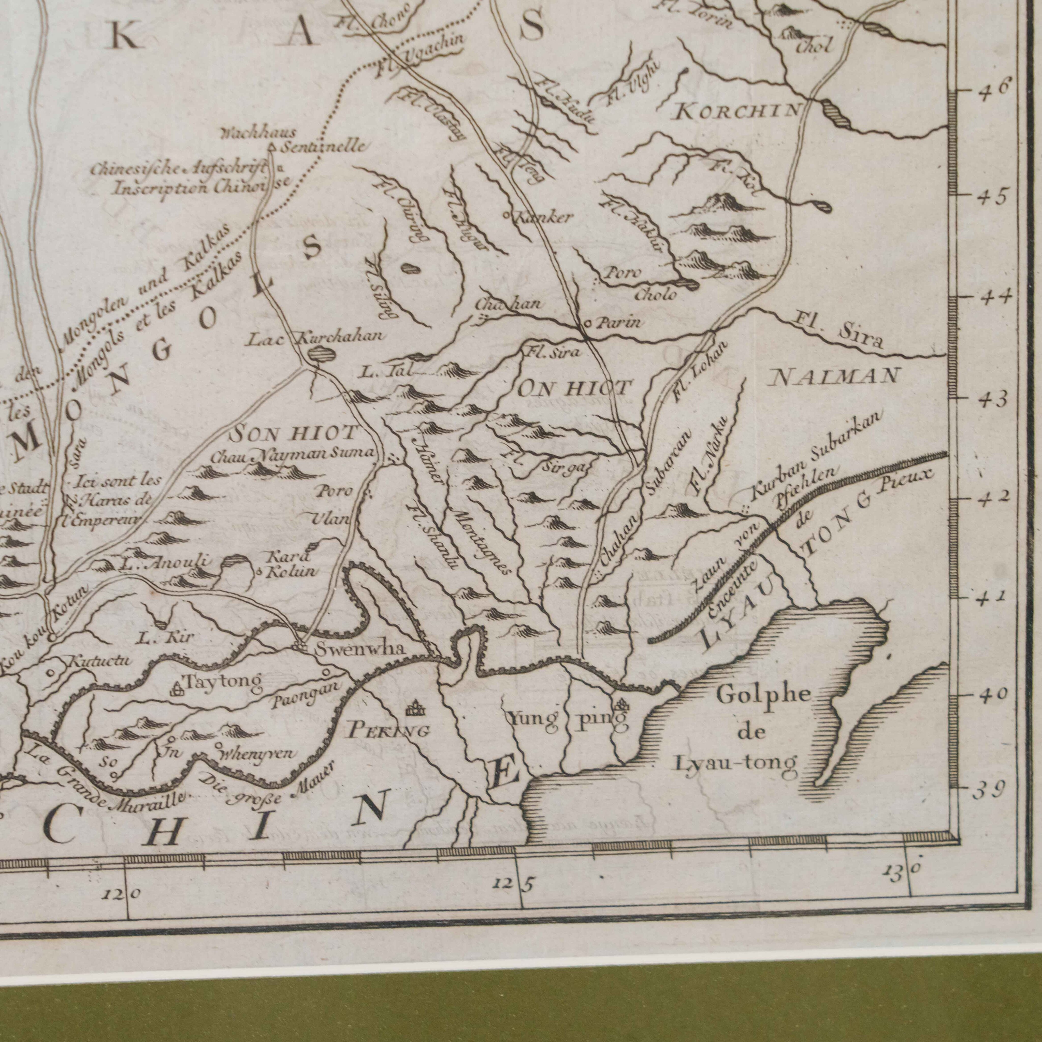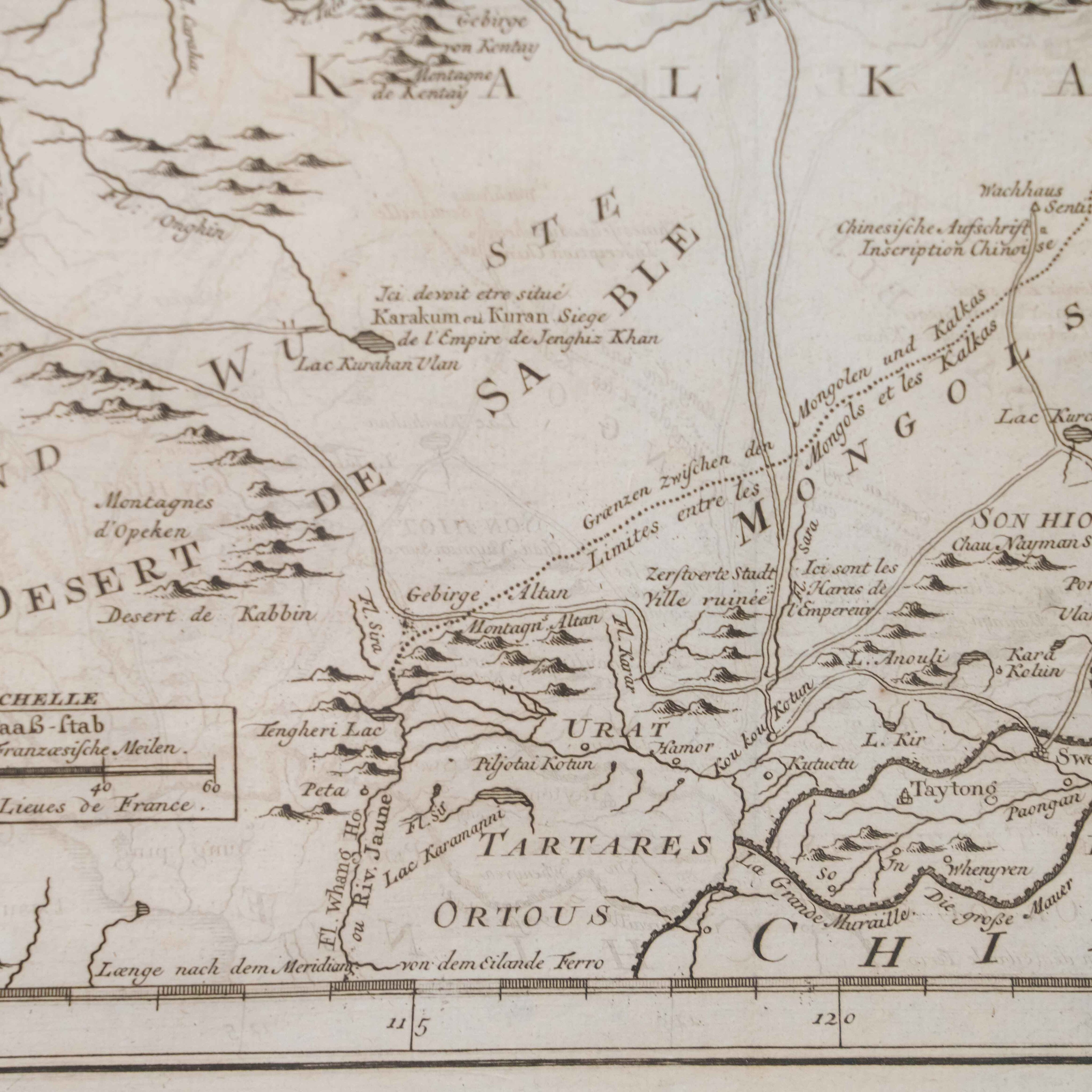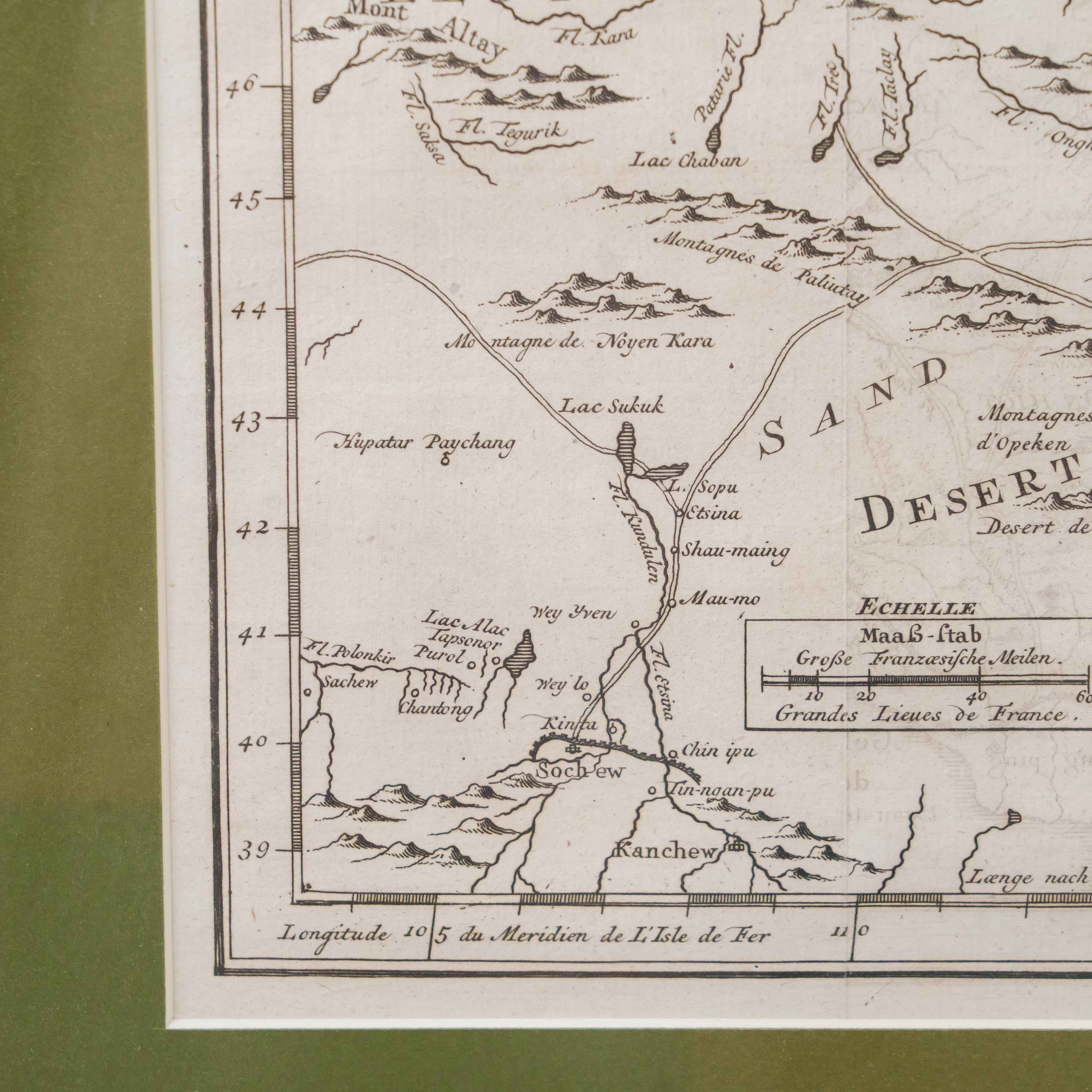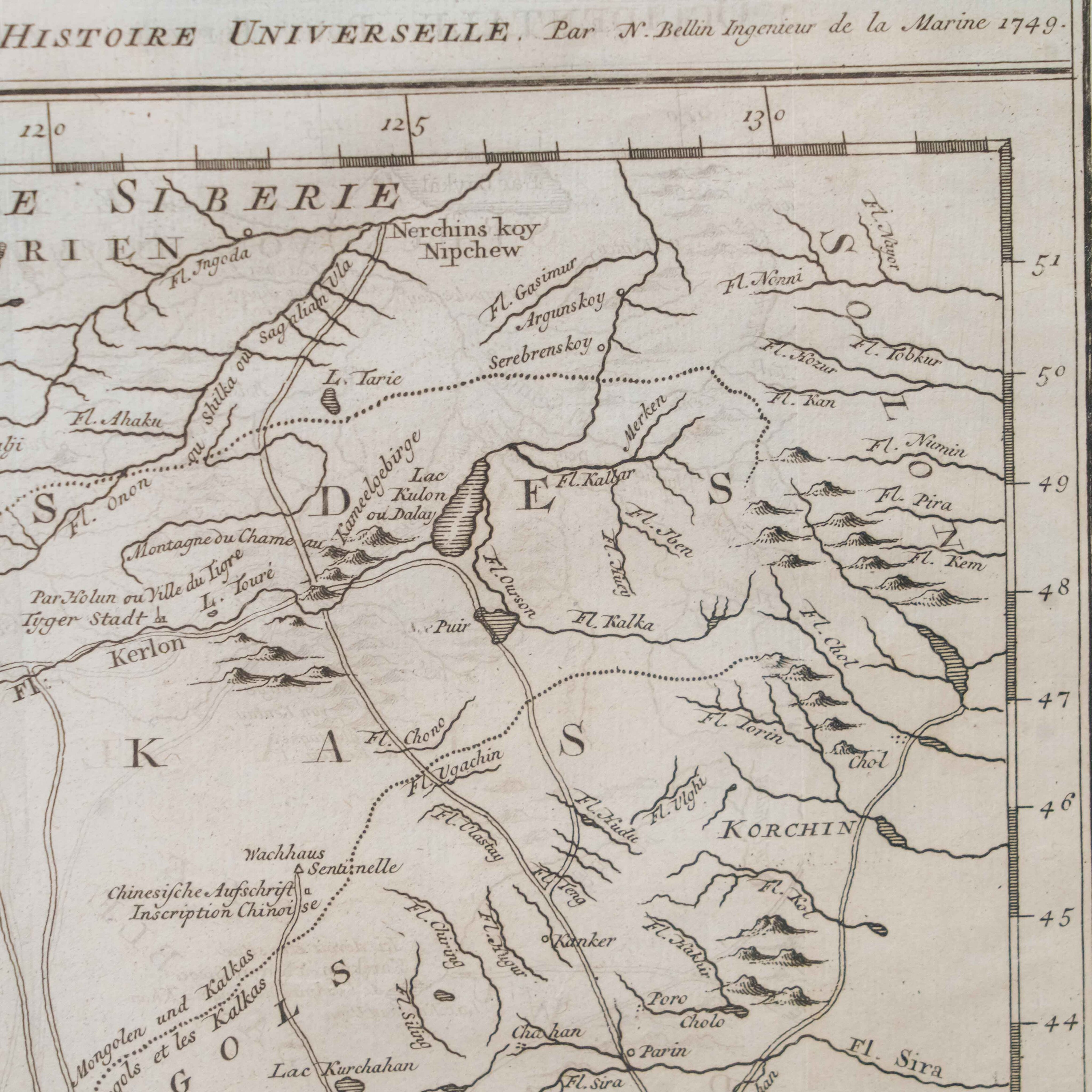 Карта была создана выдающимся инженером-гидрографом Жаком-Николя Беллин, служившим при Морском министерстве Франции. На карте изображены обширные территории Центральной Азии – Западная Тартария, включавшая земли Казахского ханства, Джунгарии, Западного Китая и Южной Сибири. В верхней части обозначено озеро Байкал (Lac Baykal), далее к западу – горы Алтай (Mont Altay) и реки Селенга (Fl. Selinga) и другие. В центре карты показаны земли Кал-мыков (Kalkas) и Элутов (Eluths) – то есть джунгар и ойратов, а южнее Песчаная пустыня (Desert de Sable). В нижней части отмечены области Тартарии Ортус (Tartares Ortous), Монголия (Mon-gols) и Китай (Chine), с указанием древних городов Пекин (Peking) и Датун (taytong), а также побережья залива Ляодун (Golphe de Lyau-tong).