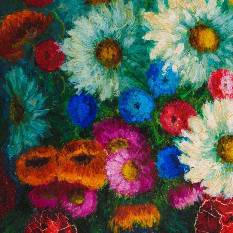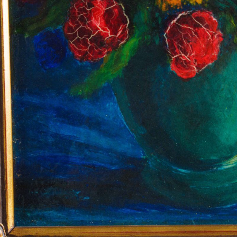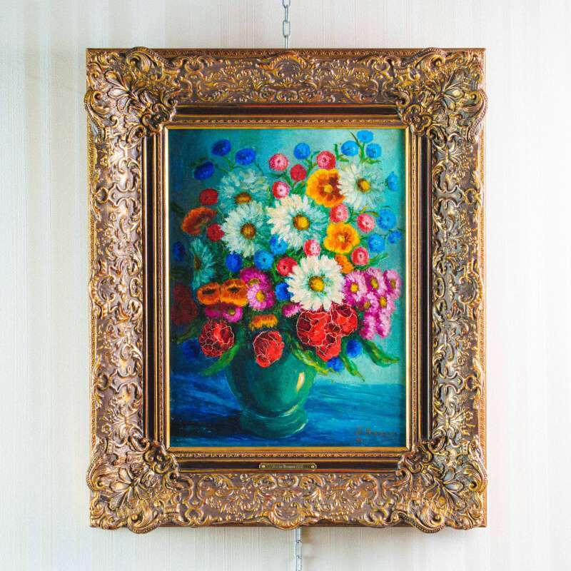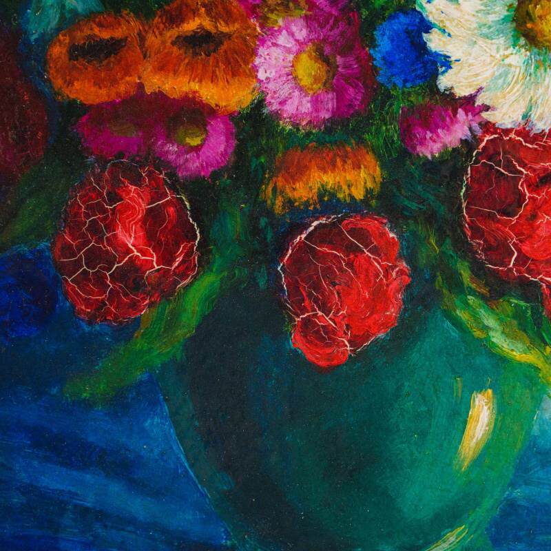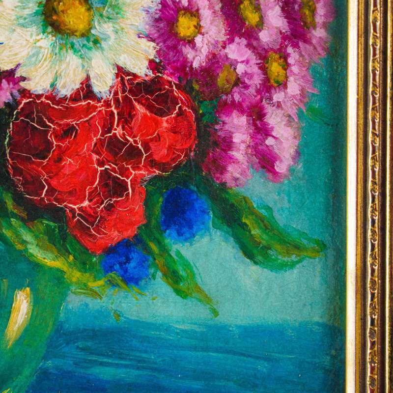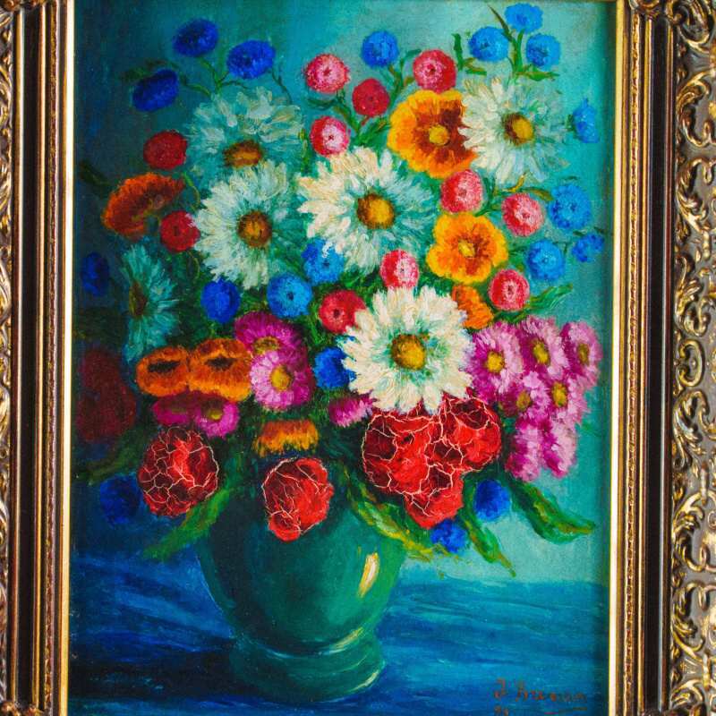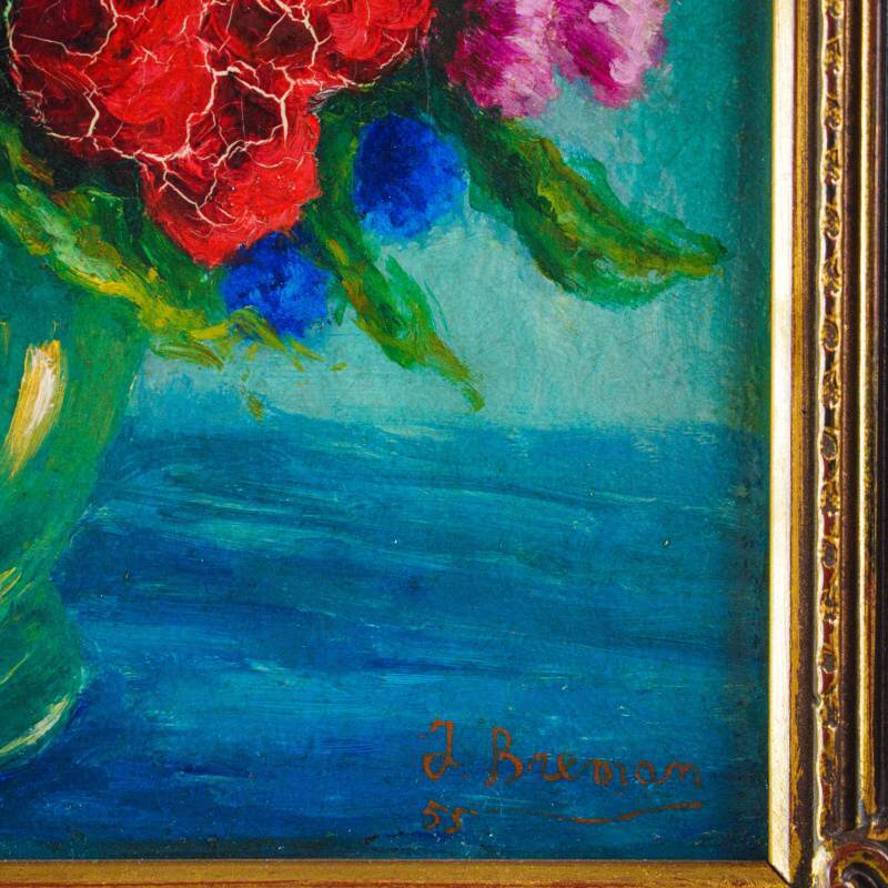 Представлена картина с условным названием «Букет садовых цветов в вазе» известной бельгийской художницы Josine Breman. Авторская подпись, подтверждающая подлинность картины, находится справа внизу.
