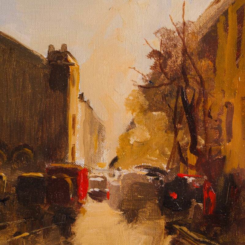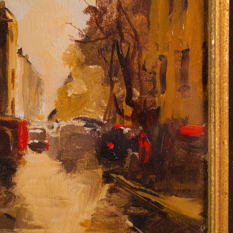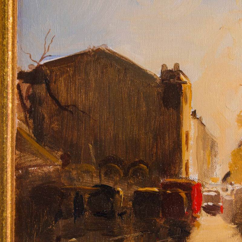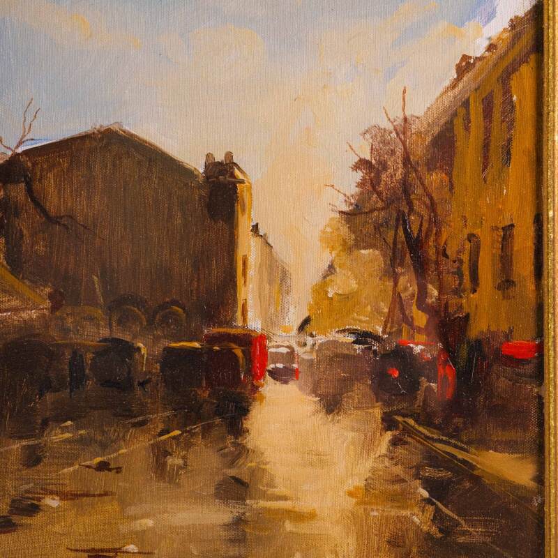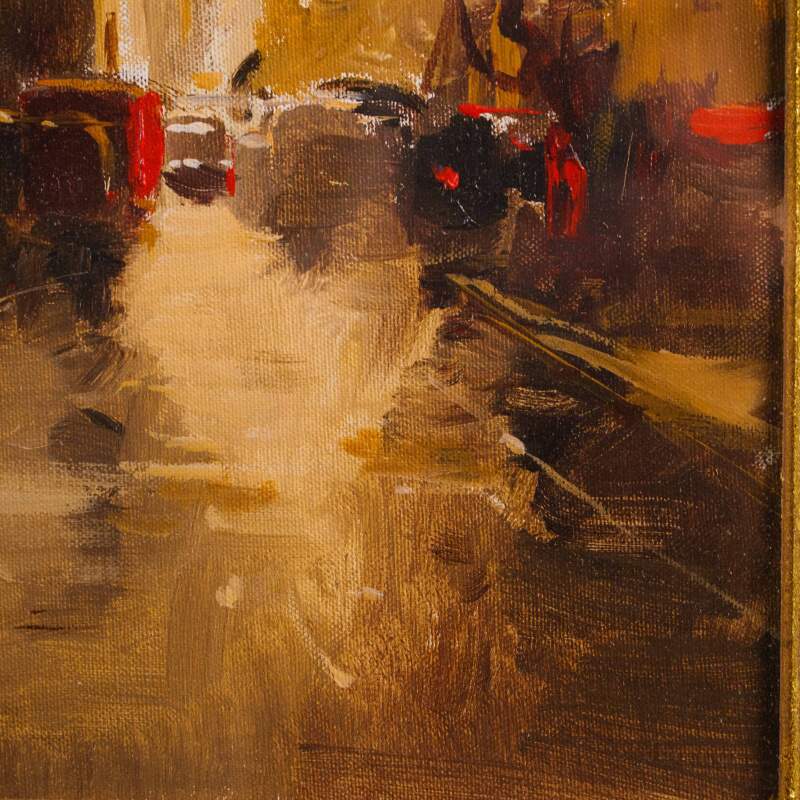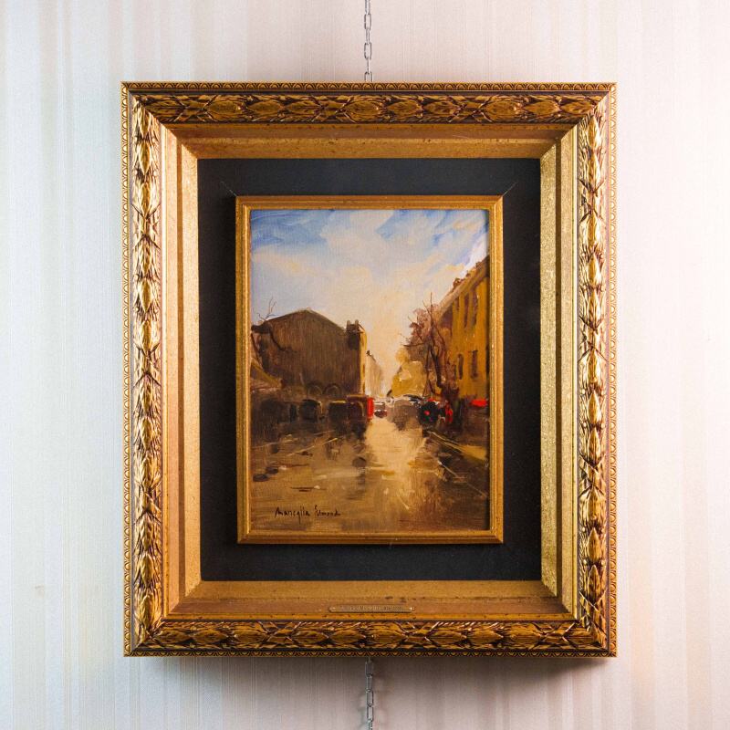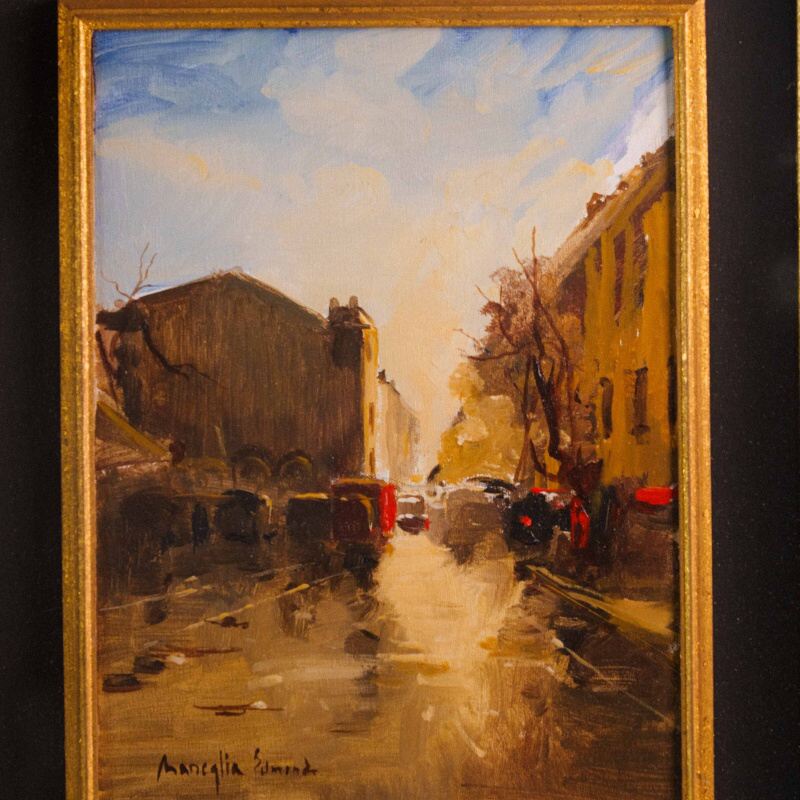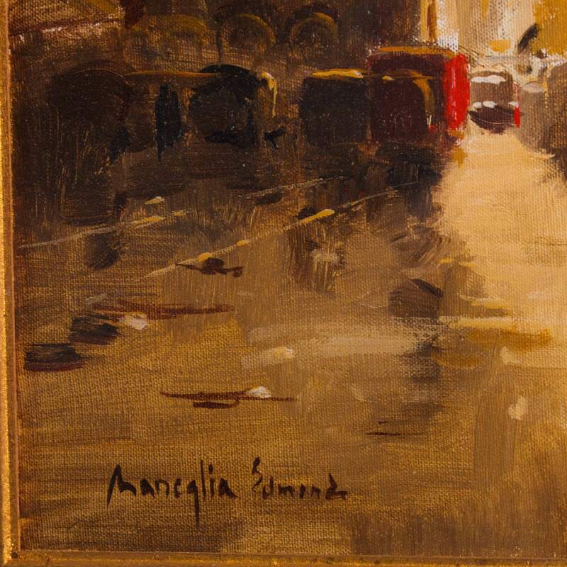 Представлена картина с условным названием «Город на закате известного итальянского художника Edmondo Maneglia. Авторская подпись, подтверждающая подлинность картины, находится внизу слева. На обороте картины стоит название картины «Tramonte in citta”.