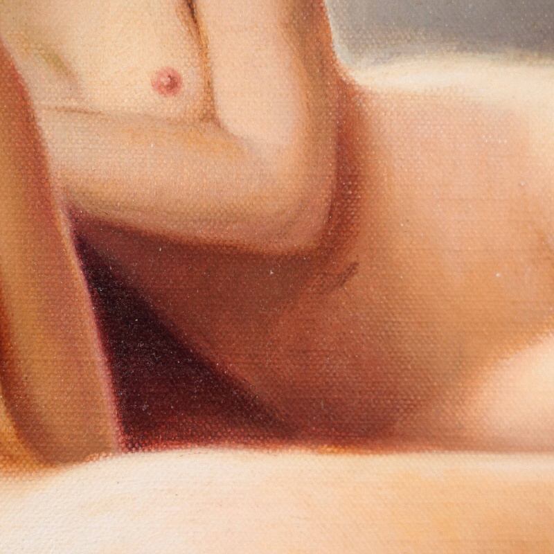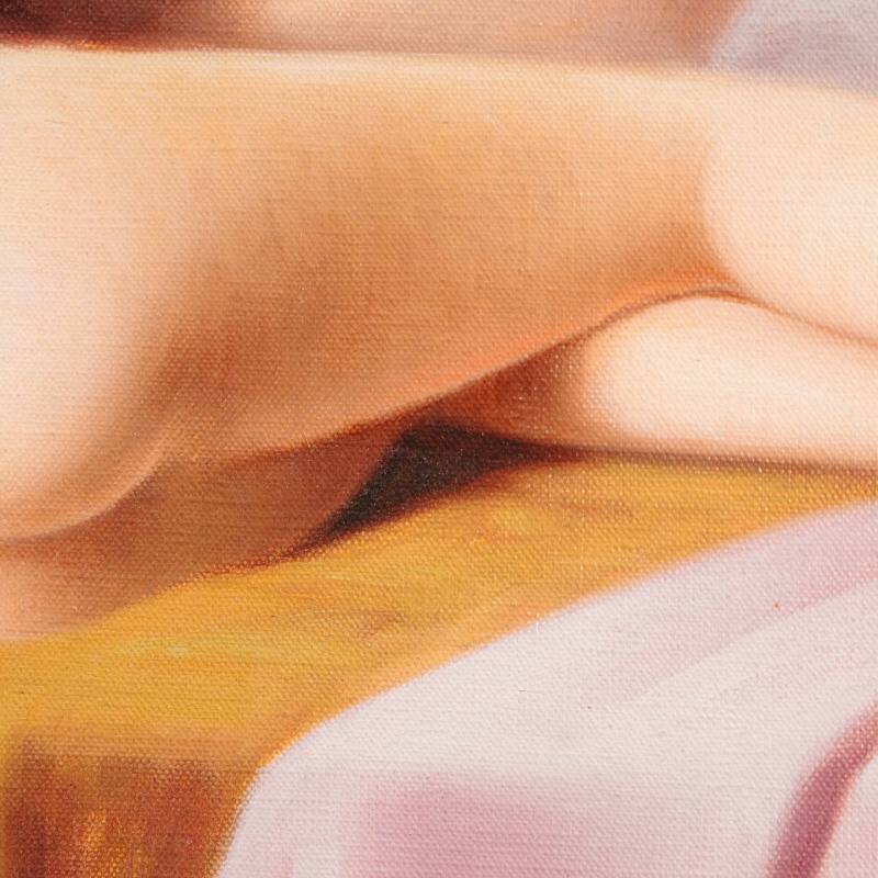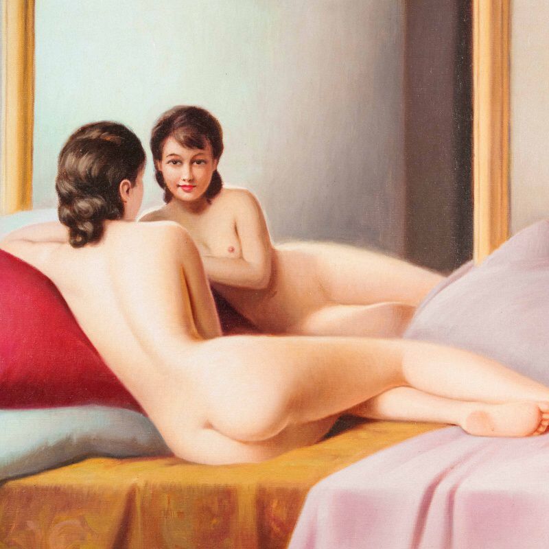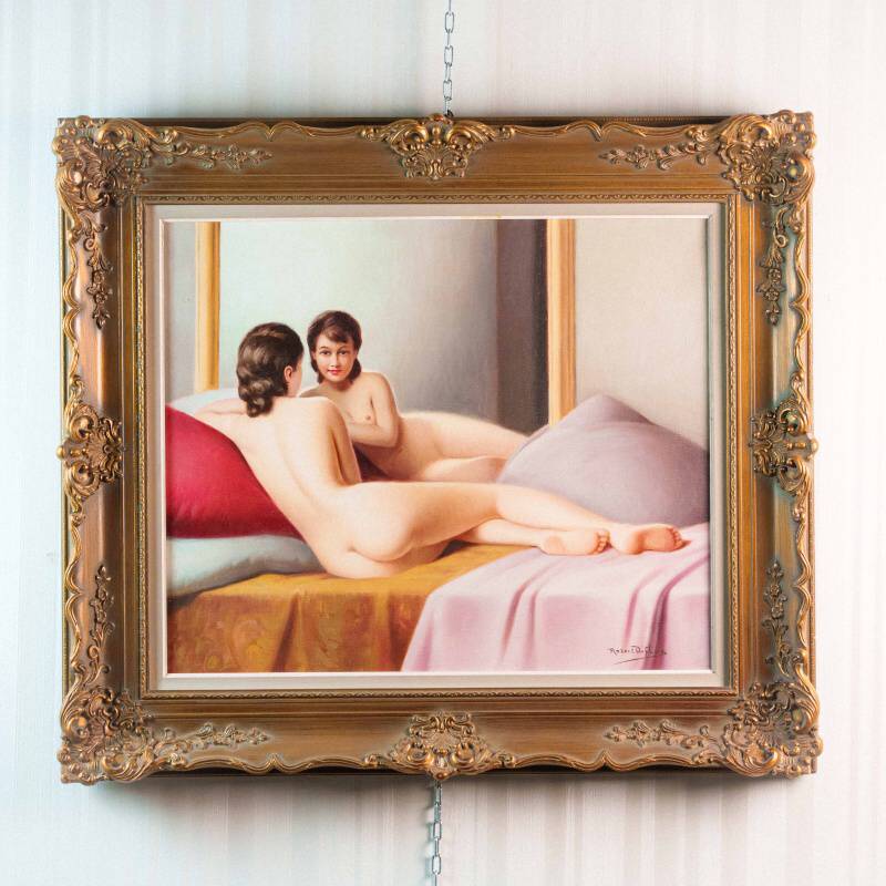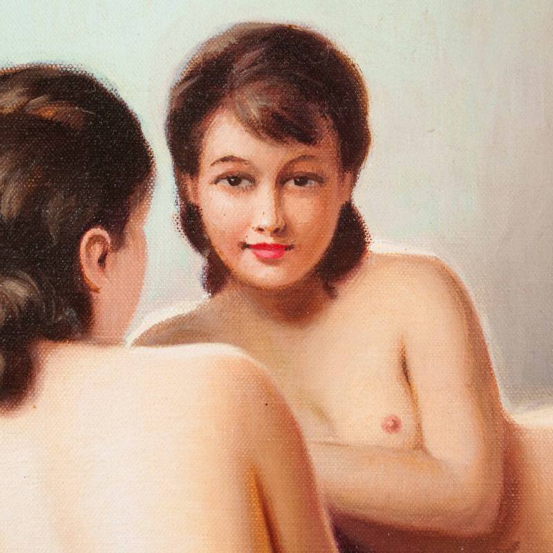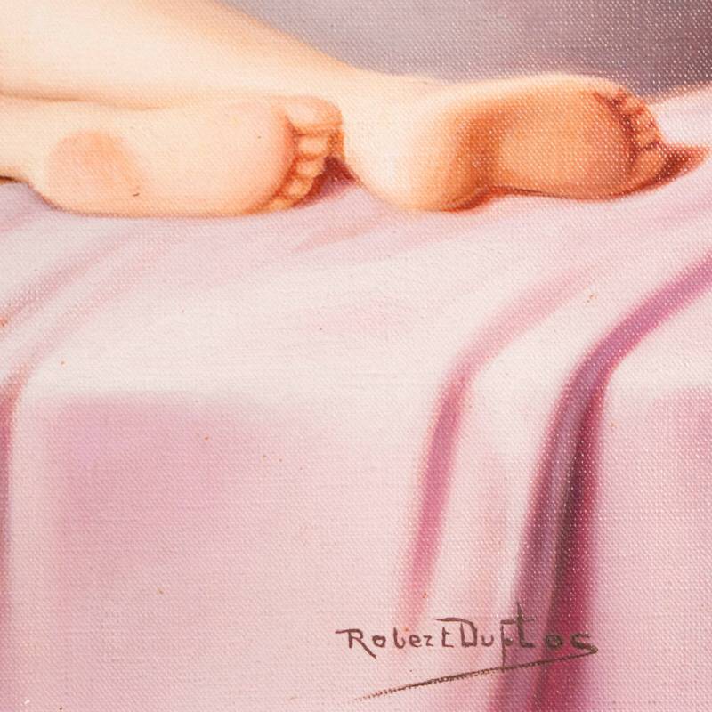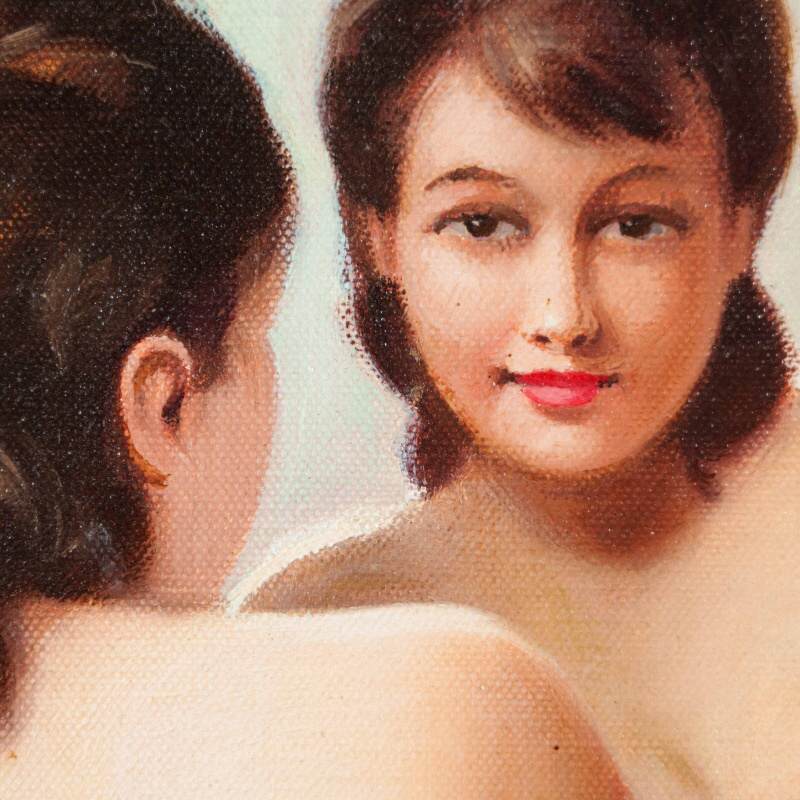 Представлена красивая картина с условным названием «Отражение в зеркале» известного французского художника Robert Louis Raymond Duflos. Авторская подпись, подтверждающая подлинность картины, находится внизу справа.