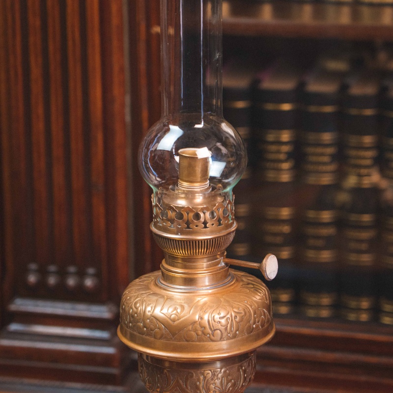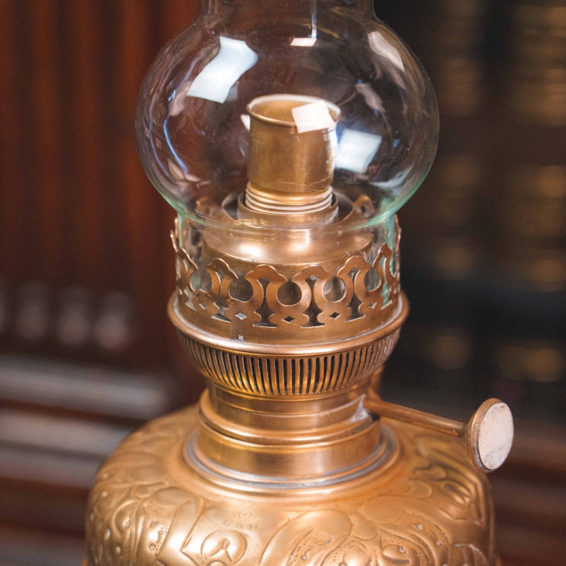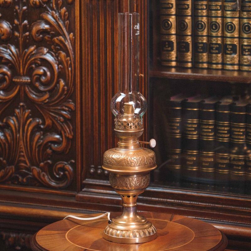 Благодаря электрификации лампа сочетает в себе атмосферу старинного освещения и удобство повседневной эксплуатации. Тёплый блеск латуни и винтажный силуэт делают её выразительным элементом интерьера.