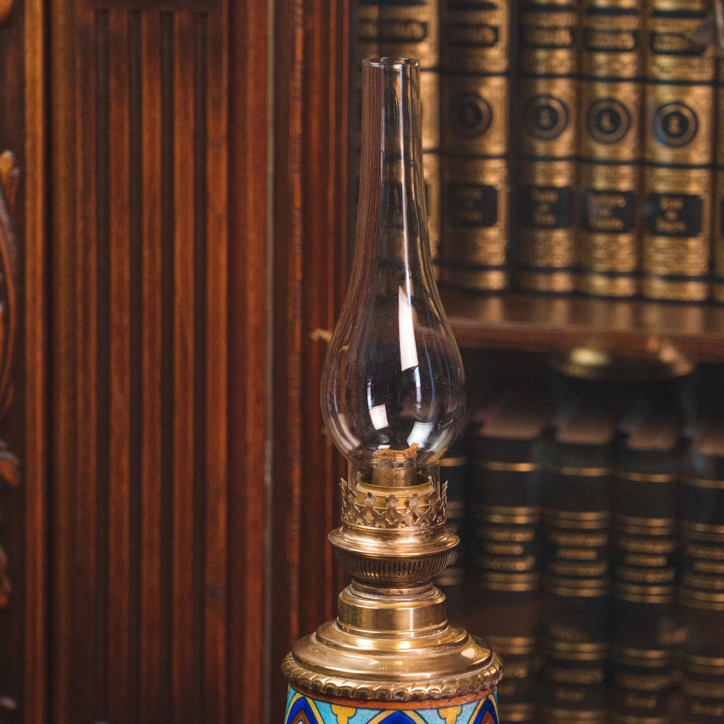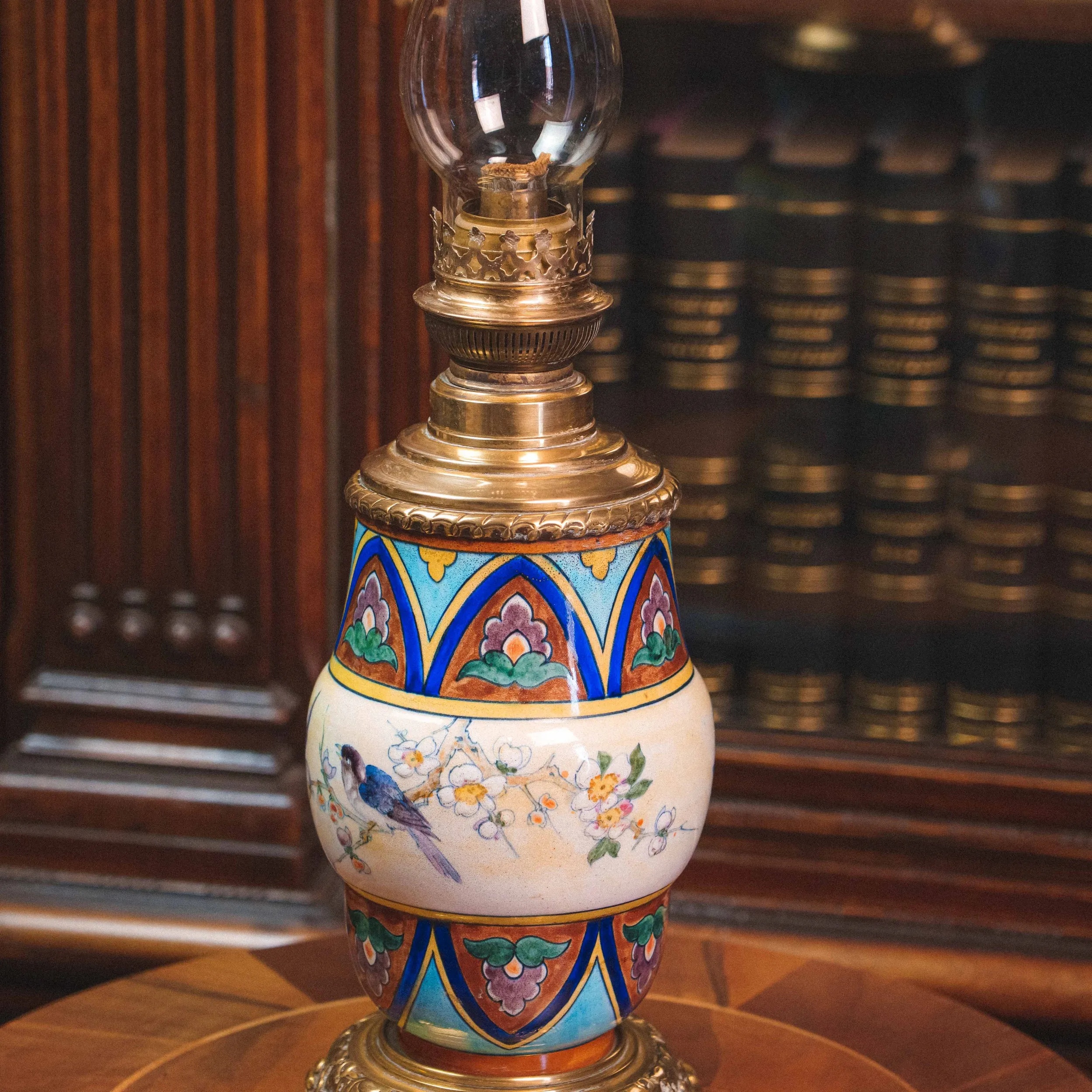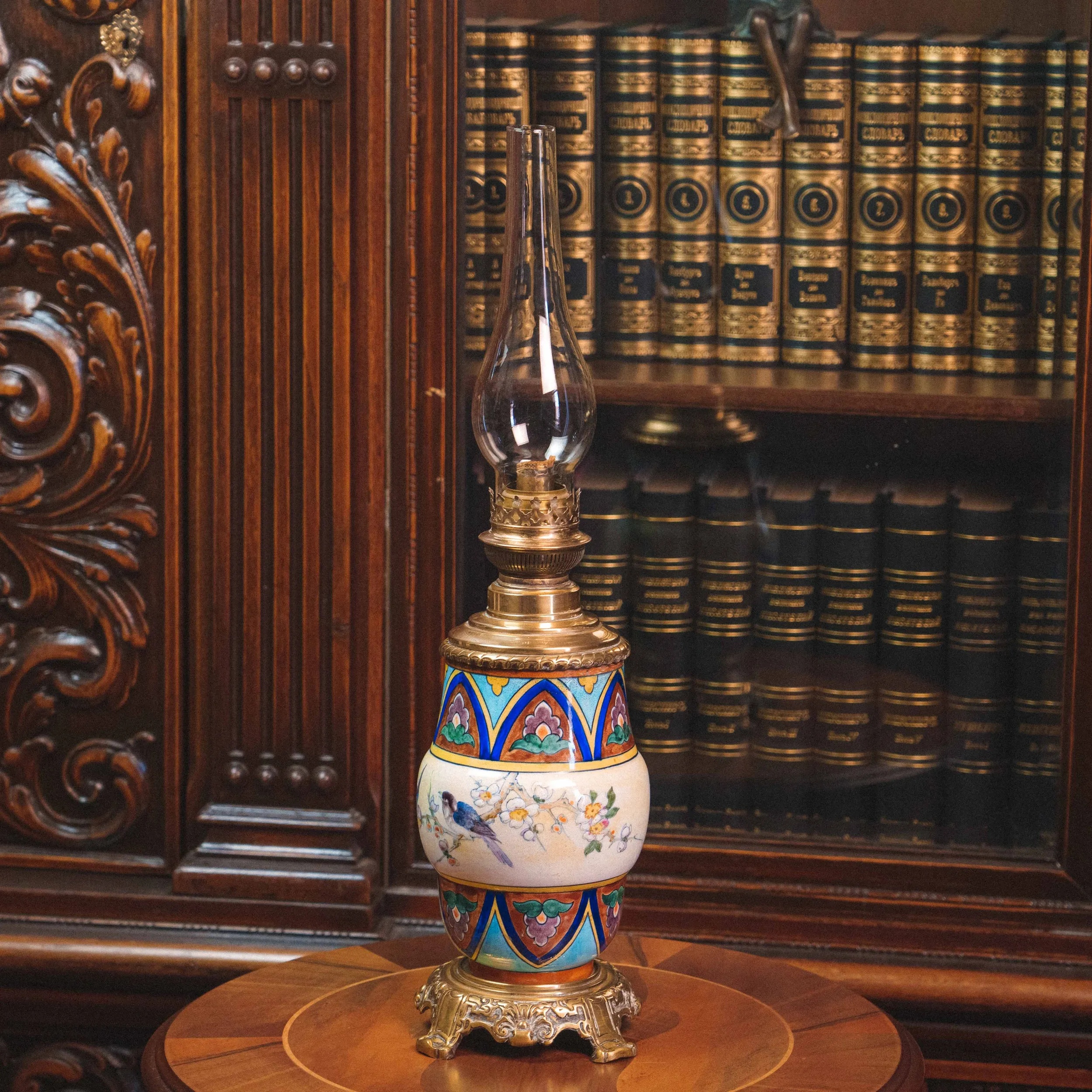 Элегантная керосиновая лампа с декоративным фарфоровым резервуаром и латунными элементами. Основание украшено яркой художественной росписью с цветочными мотивами и орнаментальными вставками в насыщенных синих и золотистых тонах.