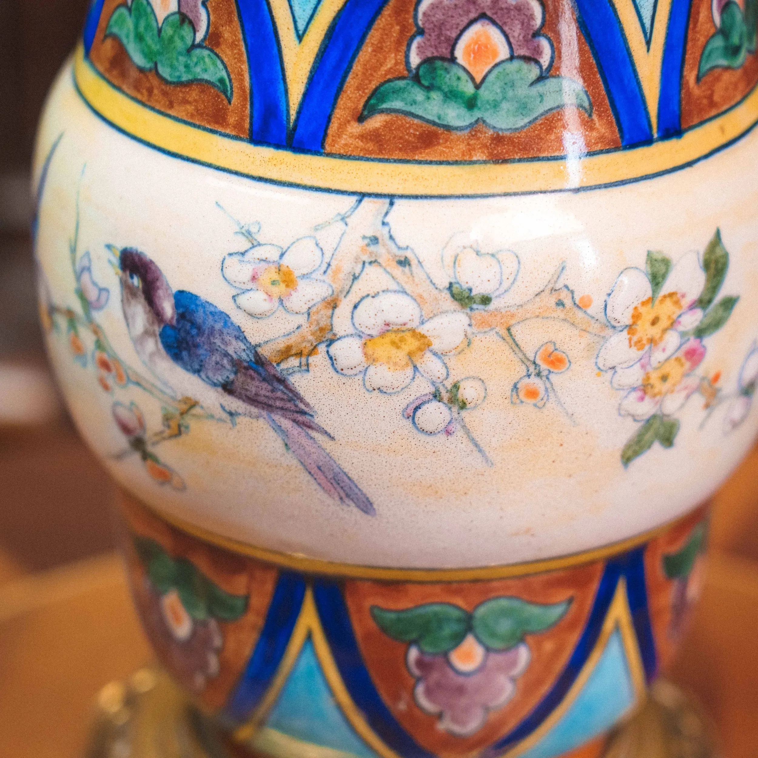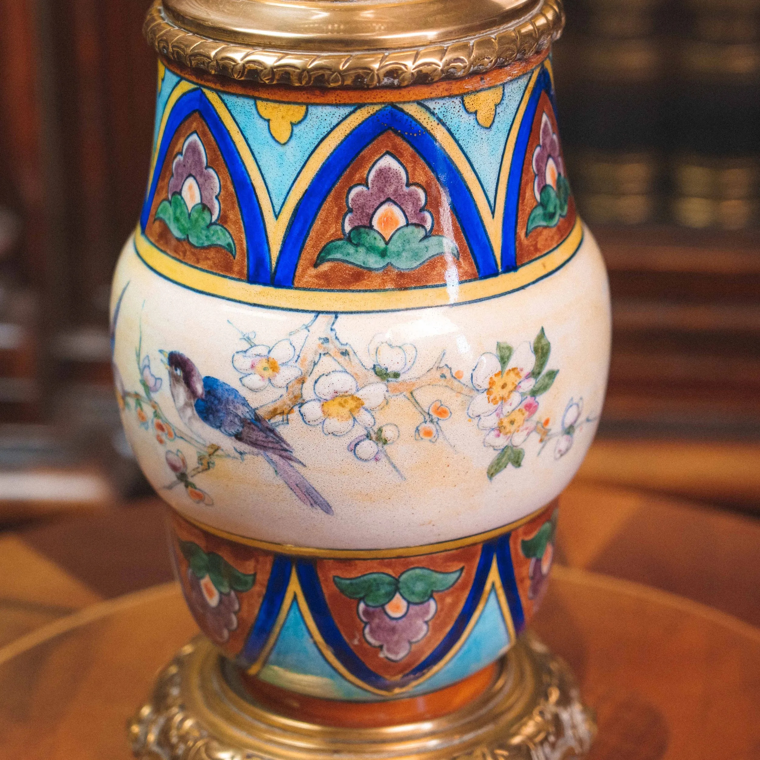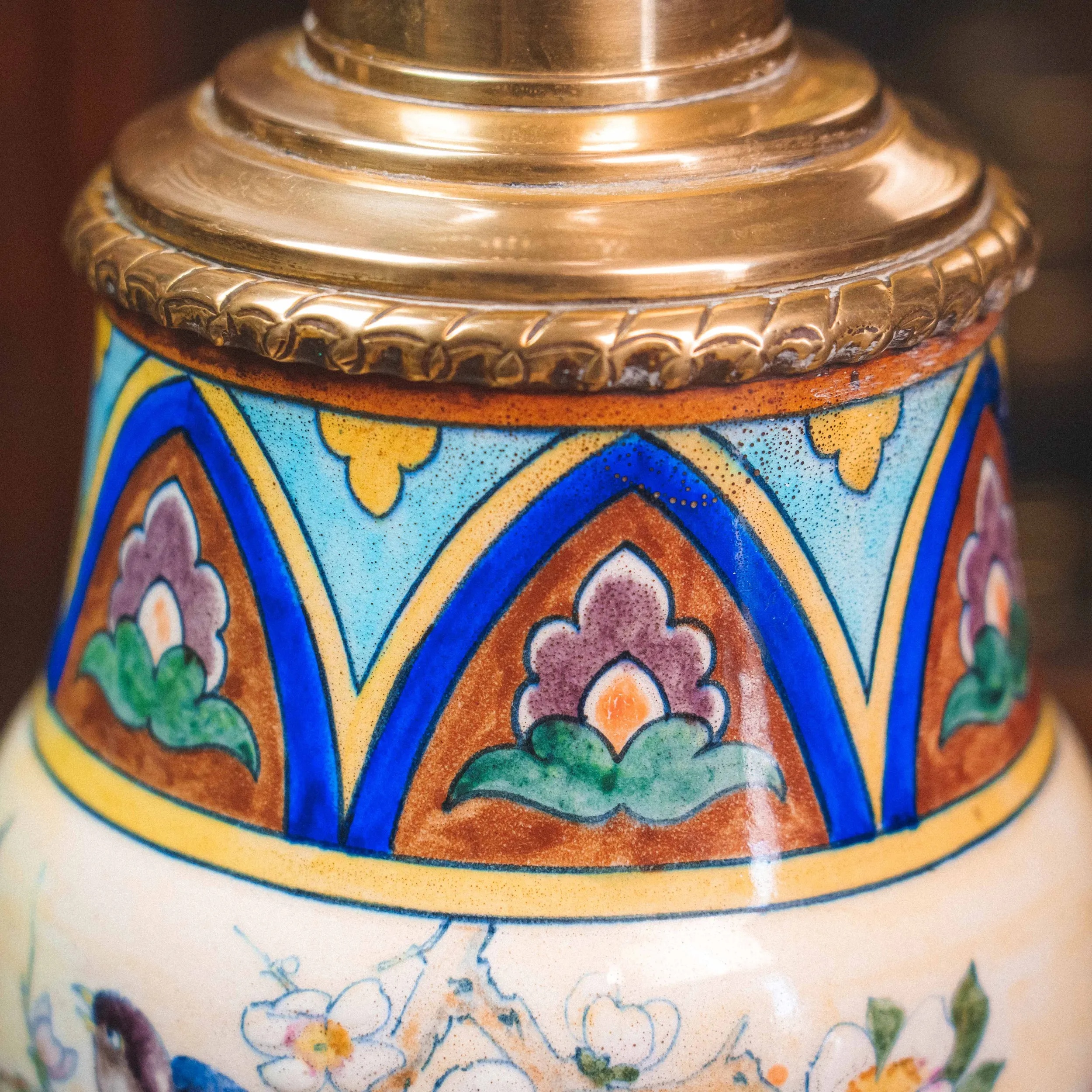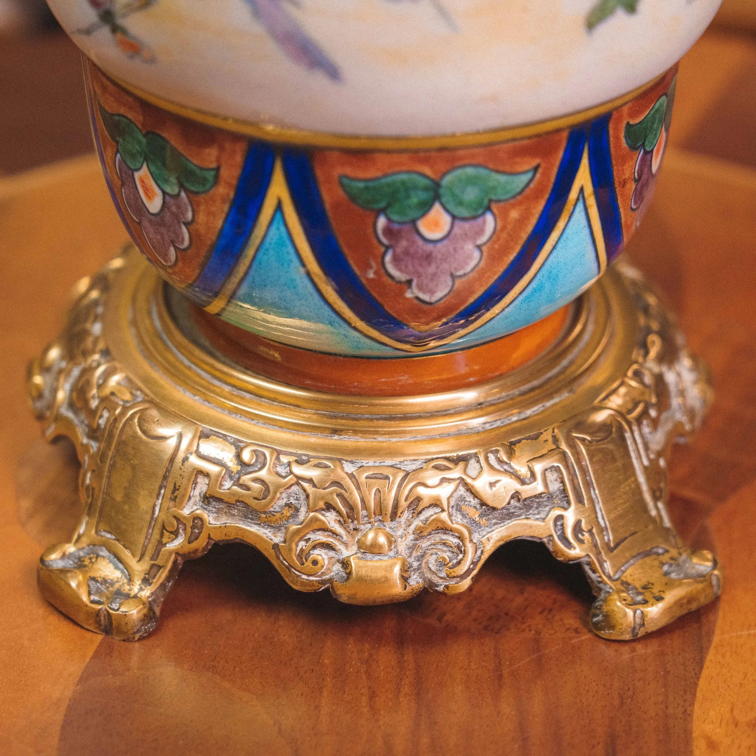 Элегантная керосиновая лампа с декоративным фарфоровым резервуаром и латунными элементами. Основание украшено яркой художественной росписью с цветочными мотивами и орнаментальными вставками в насыщенных синих и золотистых тонах.
