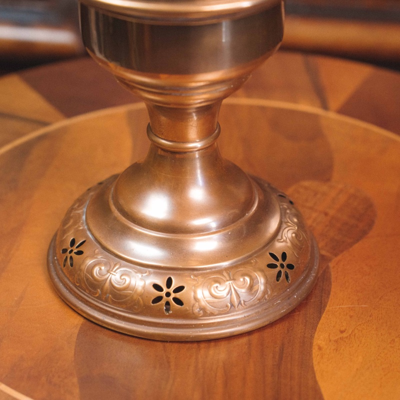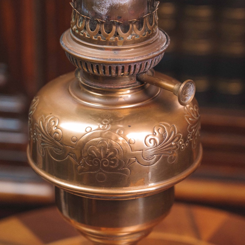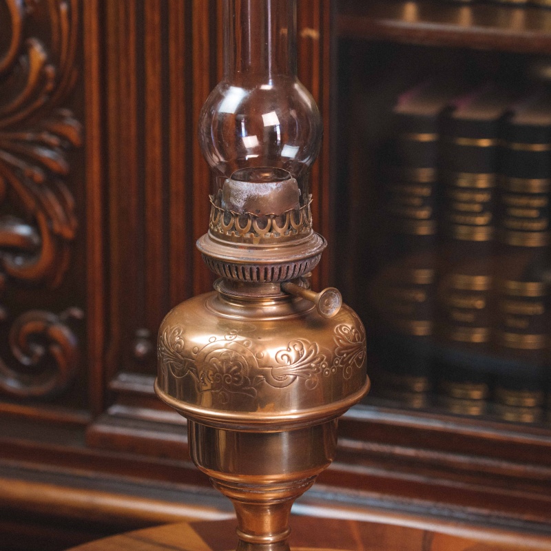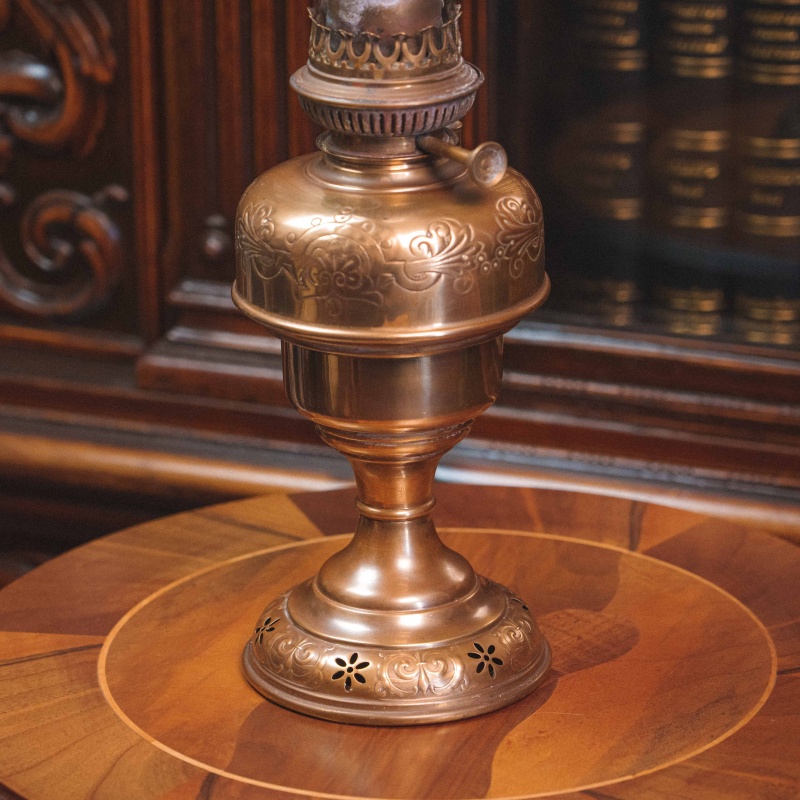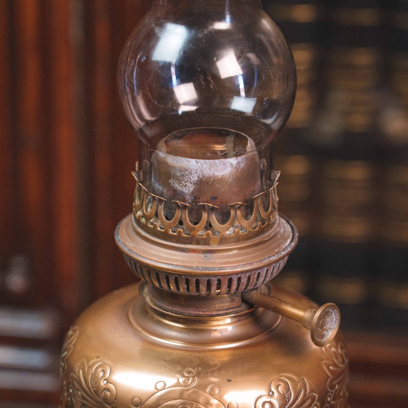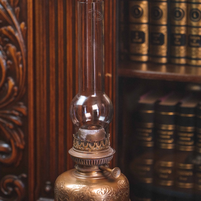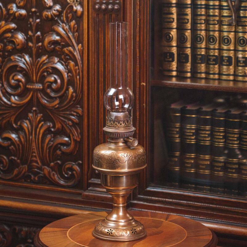 Классическая керосиновая лампа с изящным латунным корпусом и декоративной гравировкой. Тёплый оттенок металла подчёркивает винтажный характер изделия, а аккуратная стеклянная колба сохраняет традиционные пропорции исторических моделей.