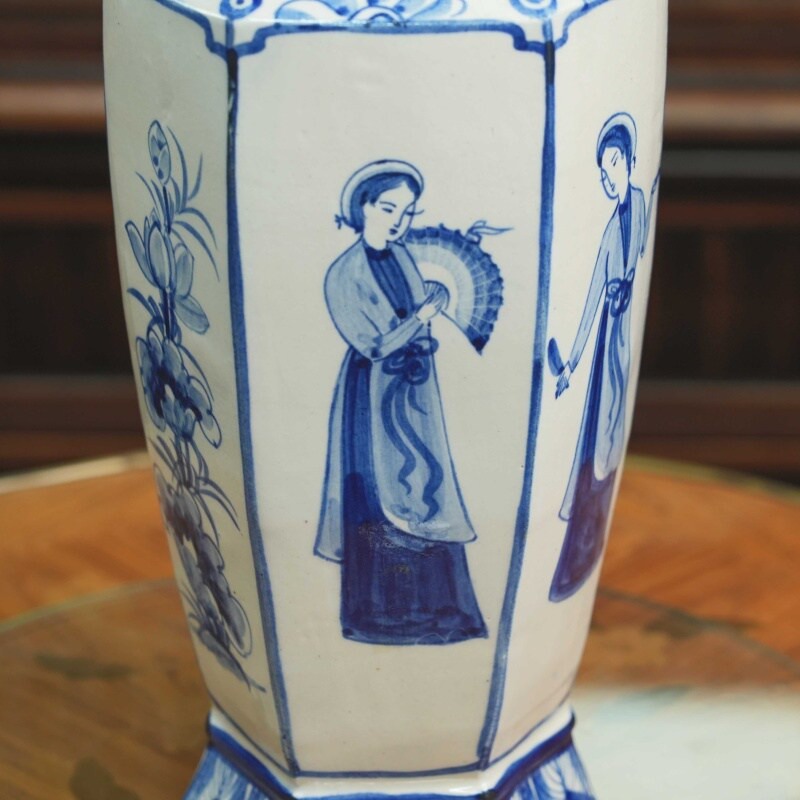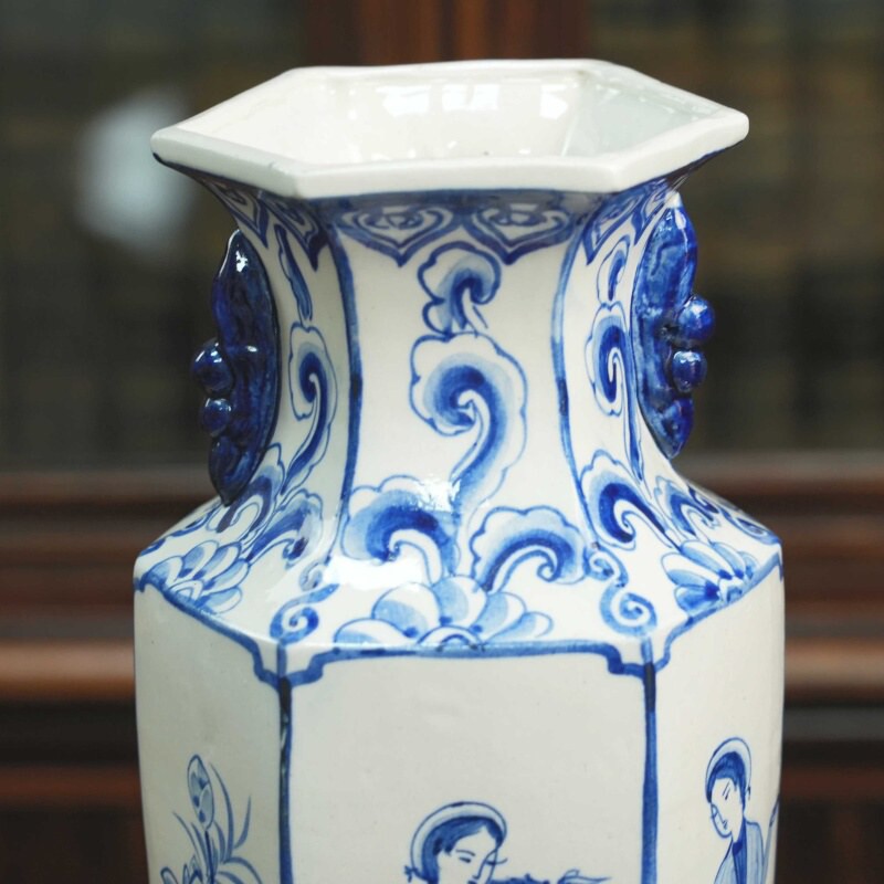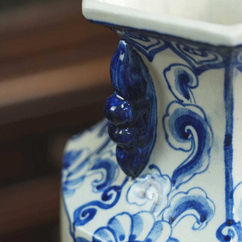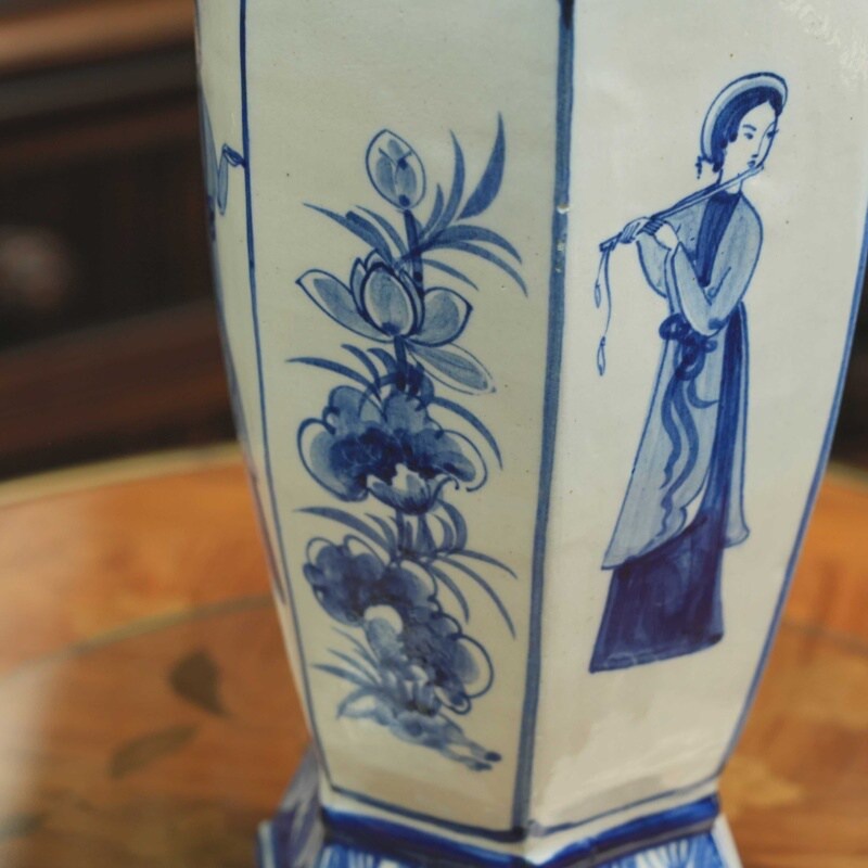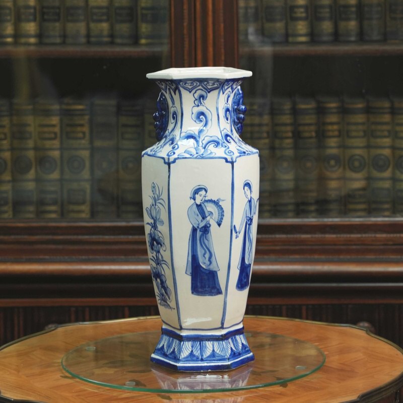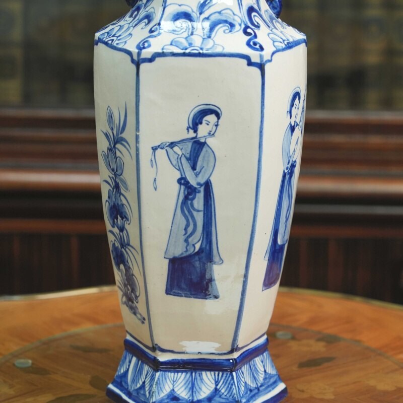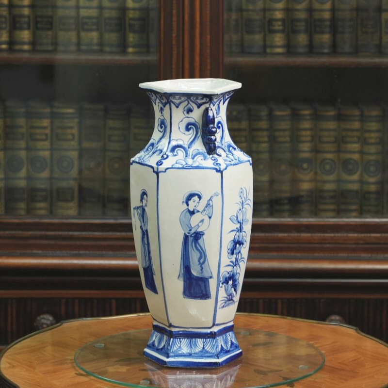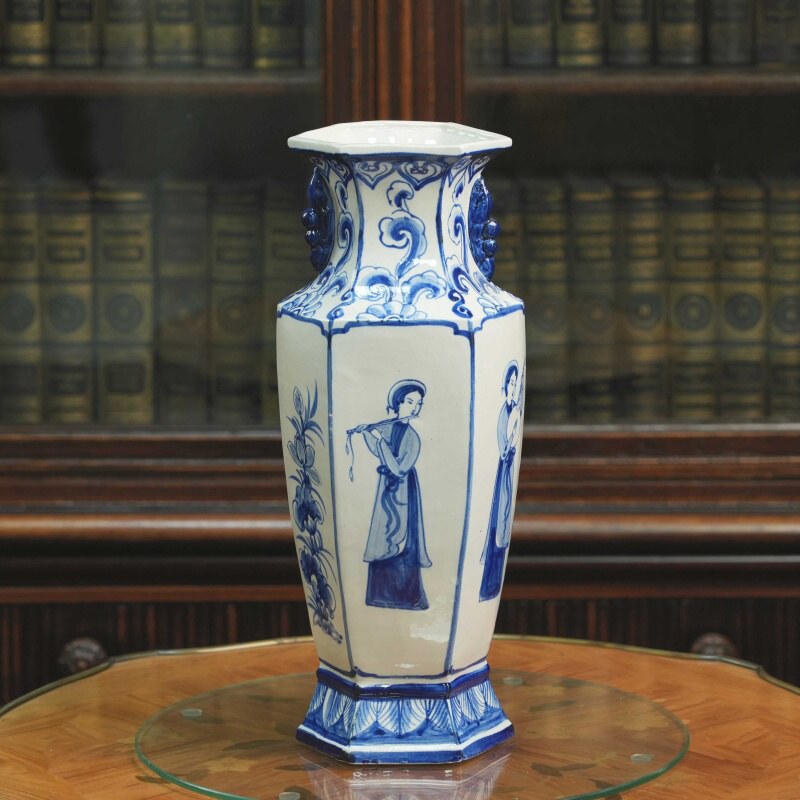 Элегантная шестигранная ваза выполнена из белого фарфора и украшена живописной росписью в традиционной гамме сине-белого фарфора. На её стенках изображены танцующие женские фигуры и девушки с музыкальными инструментами — олицетворение гармонии, изящества и радости жизни. Между ними — ветви и цветы, написанные свободными мазками кобальта, создающими лёгкое ощущение движения. Горловина оформлена орнаментом из вьющихся облаков и стилизованных растений, дополнена рельефными декоративными элементами в виде плодов или жемчужин. Основание вазы украшено фризом из лепестков, подчёркивающим устойчивость формы.