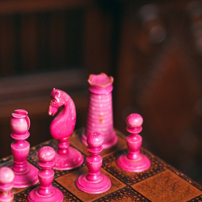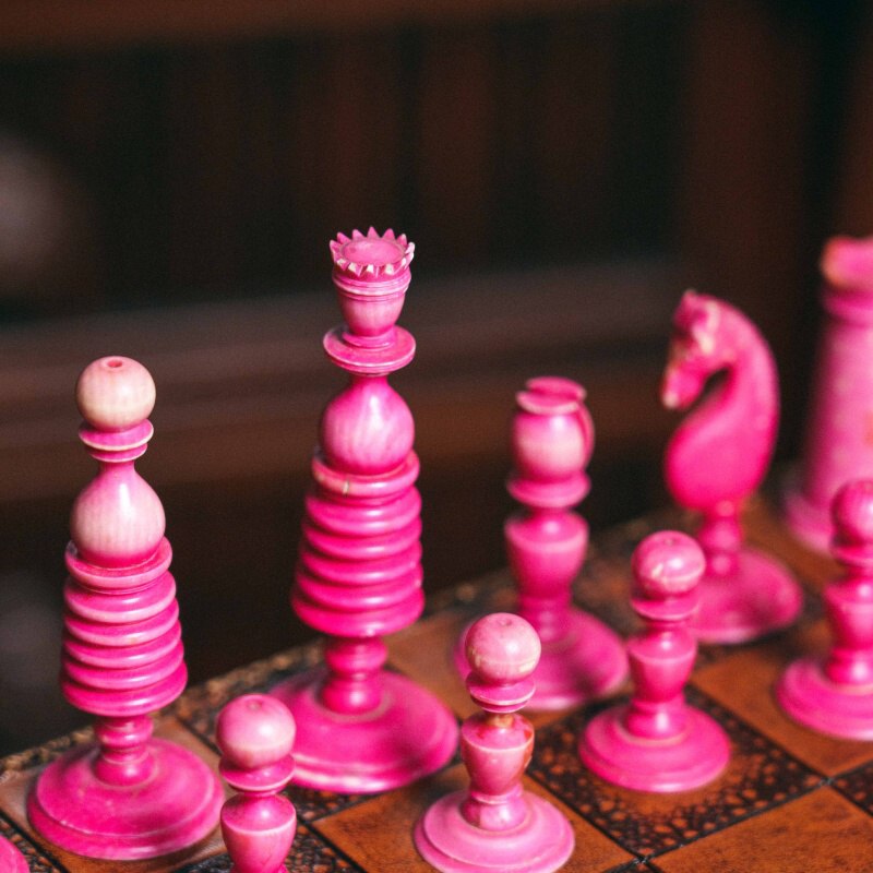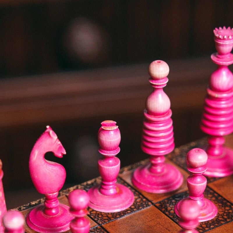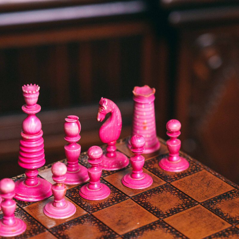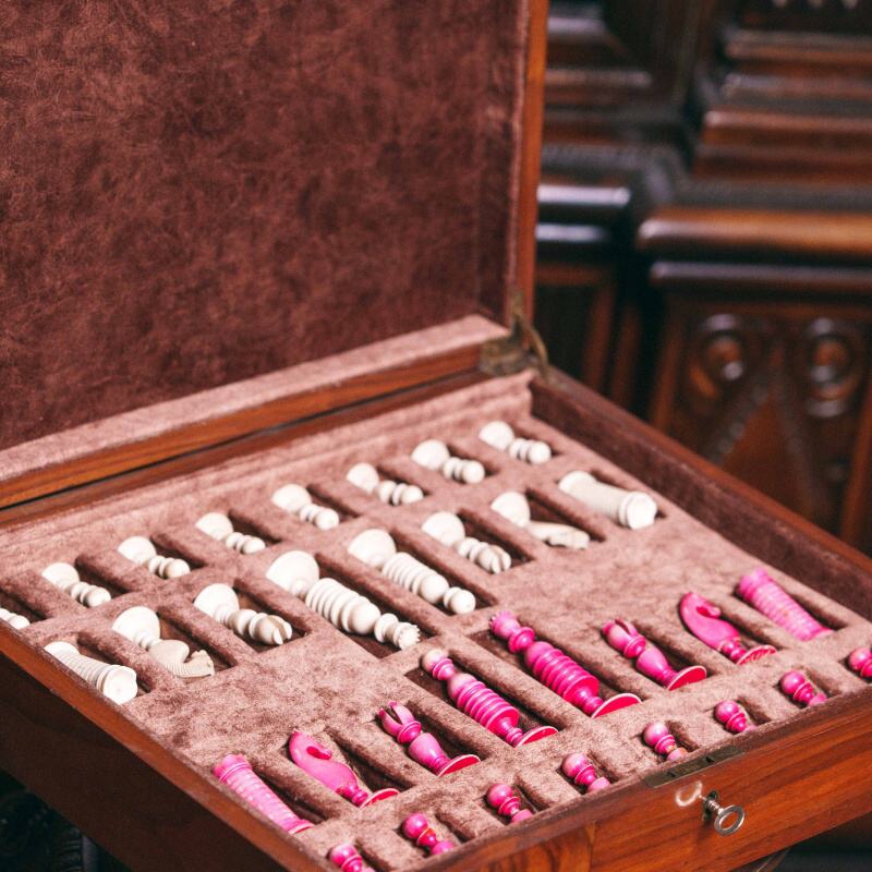 Антикварные шахматы, выполненные из слоновой кости в технике художественной ручной резьбы. Классические шахматные фигуры – это: Король, Ферзь, Ладья, Слон, Конь и Пешка. Из-за упрощённых фигур и языковых барьеров названия фигур варьировались от страны к стране. Так, современные английские названия «королева» (ферзь) и «епископ» (слон) замечены лишь в XVI веке. Поэтому до середины XIX века внешность шахматных фигур была достаточно произвольной. В предыдущие века выделилось несколько наиболее распространённых в каждой стране стилей. Так, стиль «барлейкорн» получил распространение в Англии. Фигуры из дорогих пород дерева, бивня мамонта или слоновой кости. Данные шахматы выполнены из слоновой кости, в стиле «Барлейкорн».
