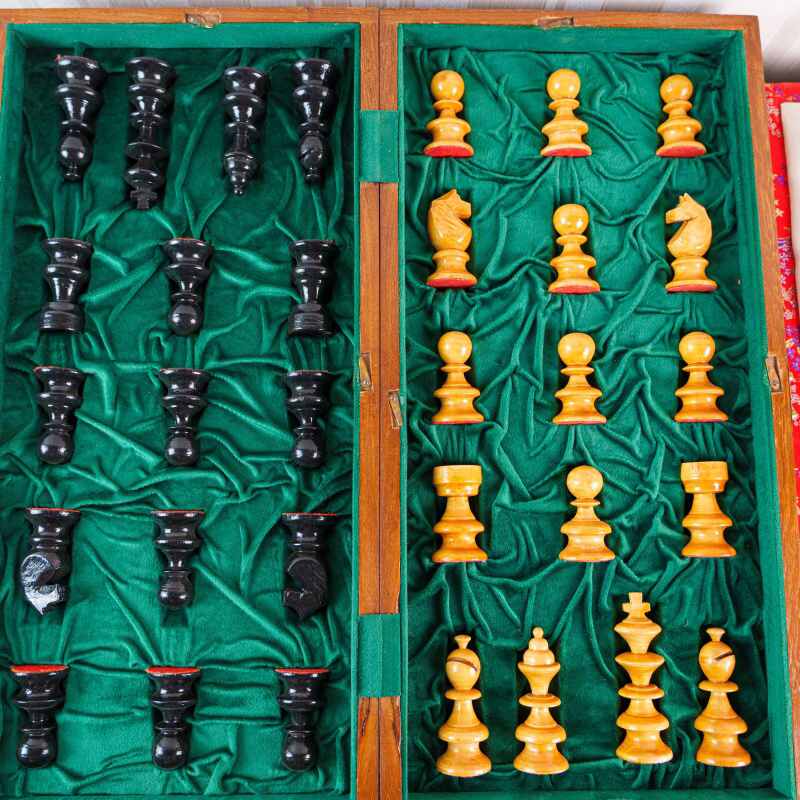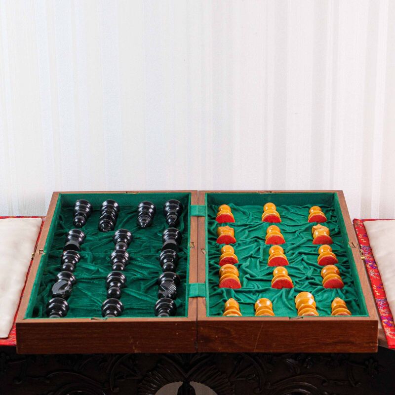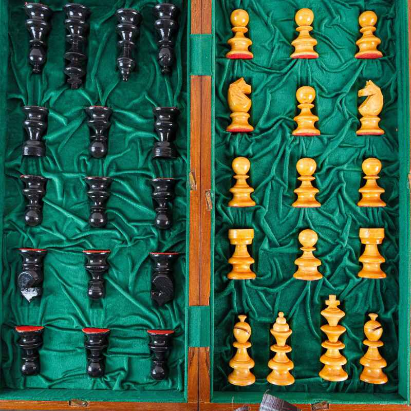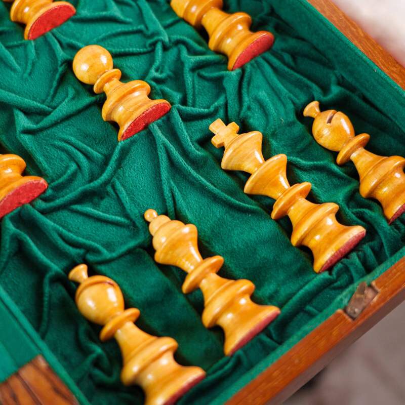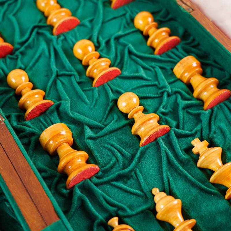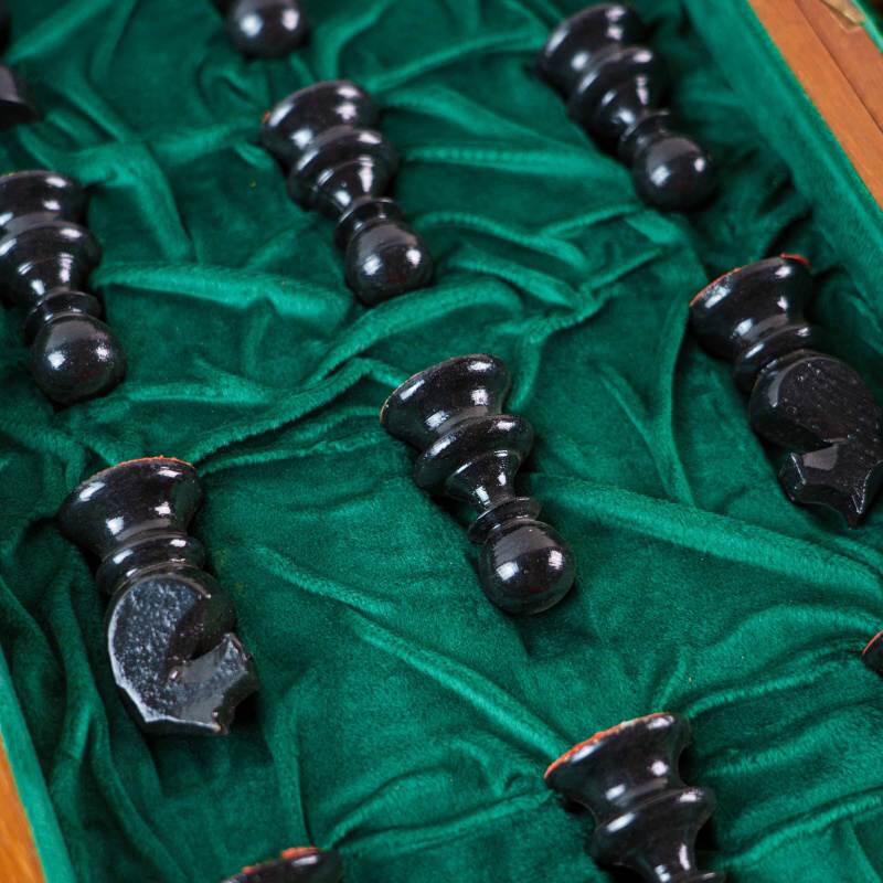 Классический деревянный шахматный набор, выполненный в стиле Стаунтон (Staunton). Фигуры аккуратно уложены в складную доску-кейс с зеленым бархатным (ложементом) покрытием, где для каждой фигуры предусмотрено отдельное место. Дизайн соответствует стандарту Staunton, который является профессиональным шахматным стандартом.