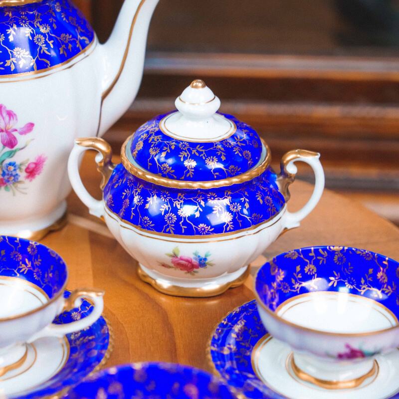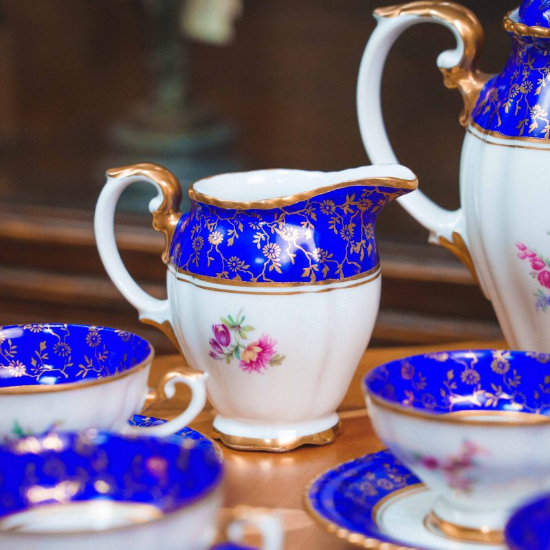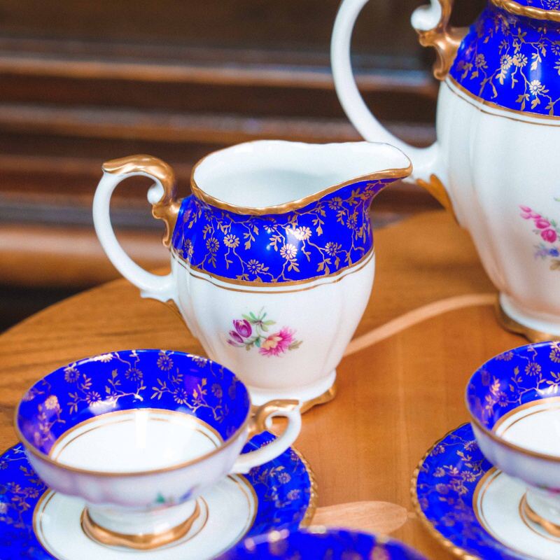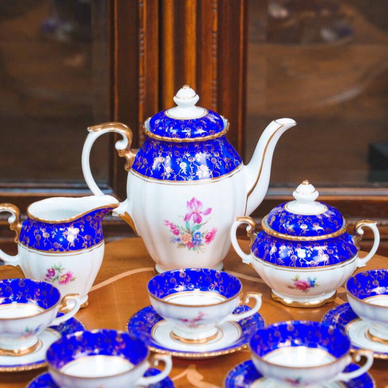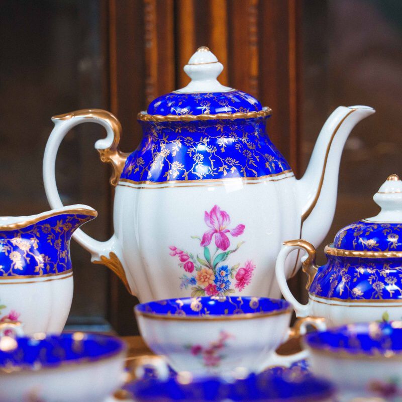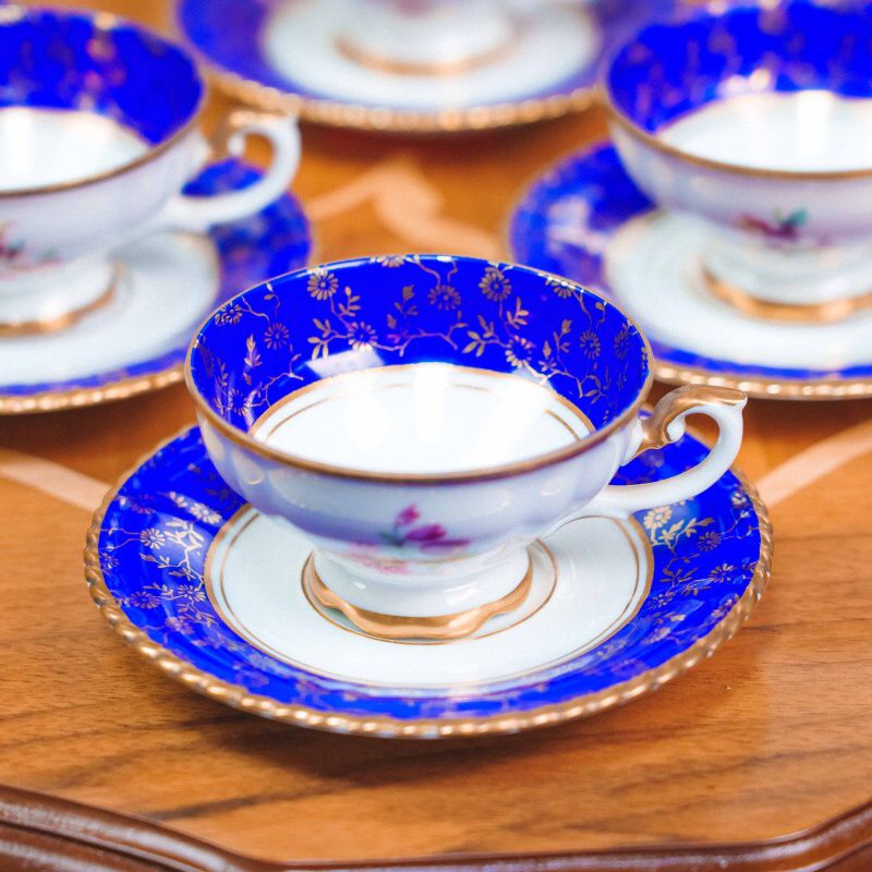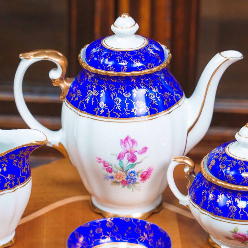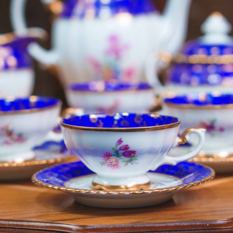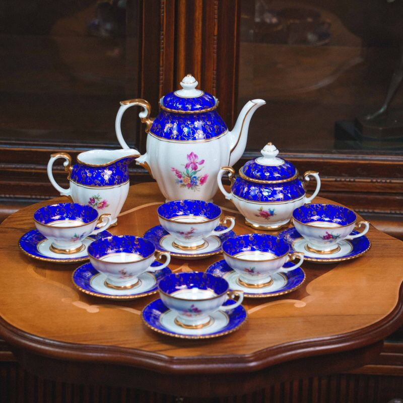 Комплект выполнен из тонкого фарфора и украшен насыщенным кобальтово-синим декором с богатым золочёным орнаментом, характерным для немецких изделий середины XX века.