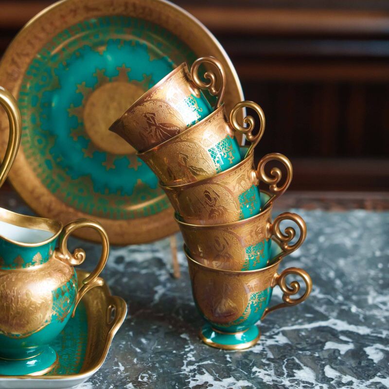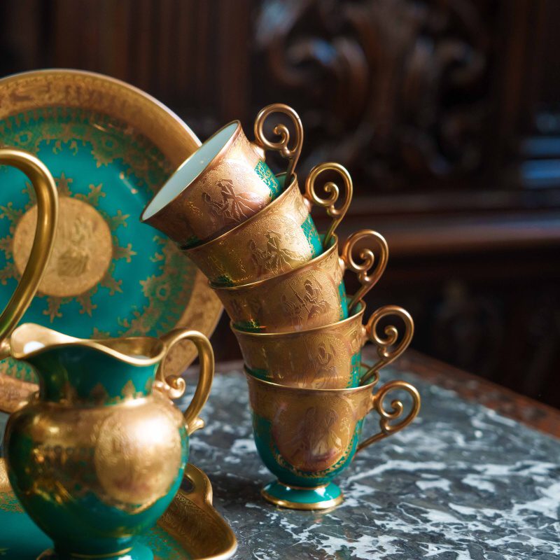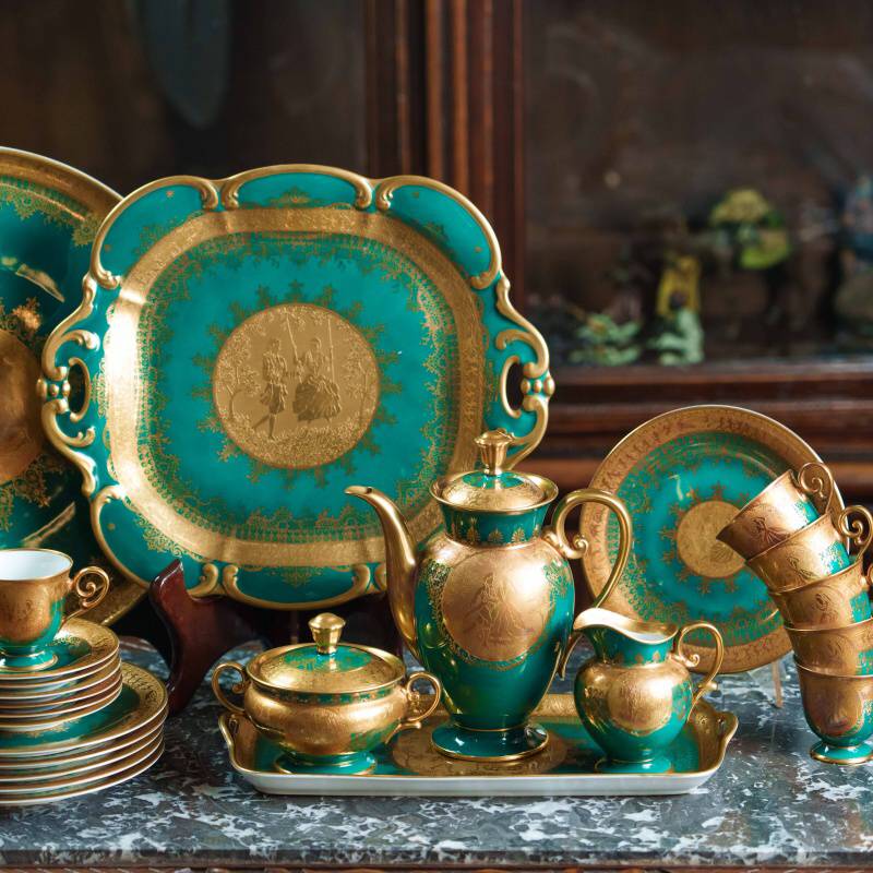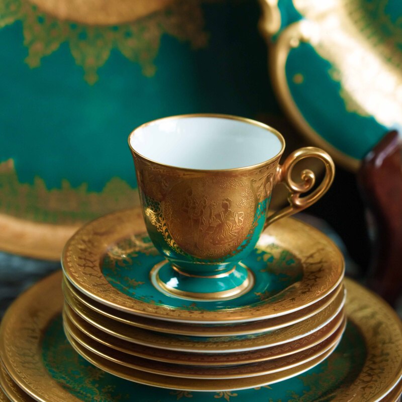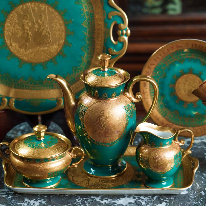 Роскошный кофейный сервиз, выполненный на знаменитой богемской мануфактуре DW Karlsbader Wertarbeit, впечатляет редким сочетанием глубокого изумрудно-бирюзового фона и плотного матово-сияющего золочения.