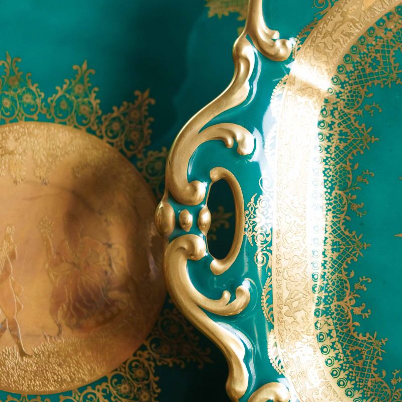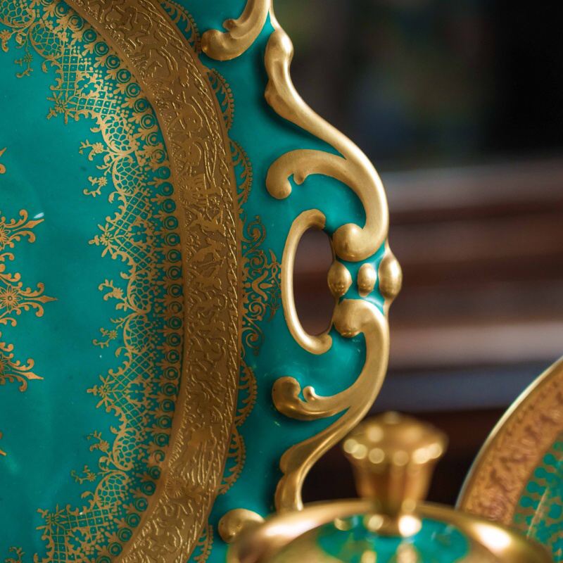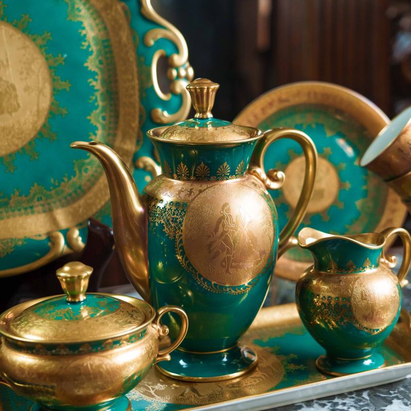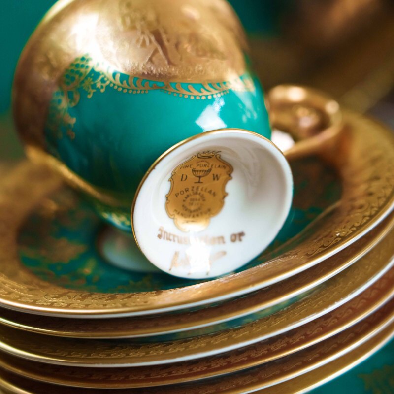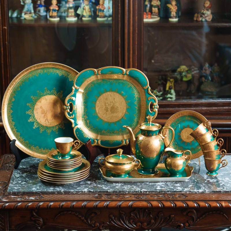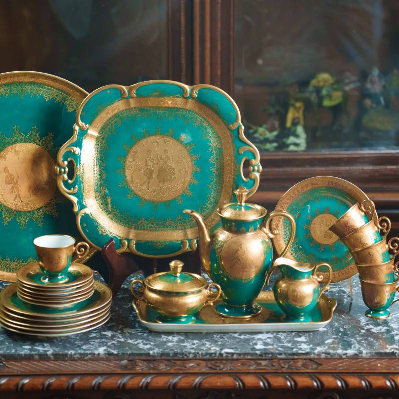 Роскошный кофейный сервиз, выполненный на знаменитой богемской мануфактуре DW Karlsbader Wertarbeit, впечатляет редким сочетанием глубокого изумрудно-бирюзового фона и плотного матово-сияющего золочения.