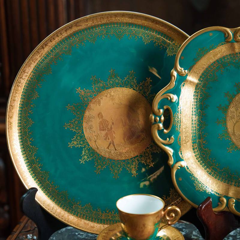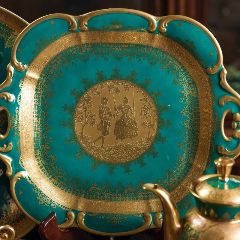 Декор построен на контрасте насыщенной цветной эмали и обильной золотой инкрустации, дополненной изящными медальонами с галантными сценами в духе XVIII века — характерным мотивом для парадного европейского фарфора.