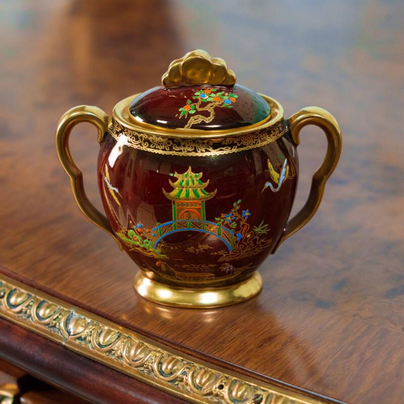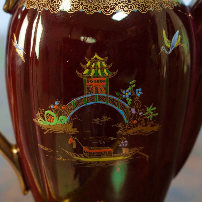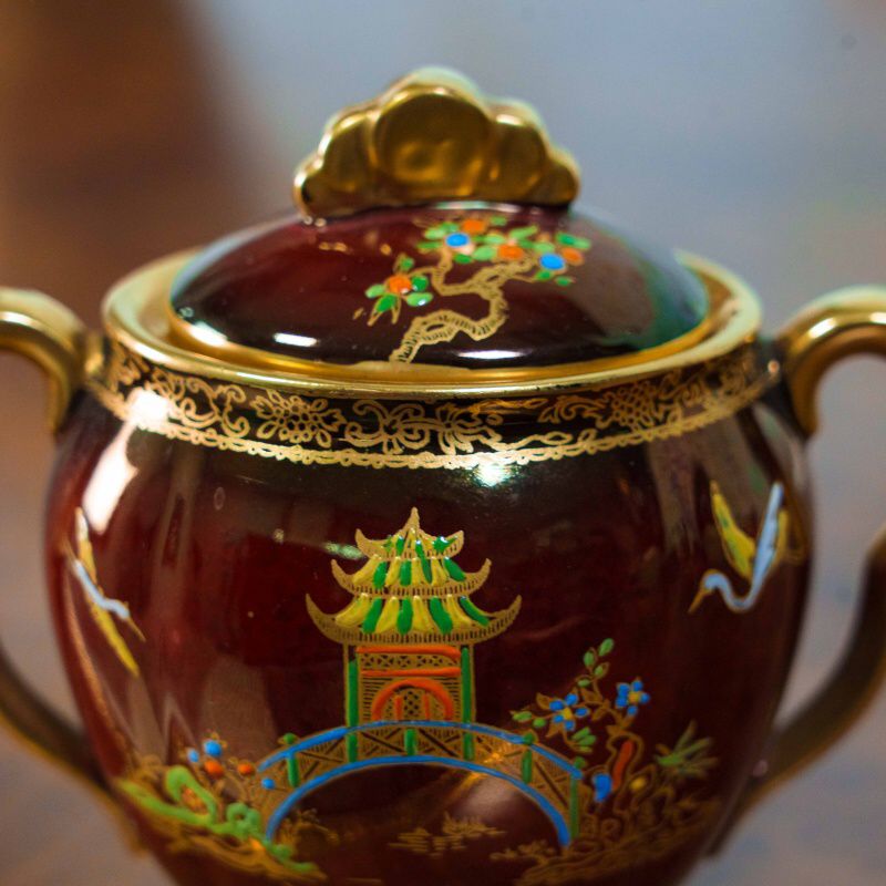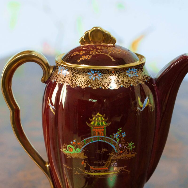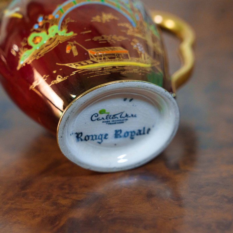 Эффектный кофейный сет из знаменитой серии Rouge Royale — одного из самых узнаваемых и коллекционно востребованных декоров Carlton Ware. Глубокий рубиново-красный фон с характерным переливом служит роскошной основой для тонкой позолоченной росписи в стиле шинуазри: пагоды, мосты, водоёмы, цветущие ветви и парящие птицы создают утончённую восточную атмосферу. Формы предметов элегантны и гармоничны: изящный кофейник с плавным силуэтом, сливочник и сахарница с удобными ручками и устойчивыми позолоченными основаниями. Декор выполнен с высокой детализацией, с использованием золота и многоцветных эмалей, что придаёт сервизу выразительную глубину и благородный блеск при освещении.