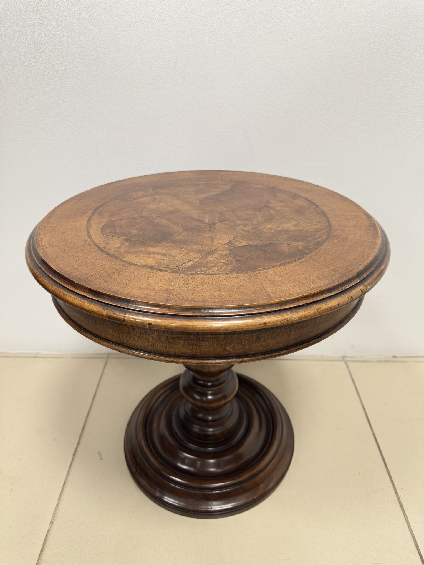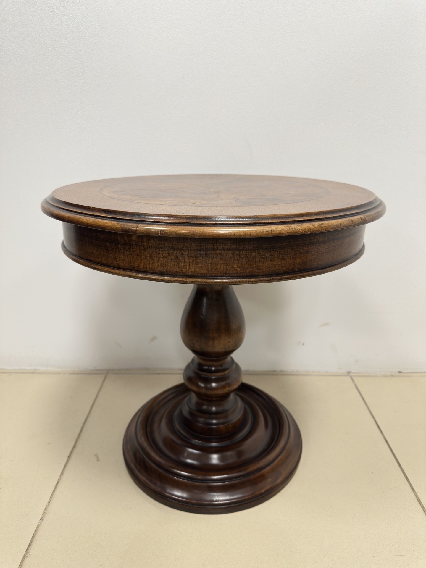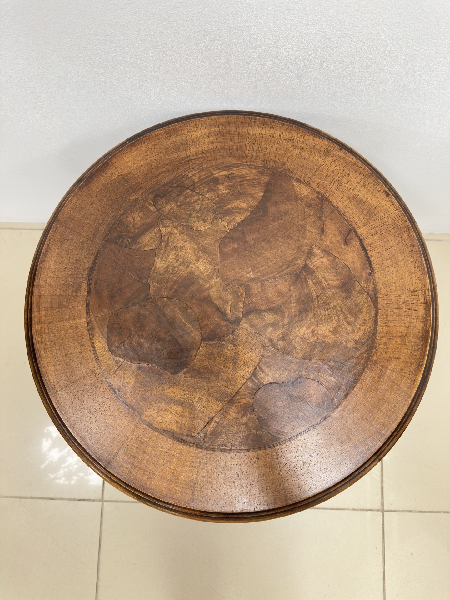 Этот столик отличается круглой столешницей с красивым узором из инкрустации, выполненной из ценных пород дерева, что придает ему уникальный и роскошный вид.