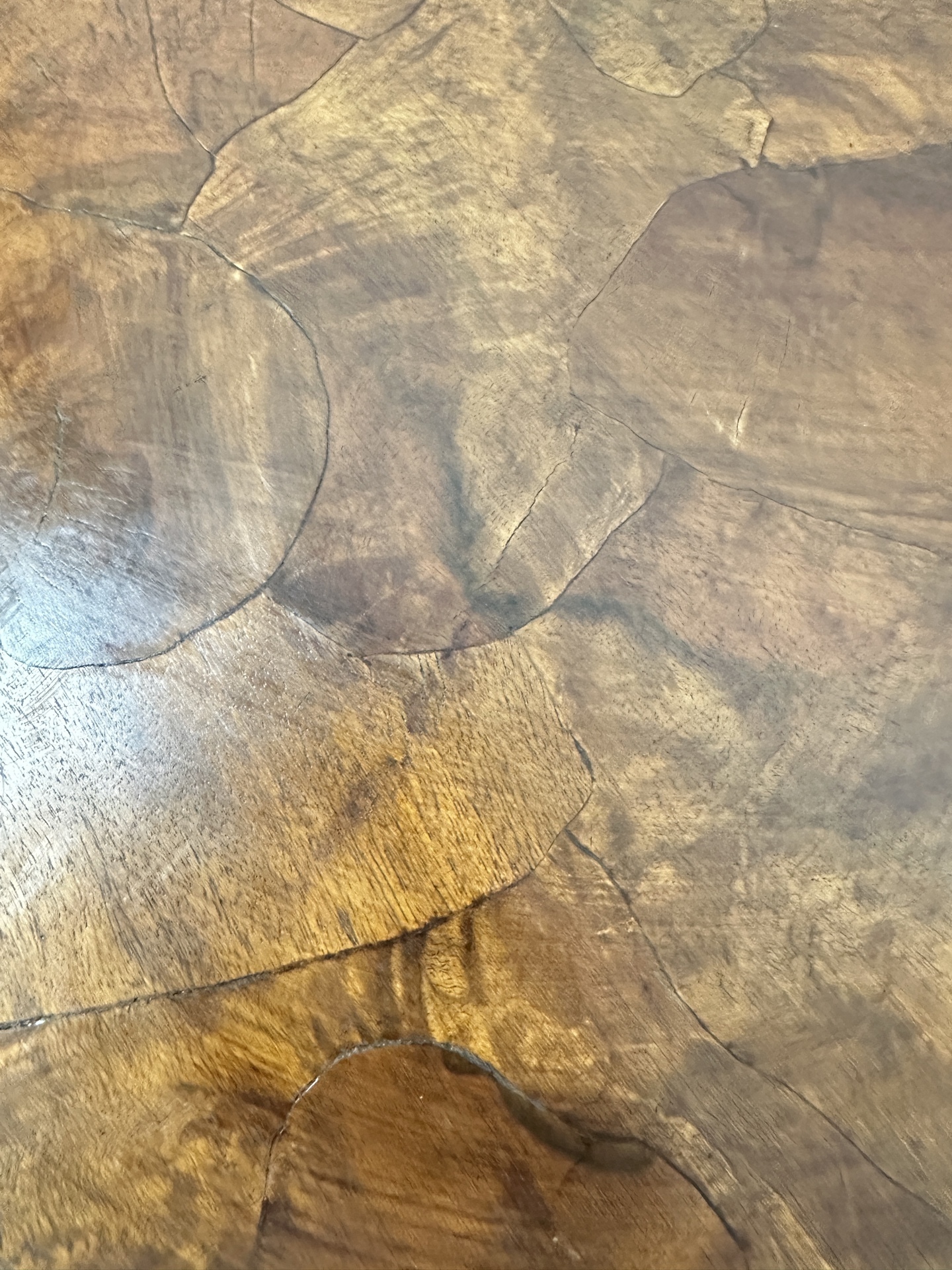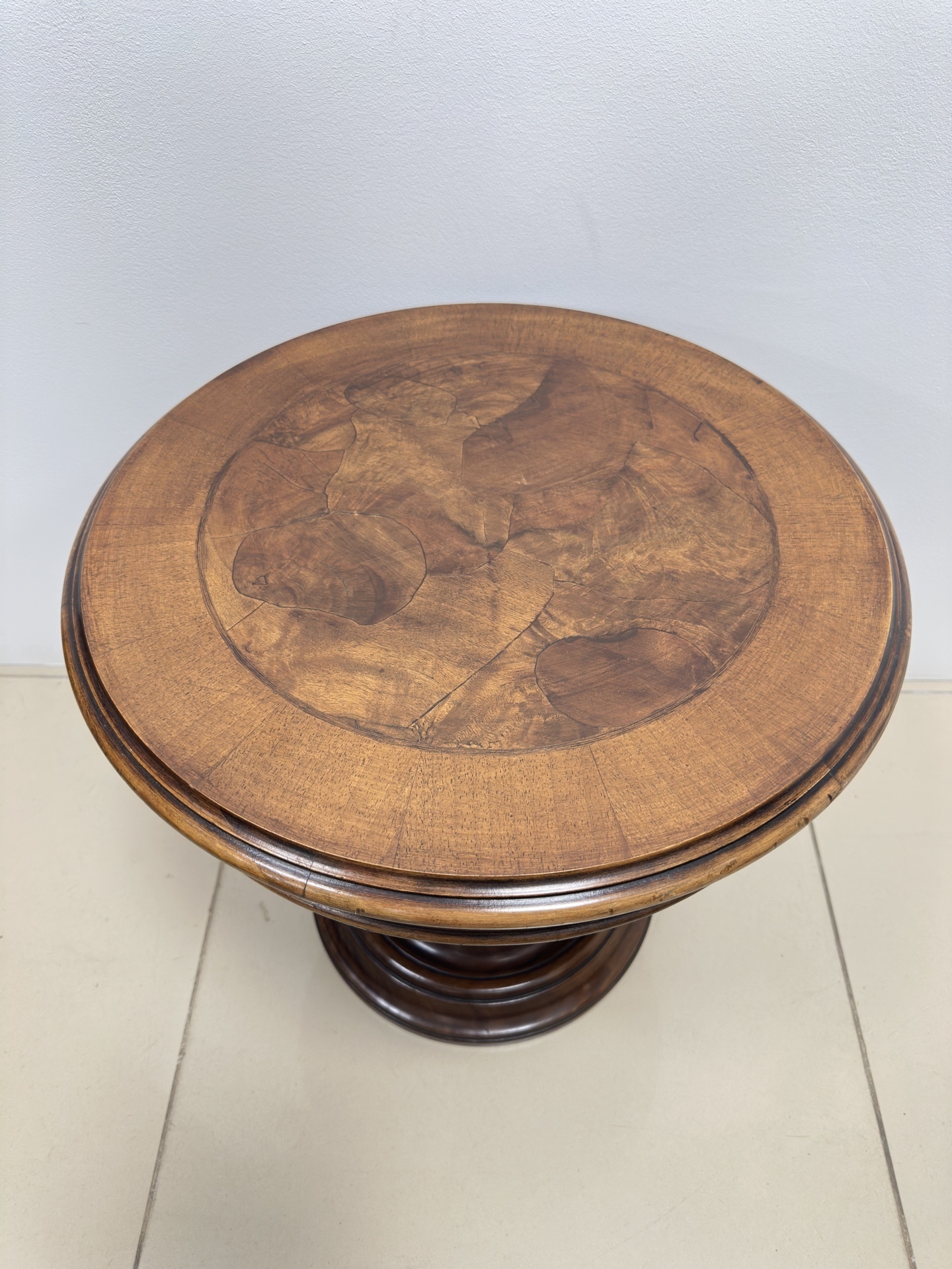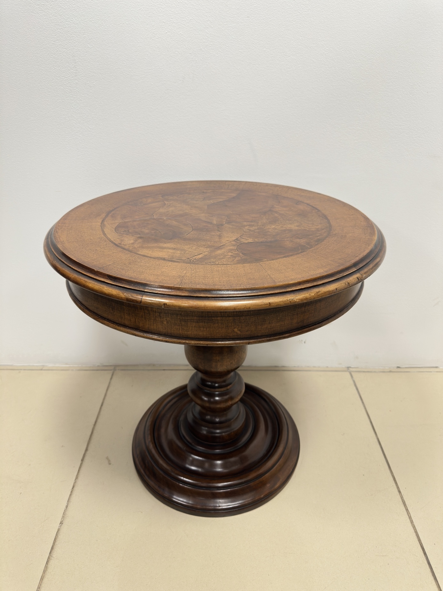 Этот столик отличается круглой столешницей с красивым узором из инкрустации, выполненной из ценных пород дерева, что придает ему уникальный и роскошный вид.