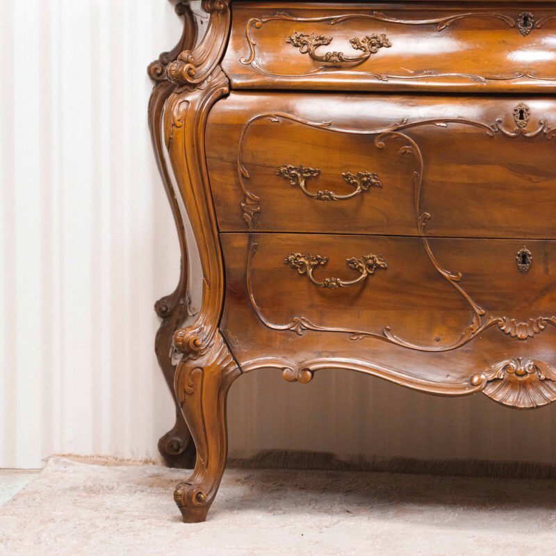 Комод стоит на четырех коротких, изогнутых ножках (кабриоль), которые продолжают общую текучую линию корпуса.