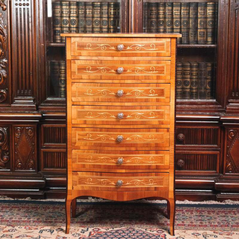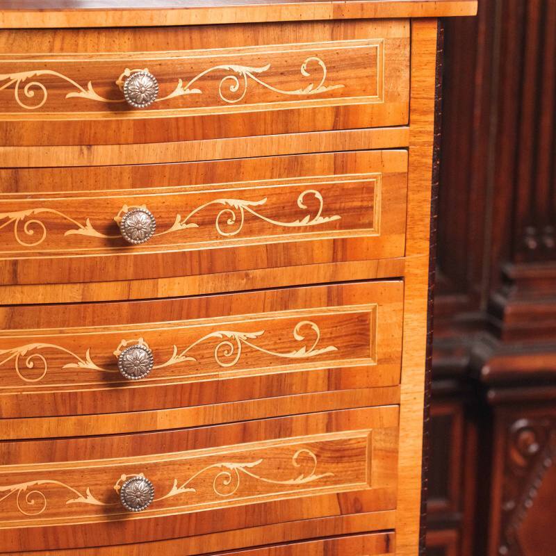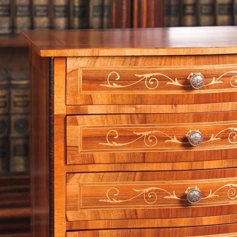 Такой комод предназначался для хранения белья, мелких предметов или бумаг и мог занимать достойное место как в гостиной, так и в спальне или кабинете.