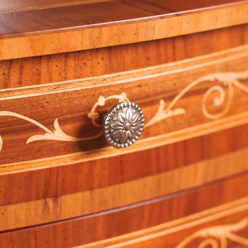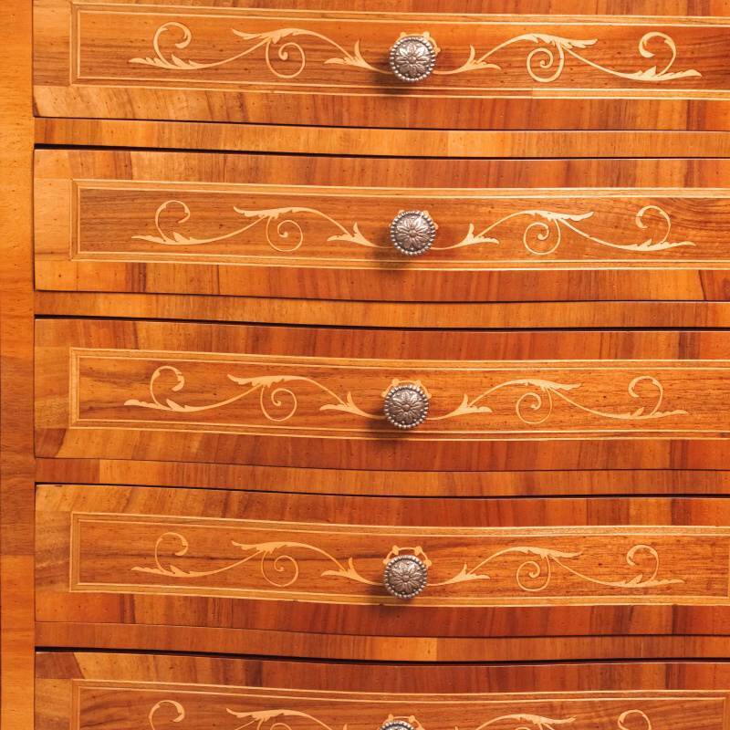 Фасады многочисленных выдвижных ящиков украшены инкрустацией — тонким растительным орнаментом, выполненным из контрастных пород шпона, что свидетельствует о высоком уровне мастерства столяра.