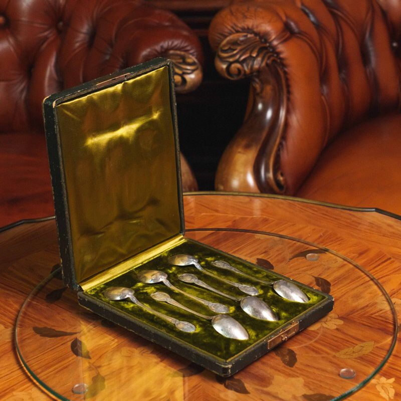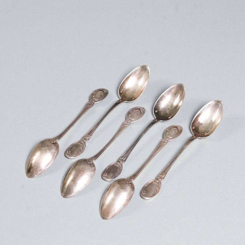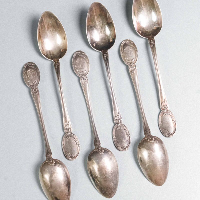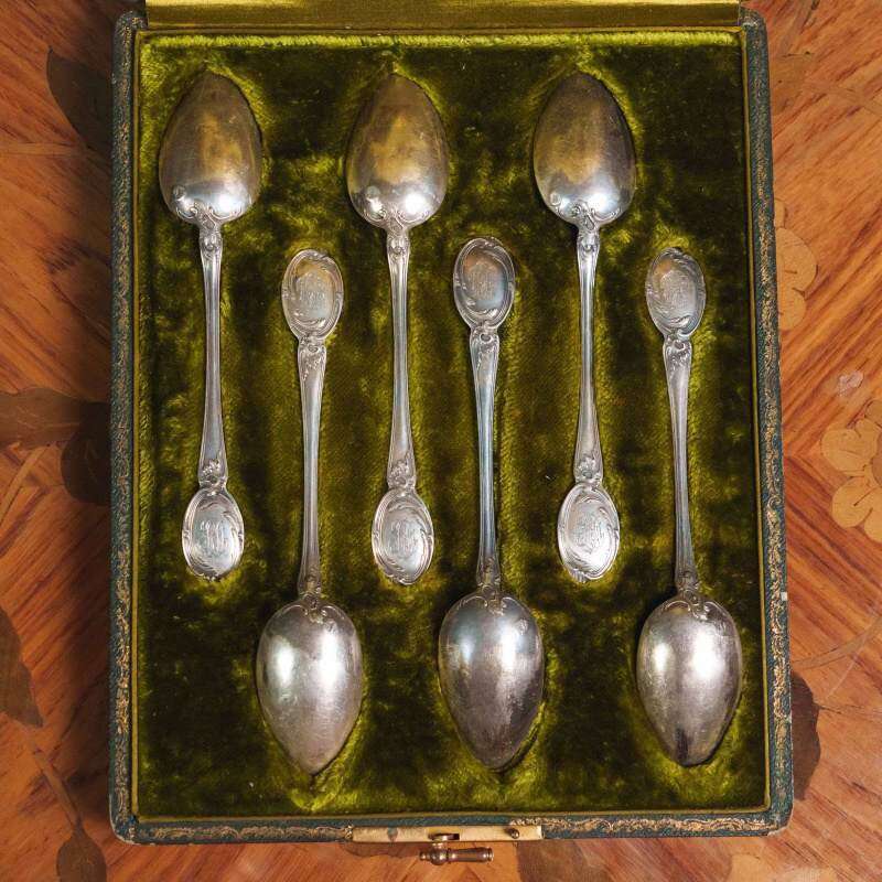 Набор включает шесть ложек, выполненных в характерном для французского неорококо стиле. Изящные ручки украшены рельефным картушем и акантовыми завитками, на верхней части овального щитка — монограмма, выгравированная в витиеватом шрифте. Мягкий блеск старинного серебра и утончённость орнамента подчёркивают элегантность эпохи Белль Эпок. Ложки представлены в оригинальном футляре с бархатной подкладкой, что указывает на их принадлежность к сервировочным наборам высокого класса.