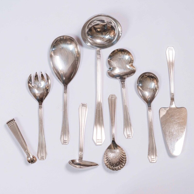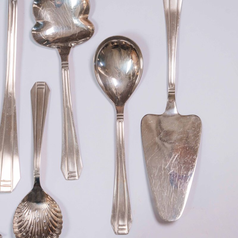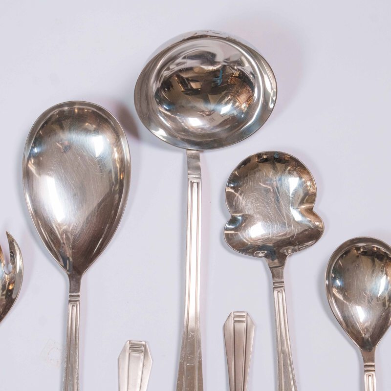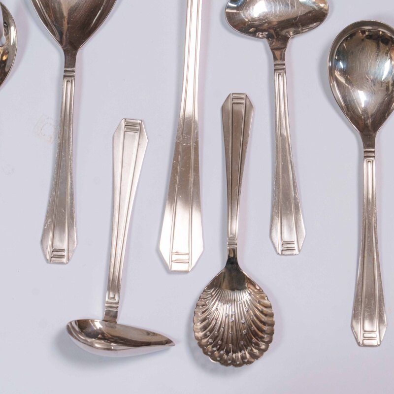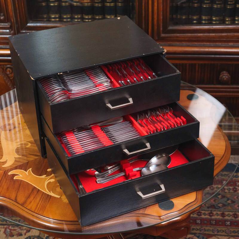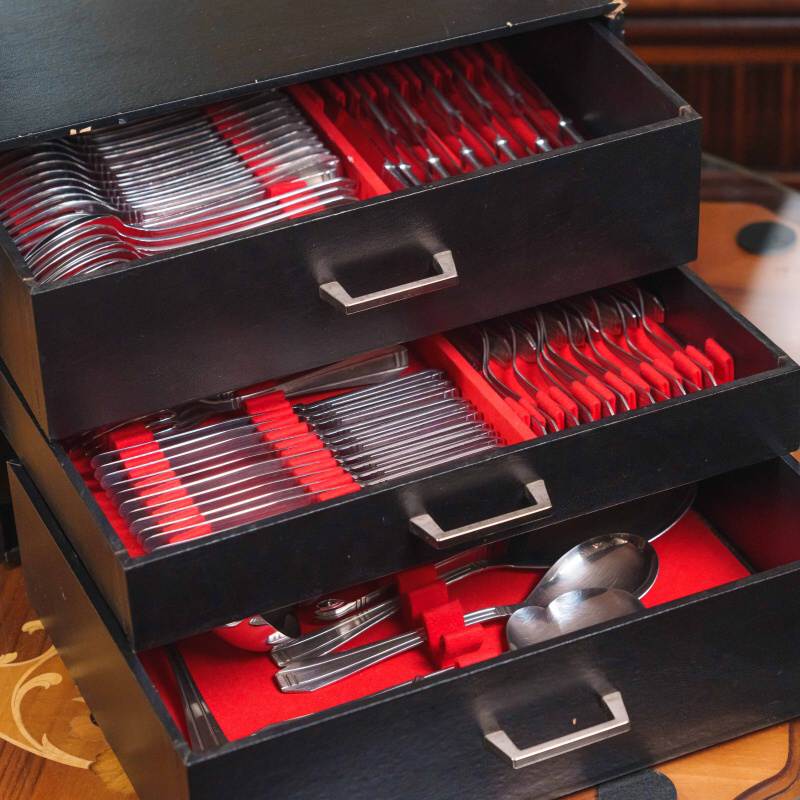 Комплект столовых приборов бельгийской марки Eternum, выполненный в лаконичной и элегантной стилистике. Набор включает 90 предметов: 12 столовых ложек, 12 столовых вилок, 12 столовых ножей, 11 рыбных вилок, 12 рыбных ножей, 11 чайных ложек, 11 десертных вилок и 9 предметов для сервировки блюд (щипцы для сахара, салатная вилка, сервировочная ложка, половник, соусная ложка, небольшая сервировочная ложка, сервировочная ложка для оливок, лопатка для торта) отличающиеся единым художественным решением. Дизайн построен на строгой геометрии форм: вытянутые пропорции, плавные переходы и сдержанный рельеф на рукоятях создают ощущение порядка и визуальной гармонии. Отсутствие избыточного декора подчеркивает функциональность и делает комплект универсальным — он одинаково органично вписывается как в классическую, так и в современную сервировку стола.