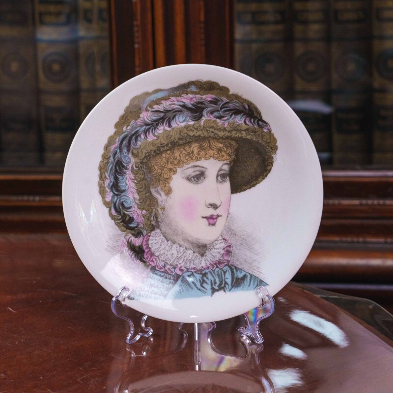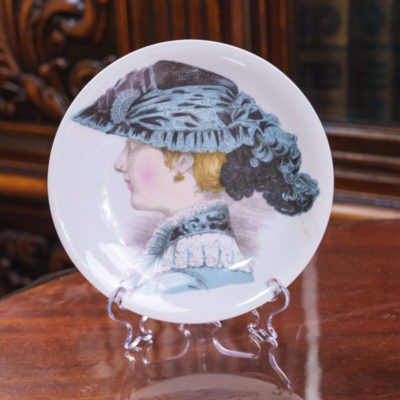 Элегантный комплект из шести декоративных тарелок, созданных на мануфактуре Porcelaine de Paris, представляет собой изысканный пример французского декоративного искусства второй половины XX века. На каждой тарелке изображена женская фигура в изящной шляпке, олицетворяющей моду и аристократическую утончённость. Каждый образ неповторим: лёгкая грация силуэта, плавные линии лиц и богатое разнообразие головных уборов создают поэтический ряд, где каждая тарелка становится отдельной миниатюрной картиной. Миниатюрные портреты, выполненные в мягкой цветовой гамме, тщательно проработаны и передают романтическое настроение и внимание к деталям.