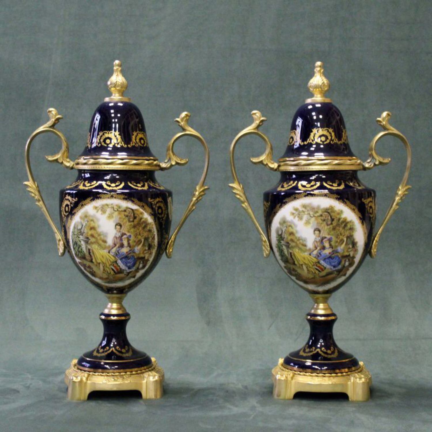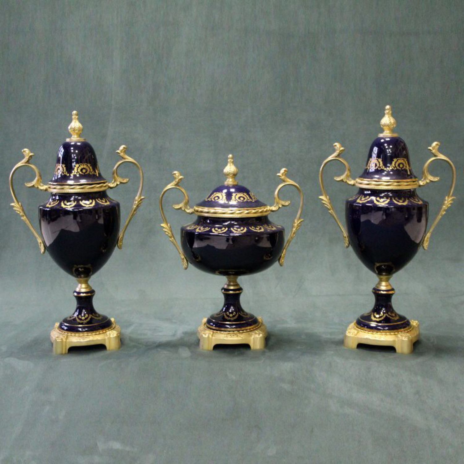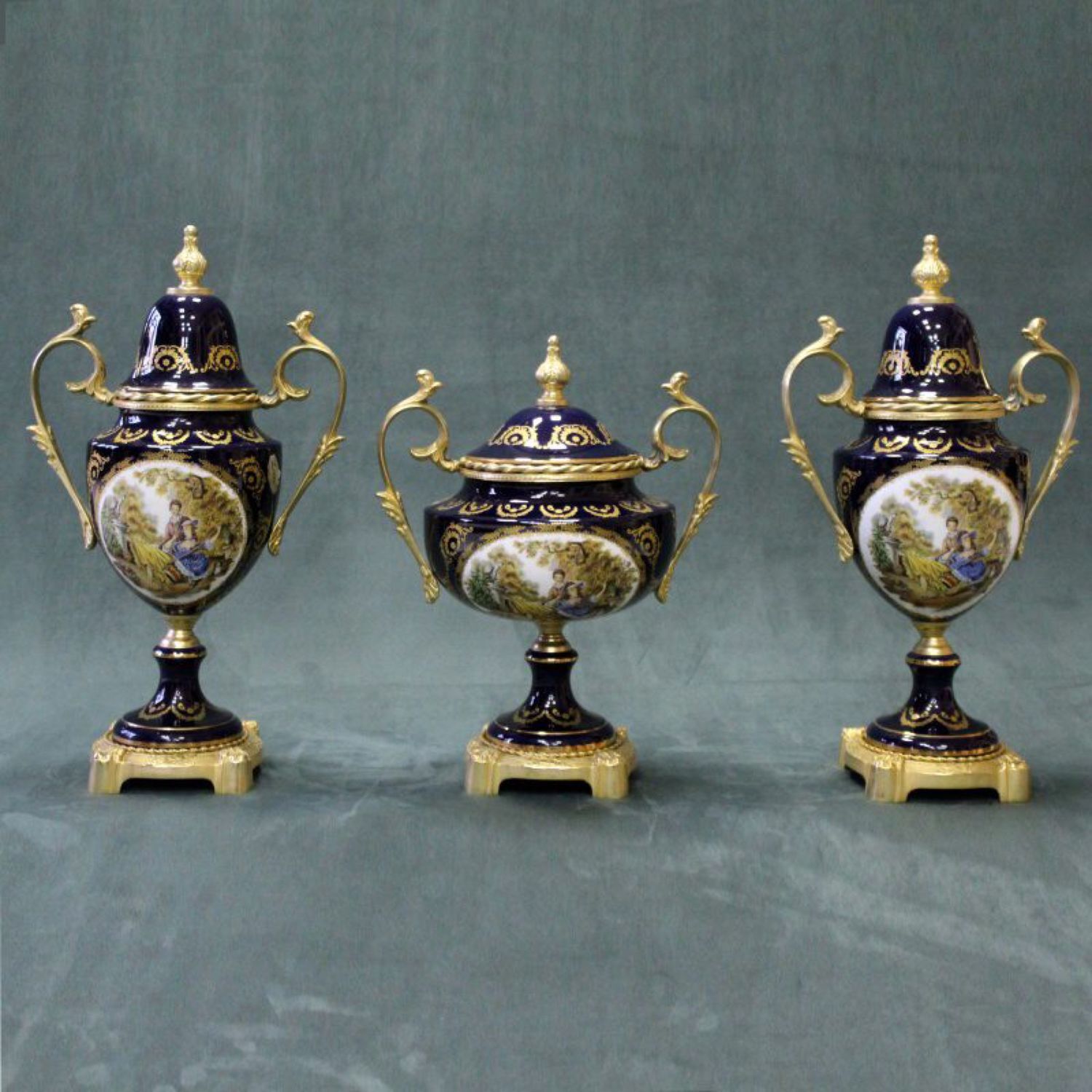 Комплект ваз в дворцовом стиле. изготовленный на Лиможской фарфоровой мануфактуре. Декоративное оформление гарнитура представлено живописными композициями в окружении золотой рамки. Также гарнитур дополнен бронзовыми элементами.